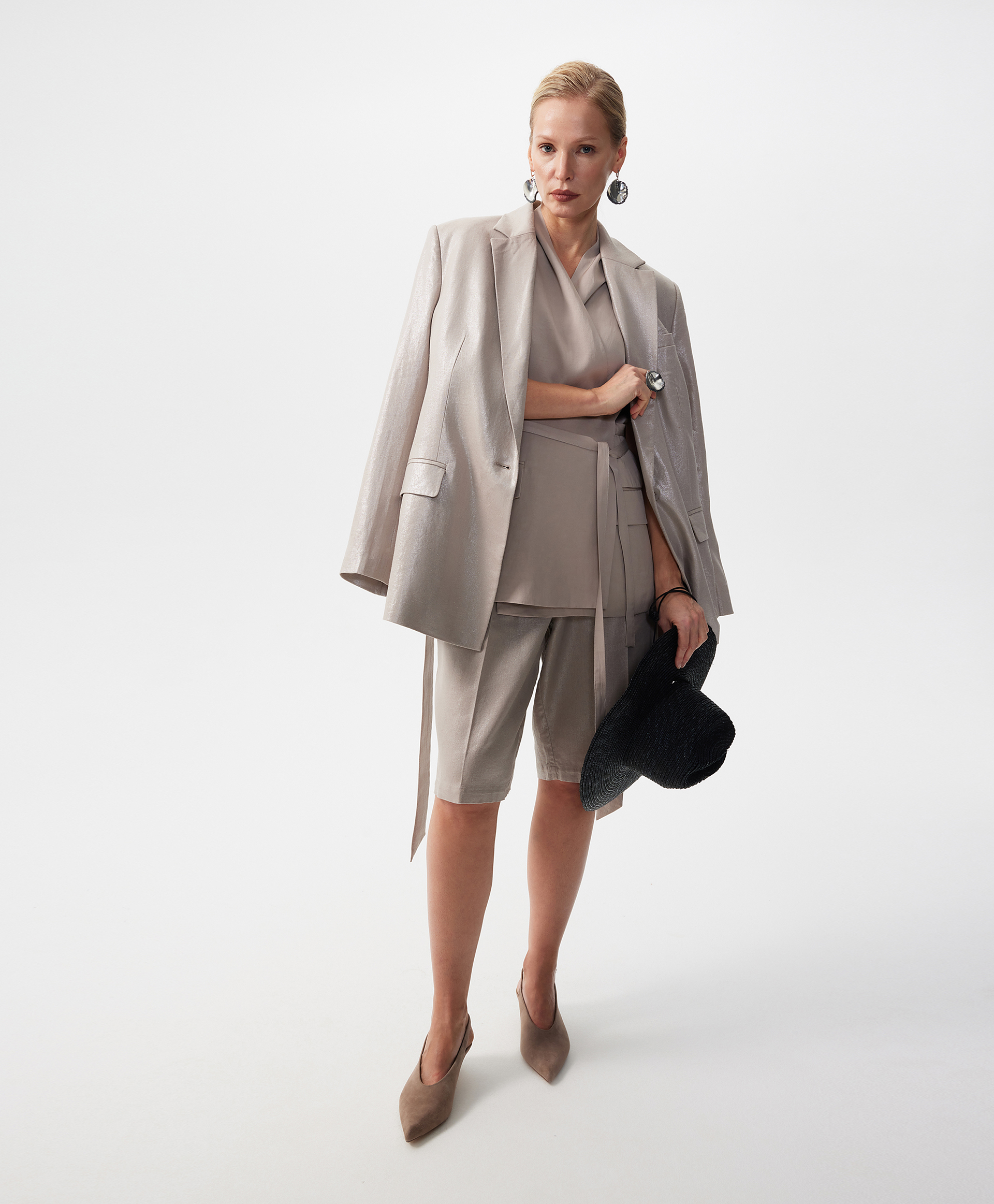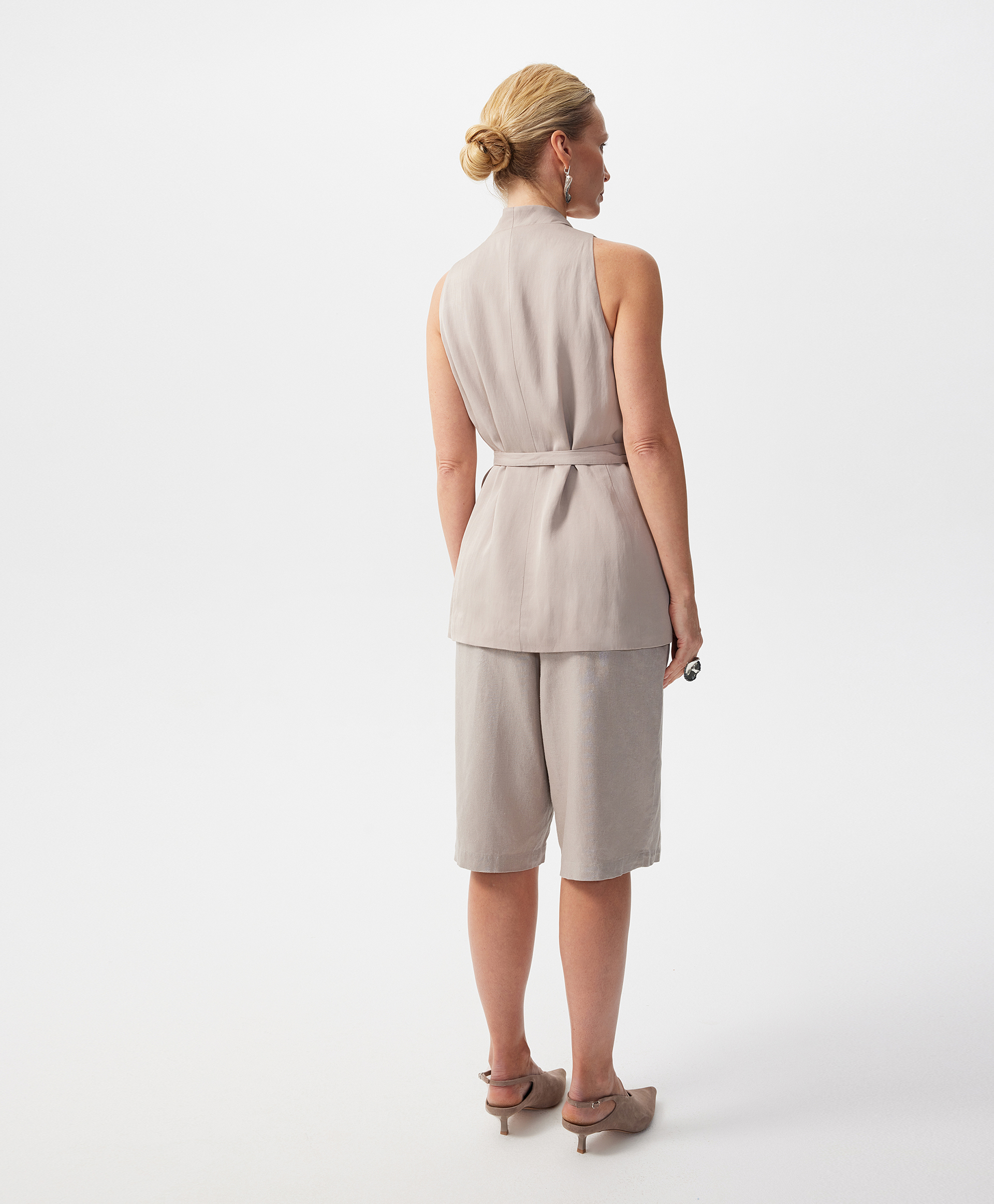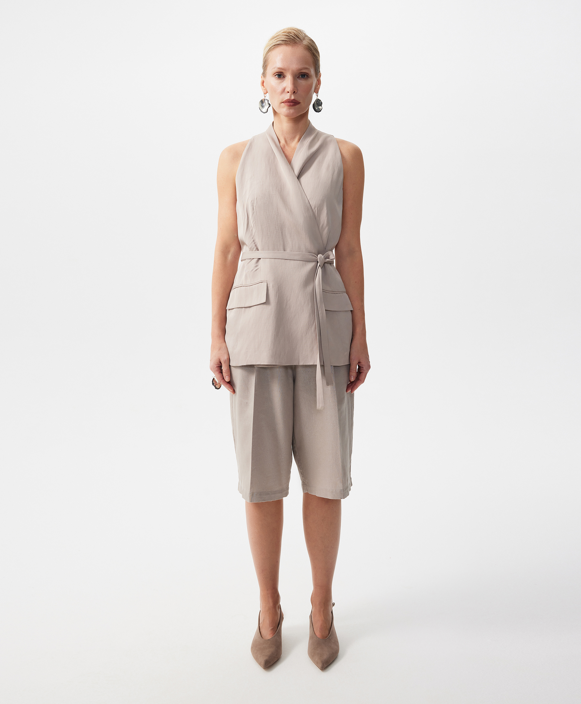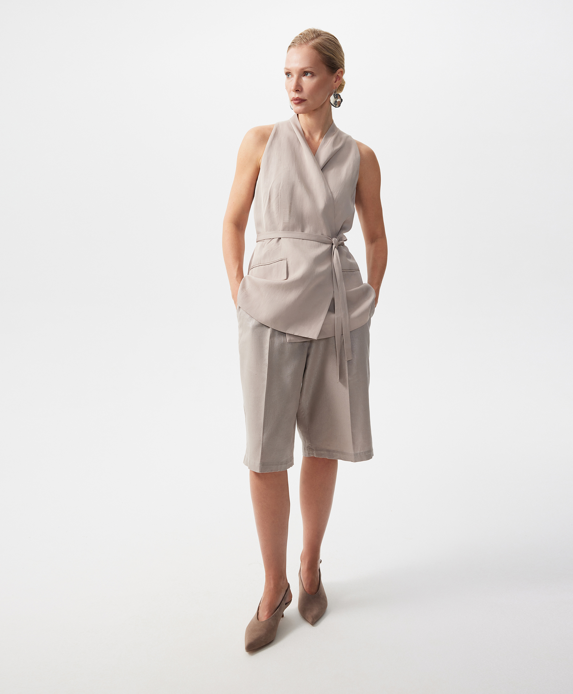 Текстильный жилет с запахом, - это шик минималистичных решений, в которых всегда есть интригующая недосказанность… Жилет прямой свободной формы выполнен из шелковистой вискозной ткани с высоким содержанием льна, образующего еле заметную узелковую структуру. Сложный дымчатый оттенок пыльной розы, ассоциирующийся с мягкостью, уютом, покоем, поддерживает модный тренд на экологичные цвета и натуральные материалы. Форма модели с американской проймой, оставляющей плечи открытыми, придает жилету утонченную элегантность. Американская пройма, популярность которой началась с триумфа Мерилин Монро и ее знаменитого развевающегося белого платья, считается одним из самых красивых элементов в женской одежде. Она выгодно подчеркивает зону плеч и рук, делает образ притягательным. Жилет имеет шелковистую вискозную подкладку, завязывается с помощью длинных лент из основного материала на спинке или сбоку. Прорезные карманы с клапанами придают жилету завершенный вид, а также создают удобство в эксплуатации вещи.