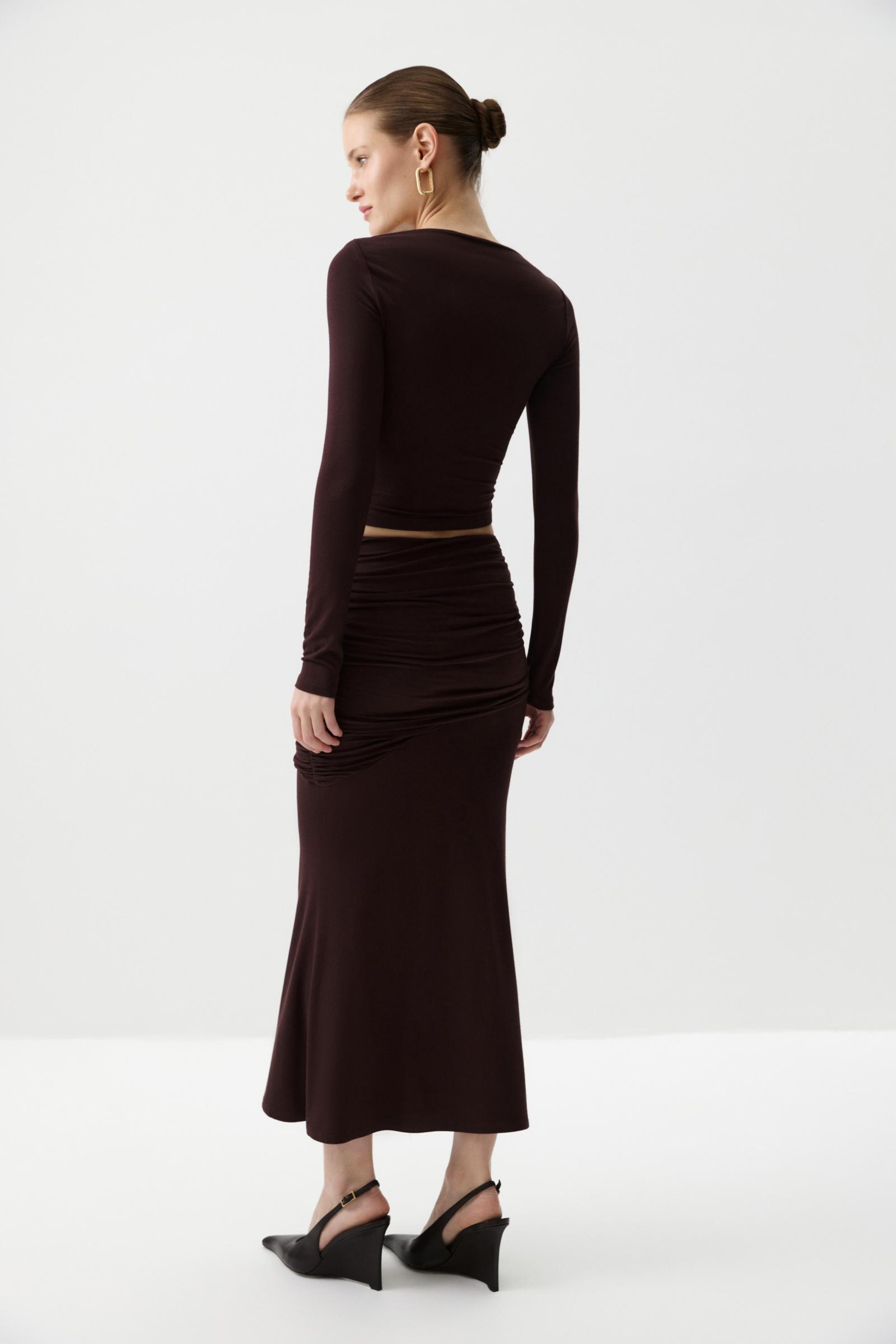 Сочетайте лонгслив с юбкой-годе из идентичной ткани. Впишите лонгслив в классические монохромные костюмные выходы сохраняя сдержанный минималистичный стиль. Носите с брюками из денима, выбирая расслабленный образ для повседневных встреч.