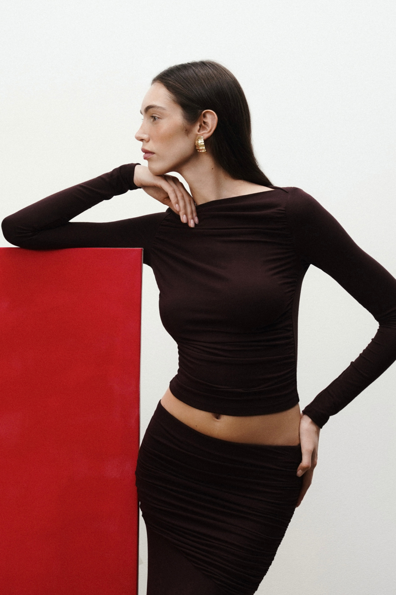Лонгслив с горловиной-лодка. Модель из мягкого, плотного трикотажа с длинным рукавом. По переду топ собран на сборку в боковых швах.