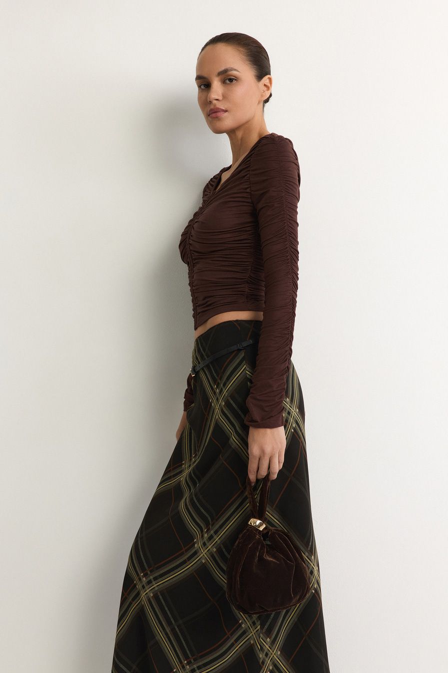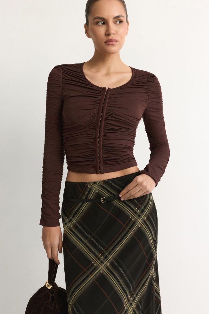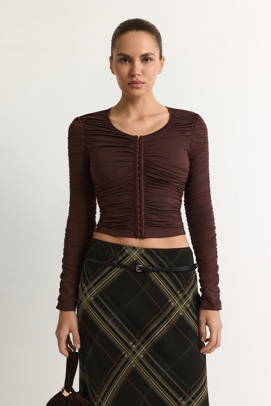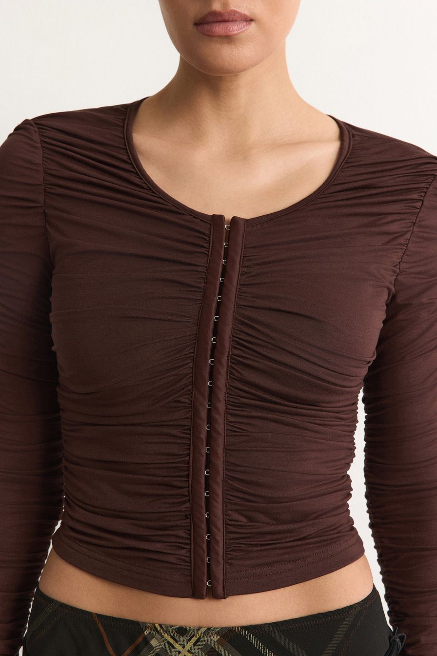 Коричневый лонгслив облегающего кроя выполнен из смесового тенселя. Тенсель – материал натурального происхождения из древесины эвкалипта. Модель дополнена застежкой с петлями и крючками, декорирована сборками.
