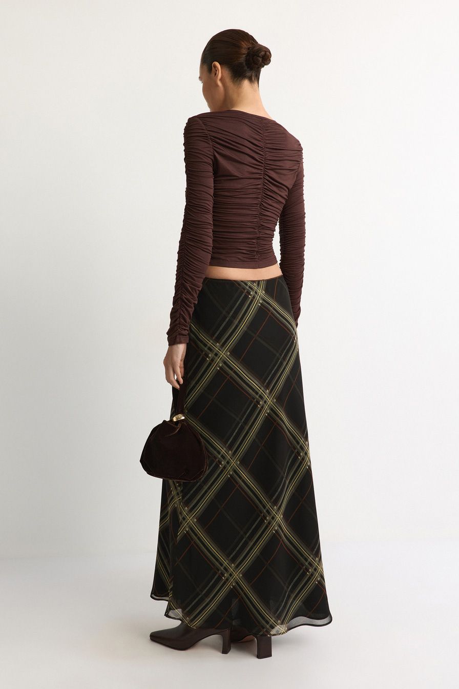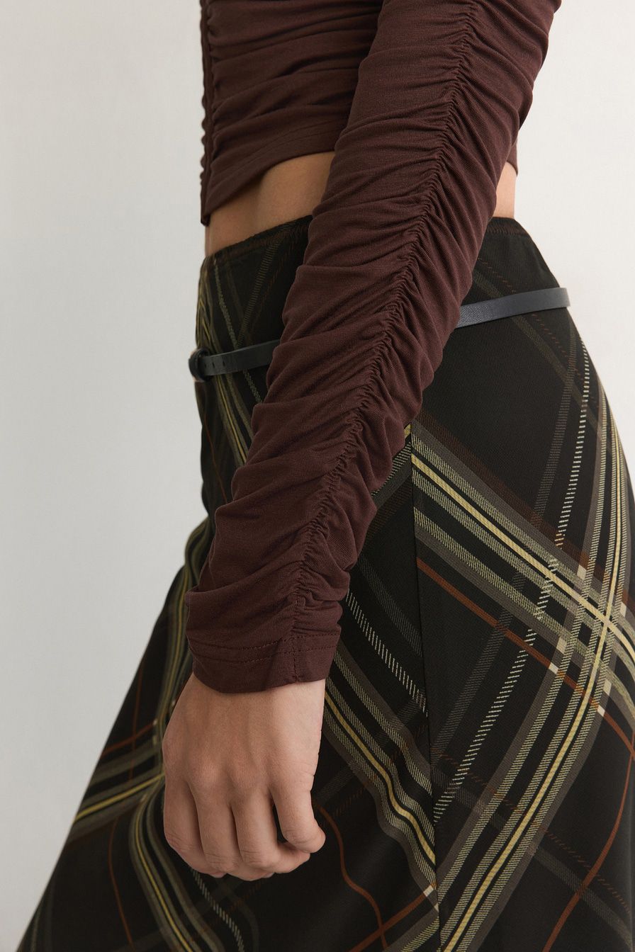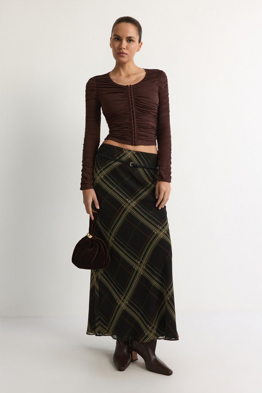 Коричневый лонгслив облегающего кроя выполнен из смесового тенселя. Тенсель – материал натурального происхождения из древесины эвкалипта. Модель дополнена застежкой с петлями и крючками, декорирована сборками.