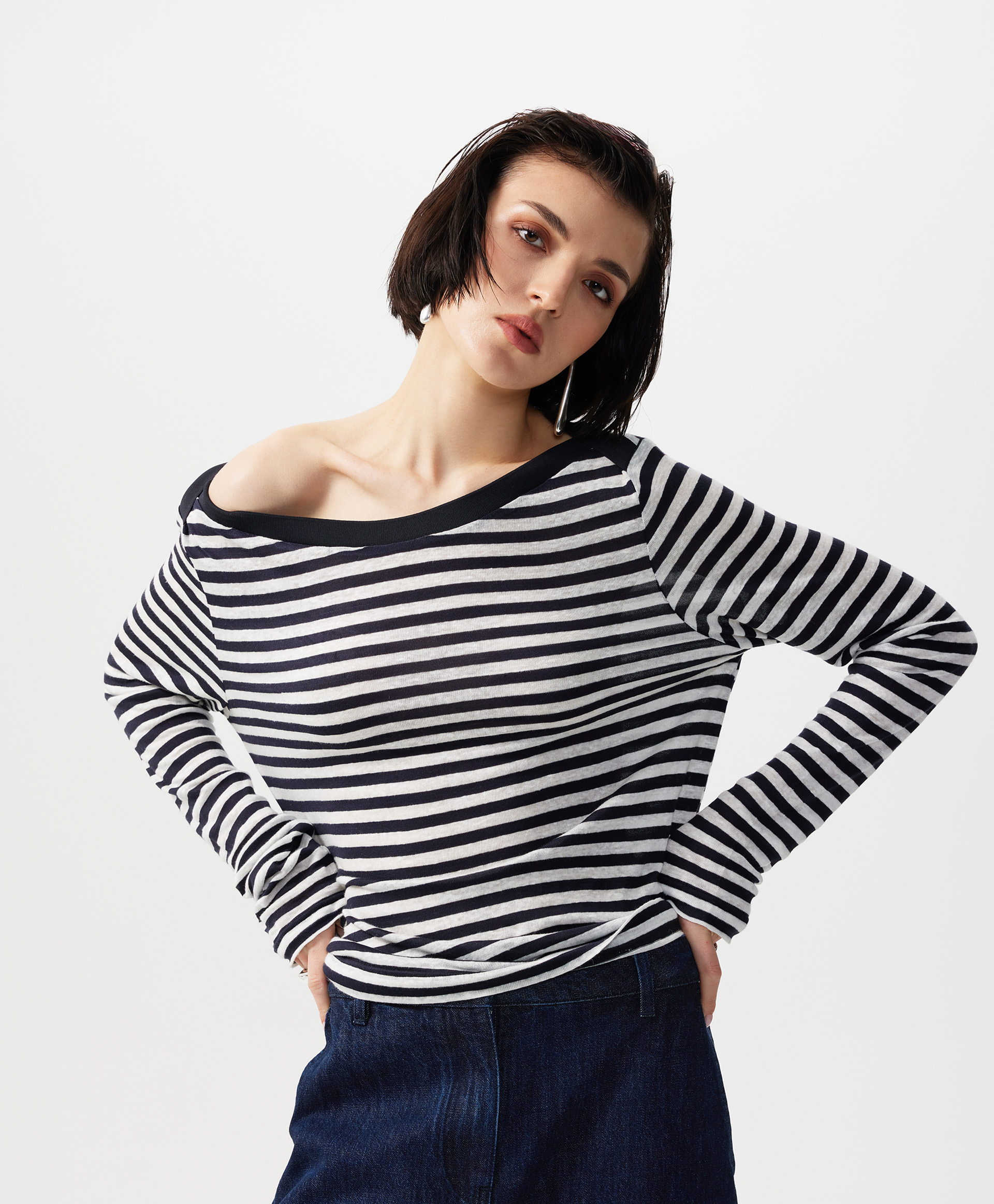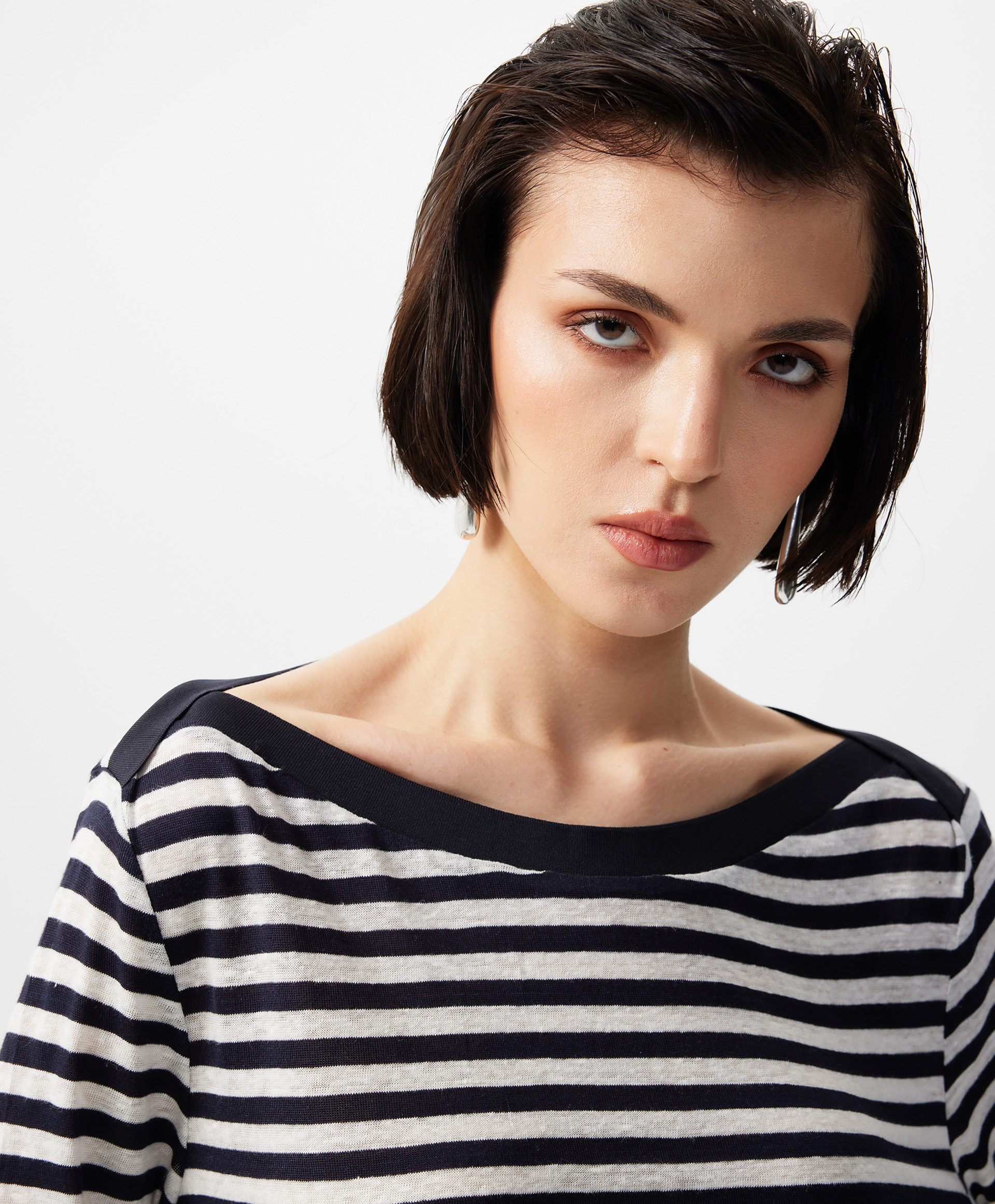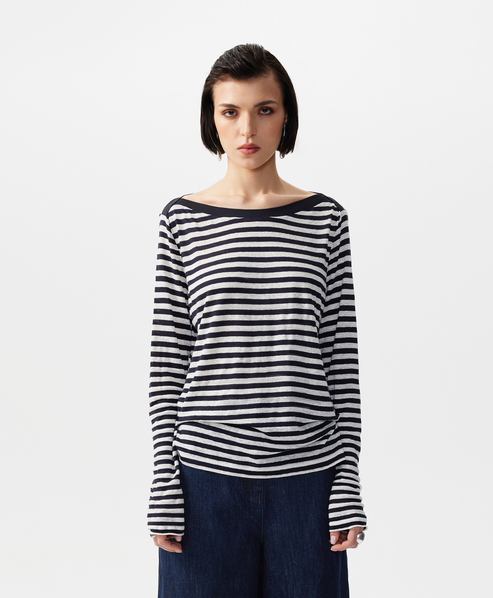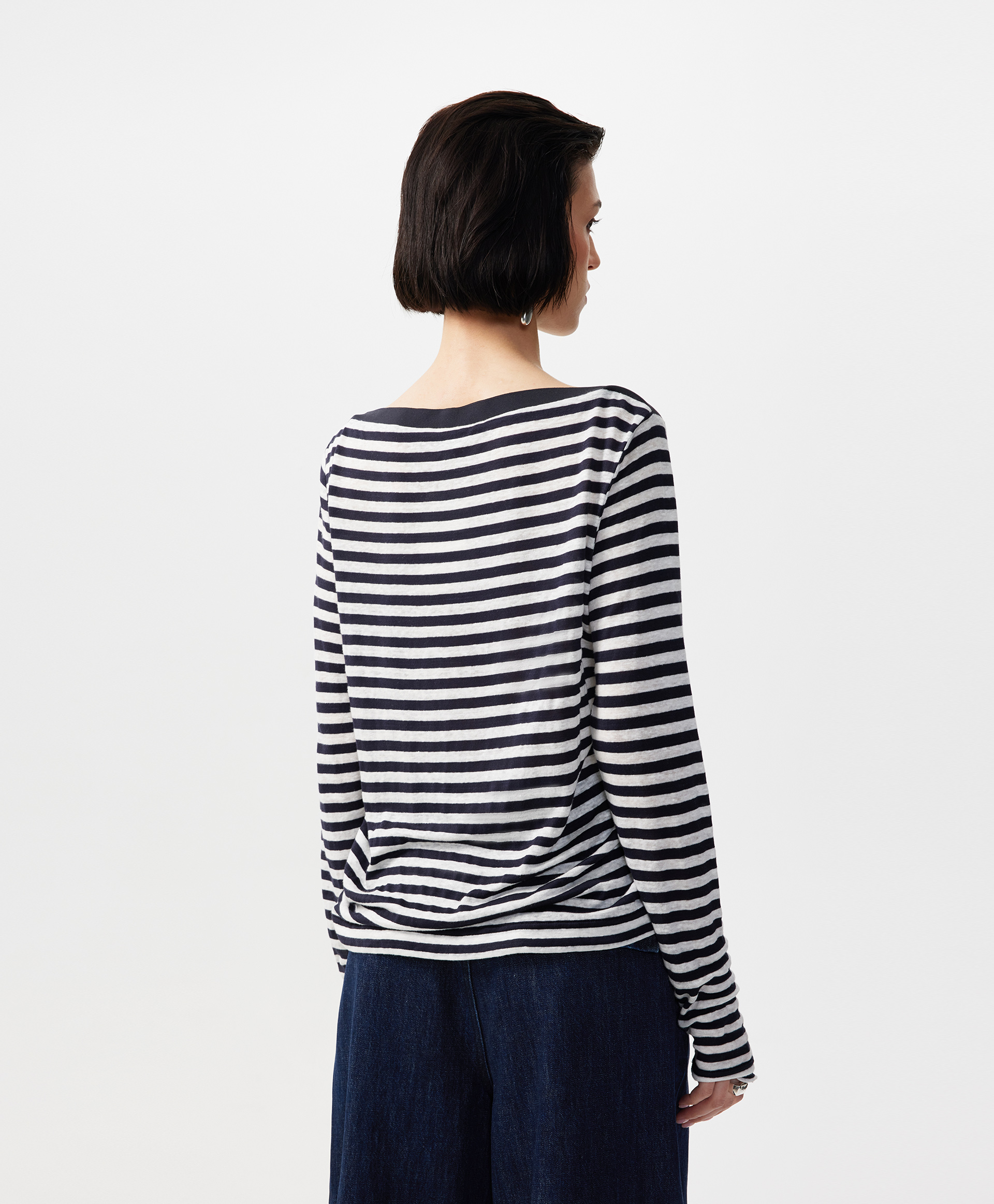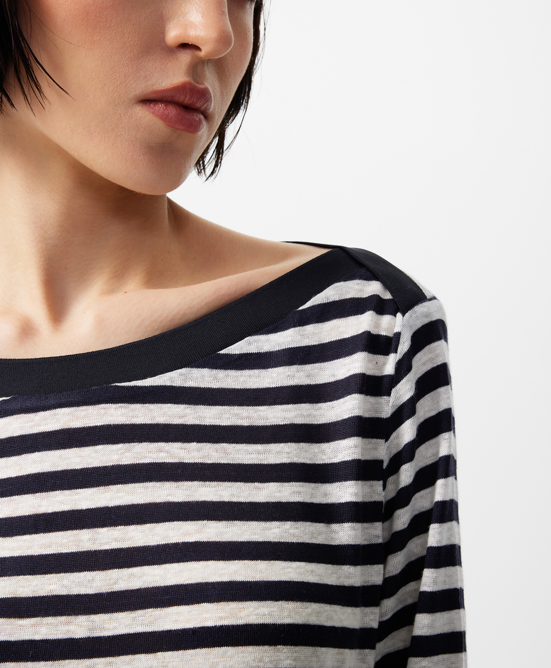 Лонгслив полуприлегающего силуэта с воротником-лодочкой, выполненный из легкого трикотажного полотна с ярко выраженным штриховым эффектом, полученным благодаря переплетению нитей разной толщины и плотности, позволит с благодарностью вспомнить легендарную Коко Шанель, внедрившую полоску в гардероб женщины. Впитавшая свежесть морского бриза, полоска навсегда стала символом свободы, аристократичности, элегантности, комфорта, став непременным атрибутом нарядных, спортивных, повседневных комплектов. Беспрецедентный состав с преимущественным содержанием льна гарантирует превосходный воздухообмен, прохладу, легкость, необходимые в жаркий день. Мягкость, пластика и подвижность материала делают лонгслив почти не ощутимым на теле. Воротник-лодочка, акцентирующий внимание на линии шеи и ключиц, подчеркивает красоту и женственность образа. Выполненный из синей глади, он создает цветовой акцент и служит гармоничным завершением дизайнерского решения.