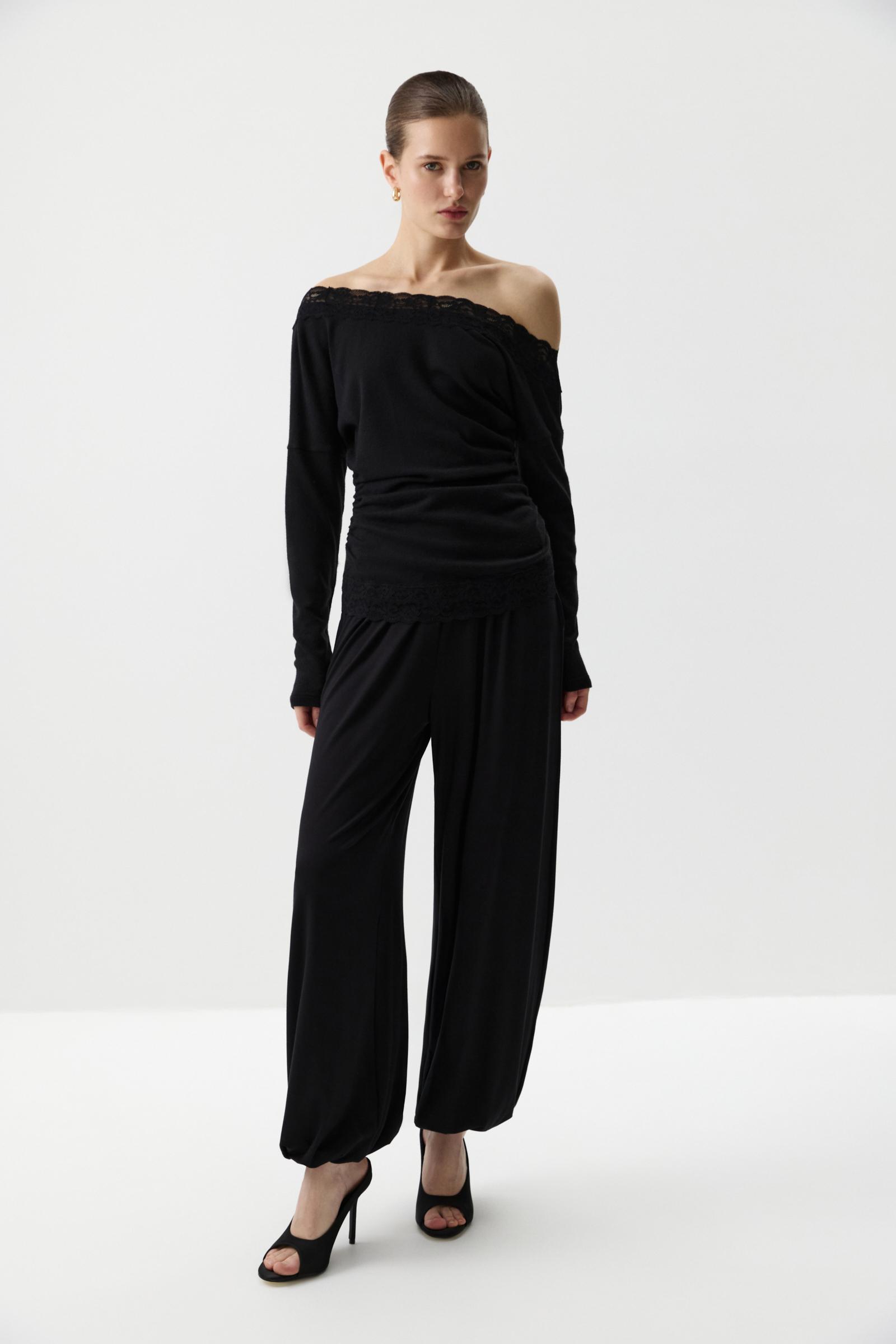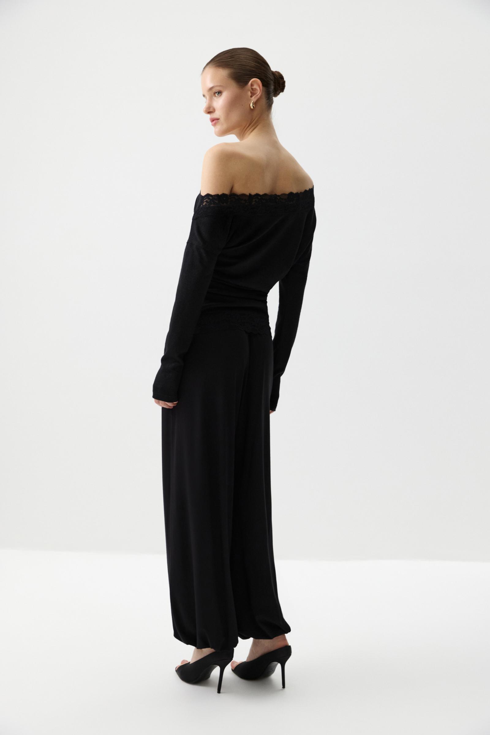 Лонгслив из мягкой свитерной ткани со спущенной линией плеча. Нежная драпировка и ассиметричный крой подчеркивающие ключицы. По горловине и низу изделия элегантное кружево. Длина до линии бедер, по боковым швам легкая сборка, добавляющая изделию объем.
