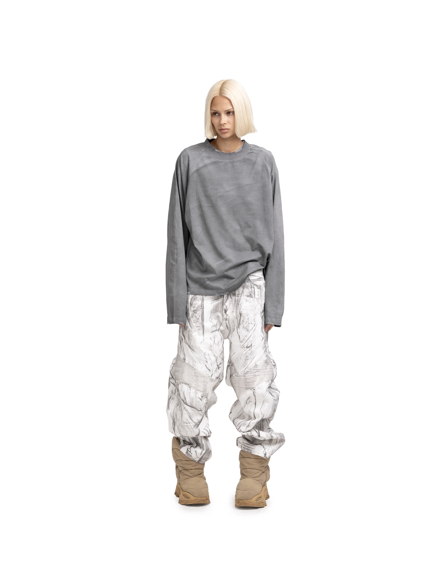 Эта модель создана для гармоничного сочетания с нашими популярными бомберами. Вдохновением послужили индустриальные мотивы: бетон, металл и масштабные пространства. Ткань с фактурной поверхностью, ручная покраска и искусственные повреждения усиливают урбанистическую эстетику, подчеркивая грубоватую, но стильную концепцию.
