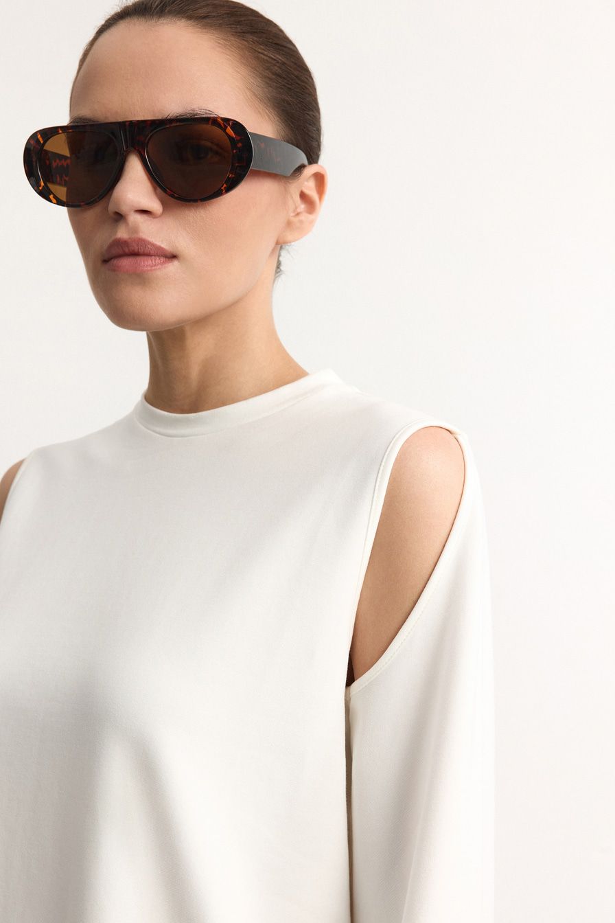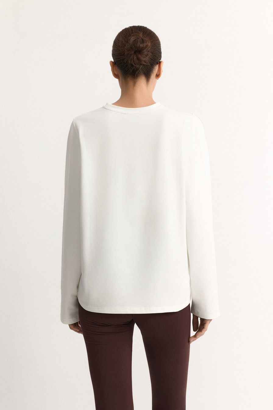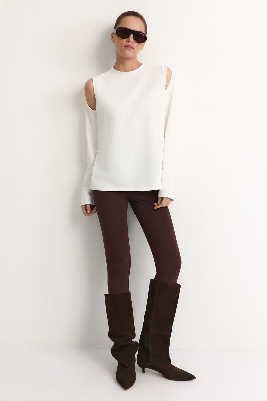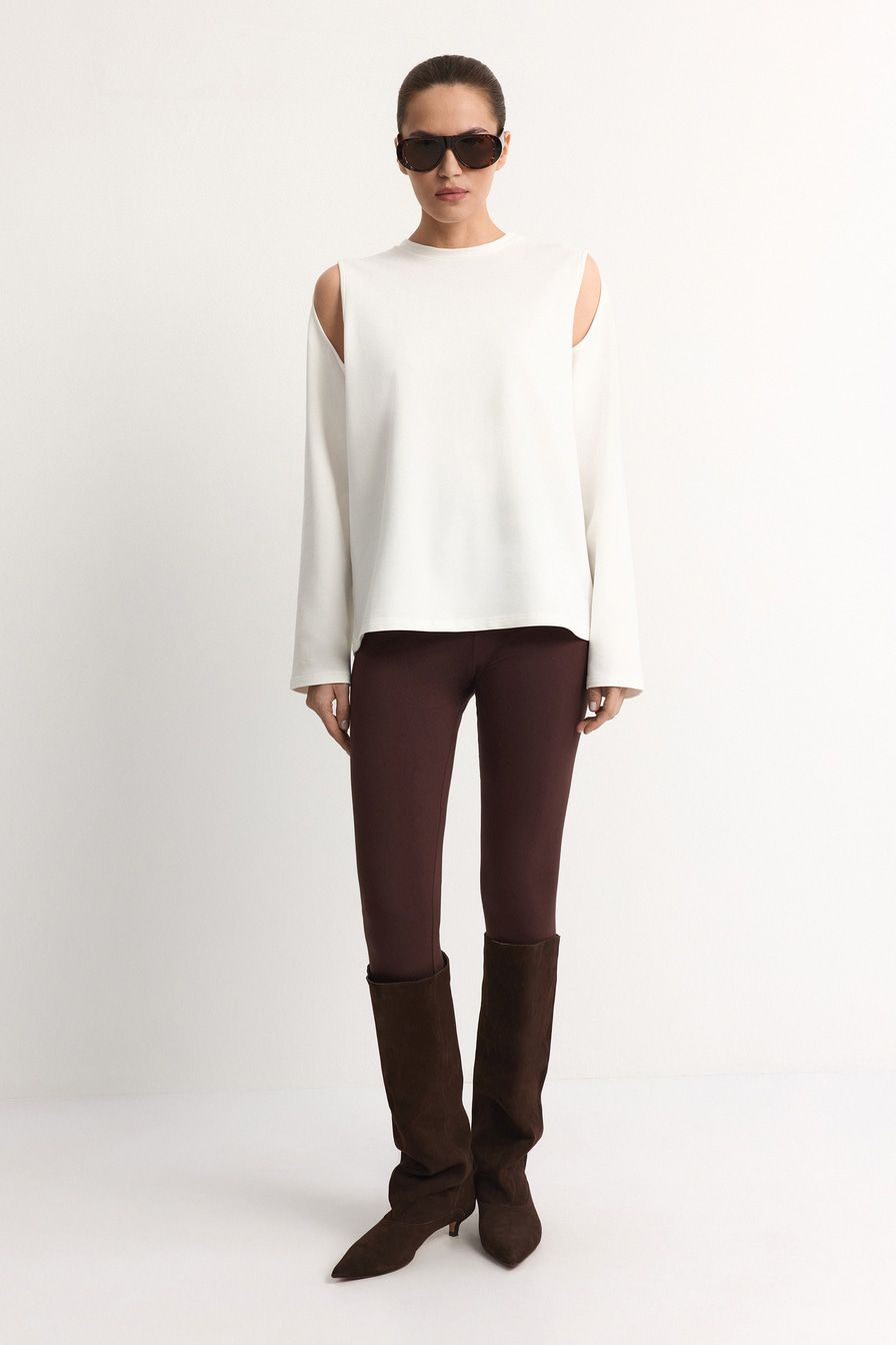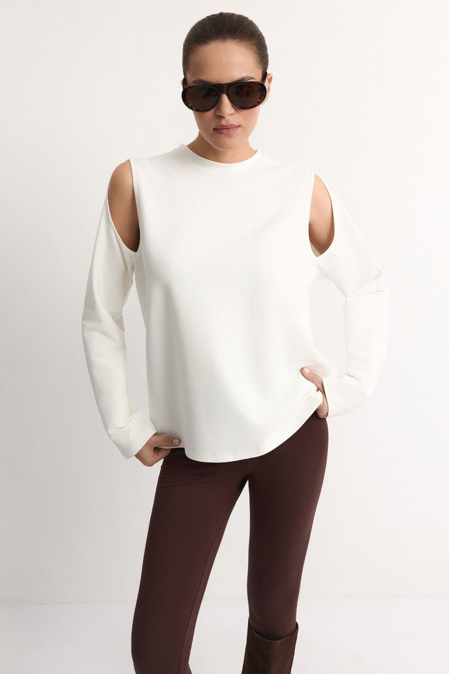 Белый лонгслив из смесового хлопка – модель свободного кроя. Лонгслив декорирован вырезами на плечах.