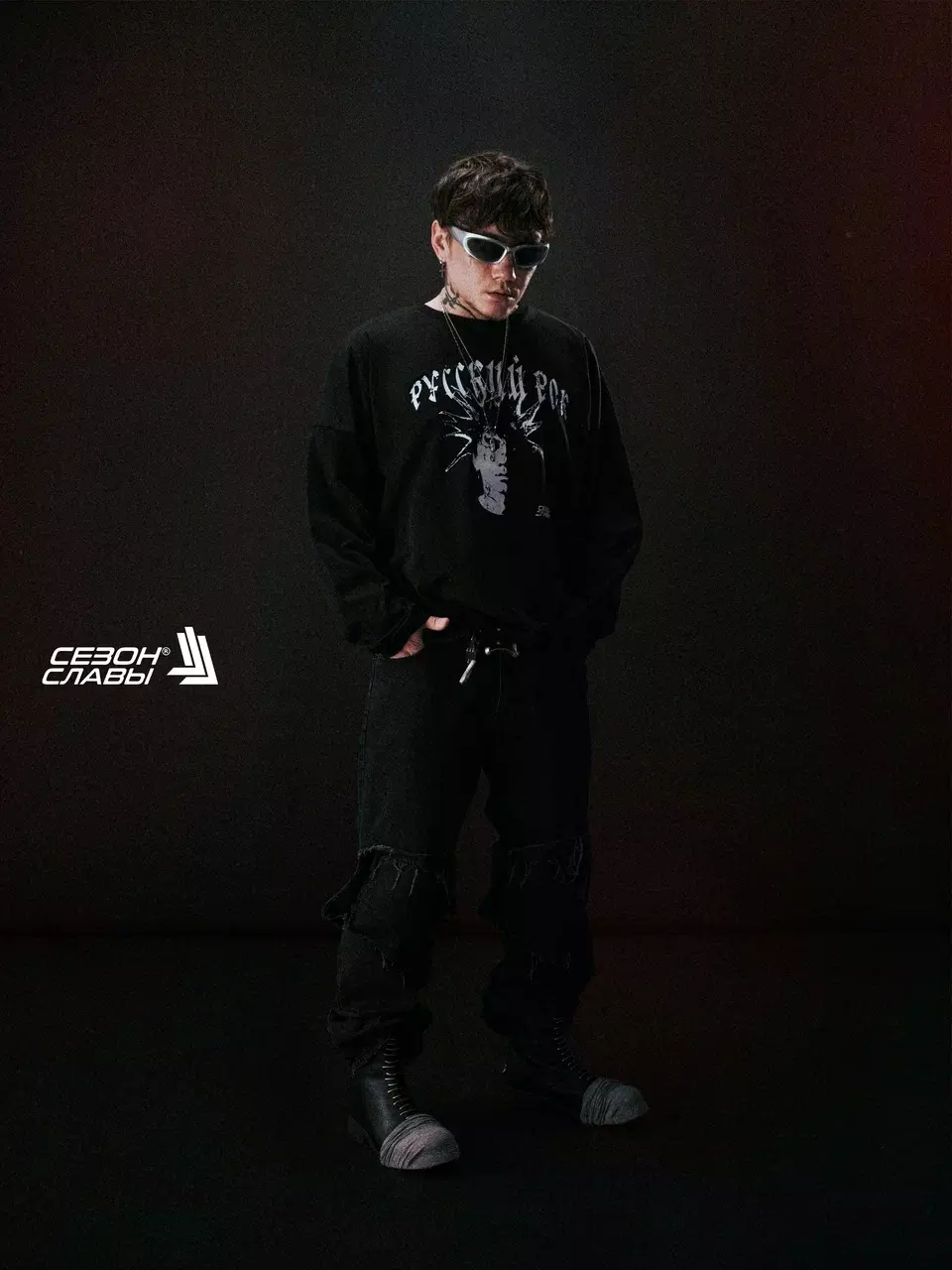 Хлопковый черный лонгслив свободного кроя со спущенными плечами. Украшена контрастной надписью и портретом солиста в состаренном стиле. Носите с другими вещами из коллаборации с Три Дня Дождя.