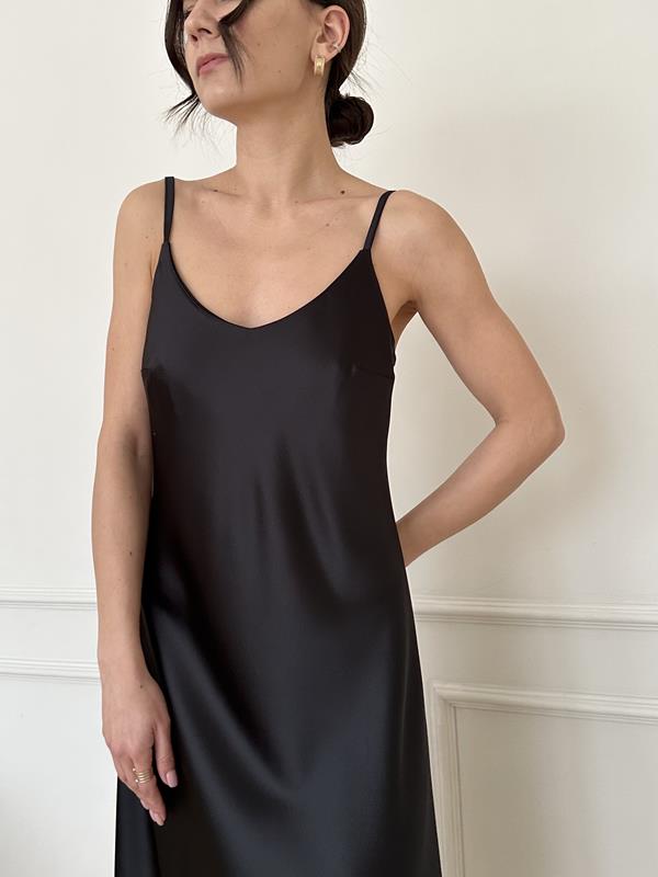 Платье миди на тонких бретелях подчеркивает силуэт и мягко облегает. Для модели выбран плотная и мягкая вискоза с блеском.