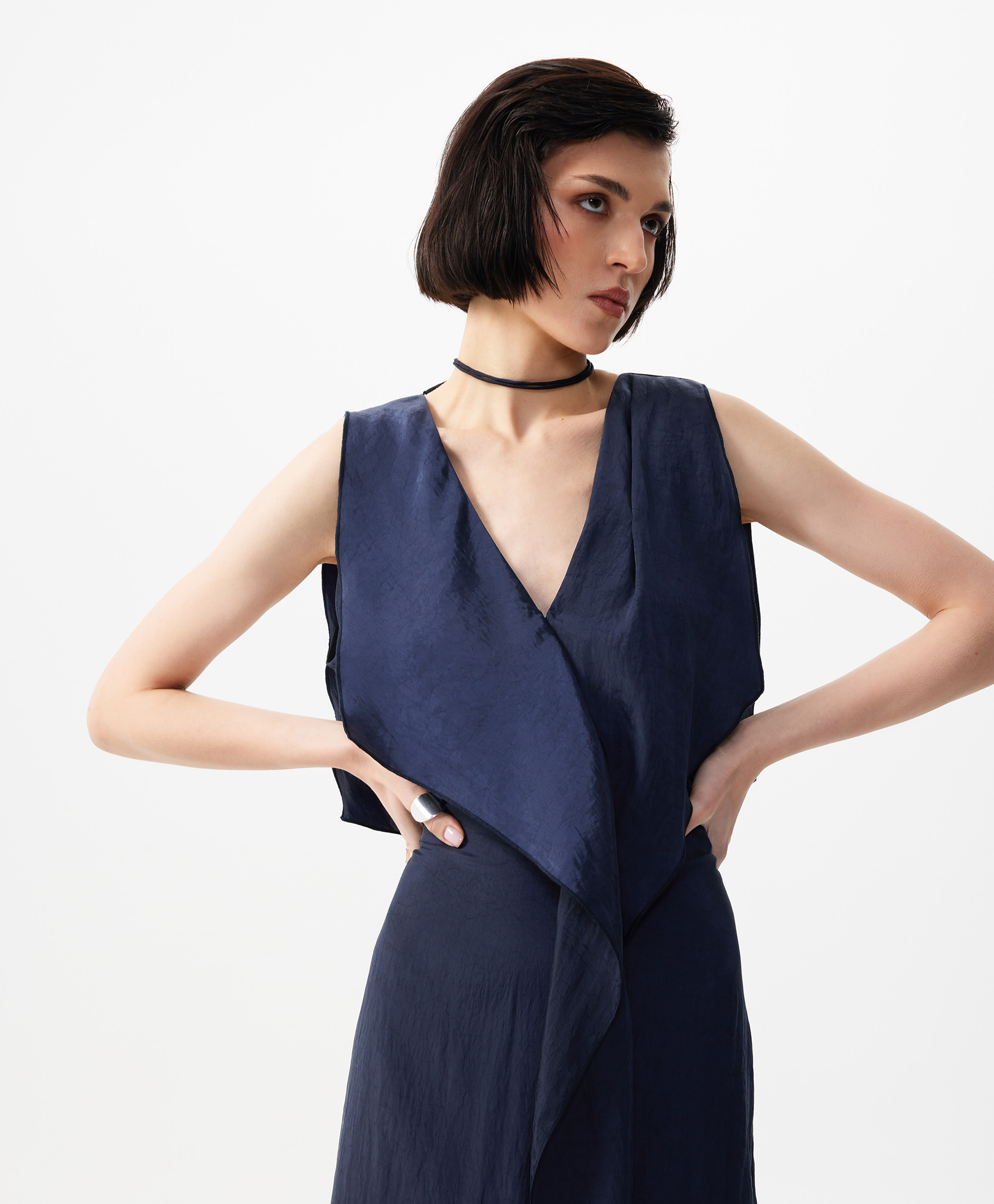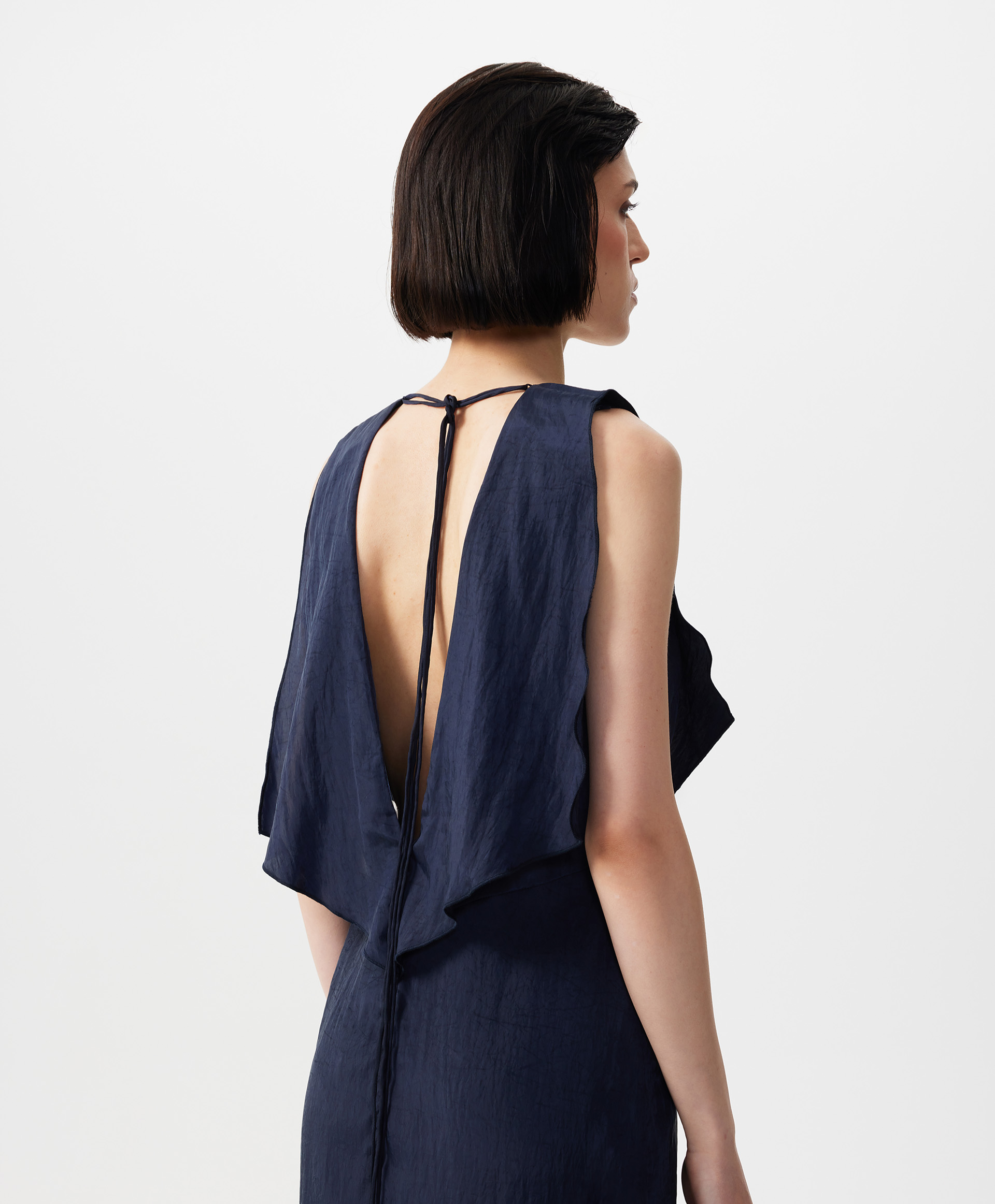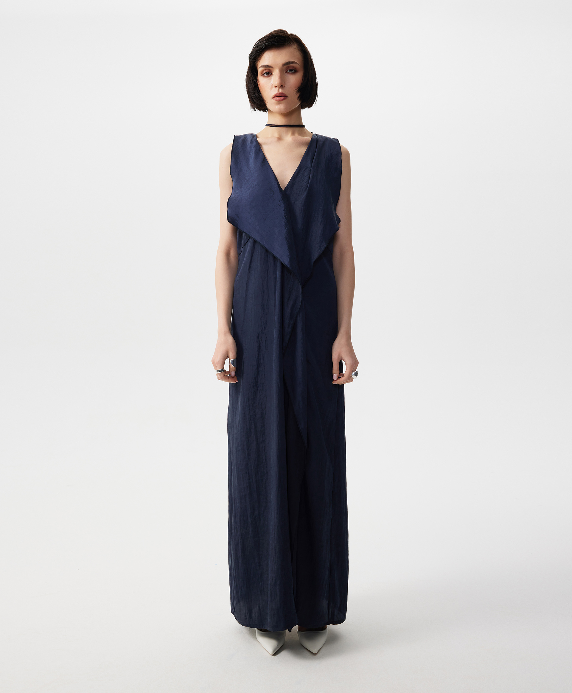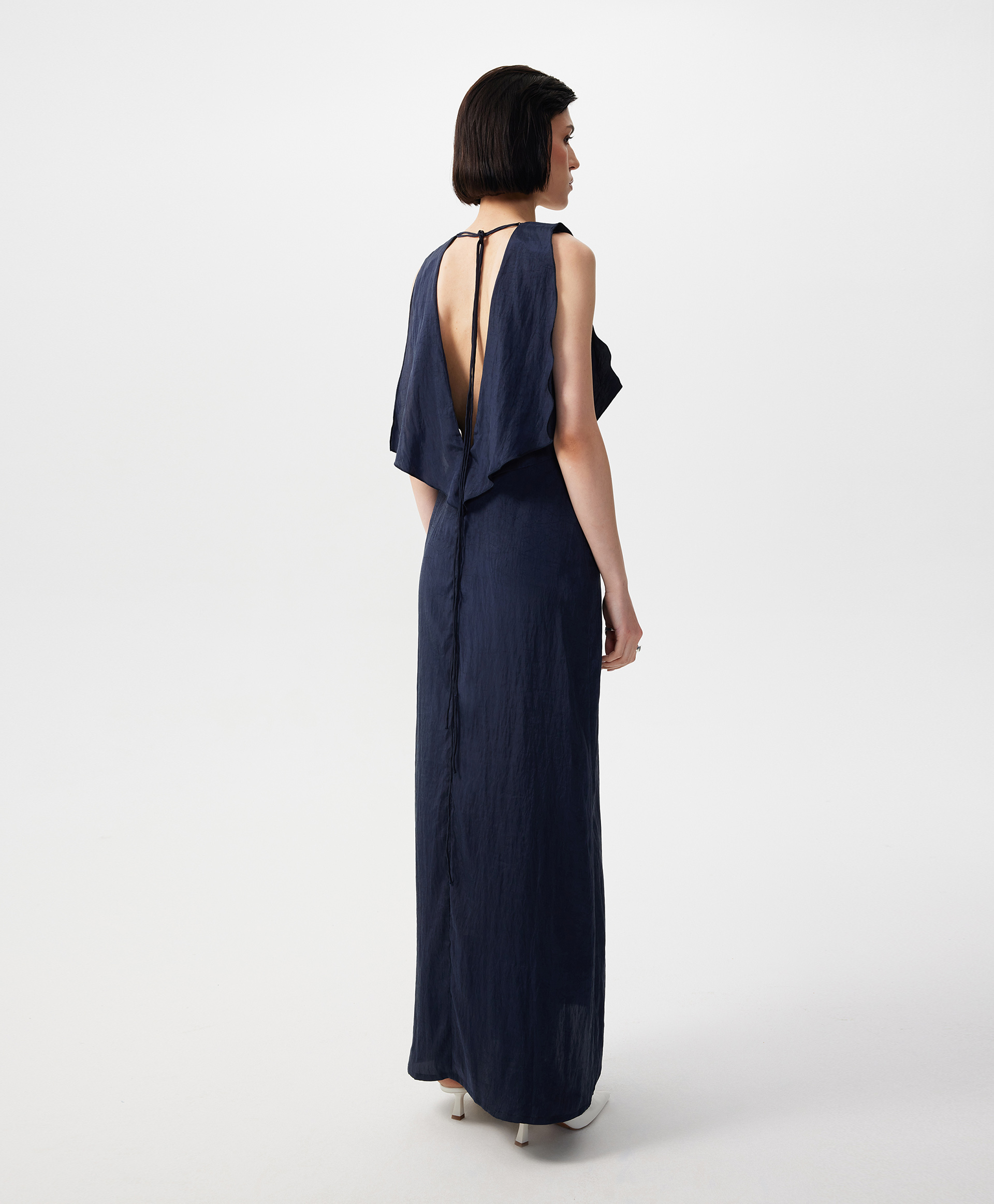 Это платье вдохновлено эстетикой декаданса: роскошно, красиво, чувственно и немного небрежно. Выполненное из матовой шелковистой вискозной ткани с легким жатым эффектом, длинное приталенное платье А-силуэта с открытой спиной и глубоким вырезом, деликатно подчеркивающим зону декольте - воплощение женственности. Крой с асимметричным фигурным членением на передней части, переходящим в высокий разрез для комфортного шага, подчеркнут широкими ниспадающими отлетными деталями. Они мягко касаются плеч, создают приятное скольжение при взаимодействии друг с другом, изящно колышутся на ветру, создавая шлейфовый эффект при движении. Платье застегивается на потайную молнию на спинке. Небольшой декоративный акцент - съемный шнур из основного материла, который проходит через маленькие петли в зоне плеч - позволяет завязать его на узел, оставив длинные тонкие концы лежать в свободном положении или зафиксировать иным способом. Шнур-колье придает платью красивое завершение. Отлетные детали обработаны по краю микрообметкой