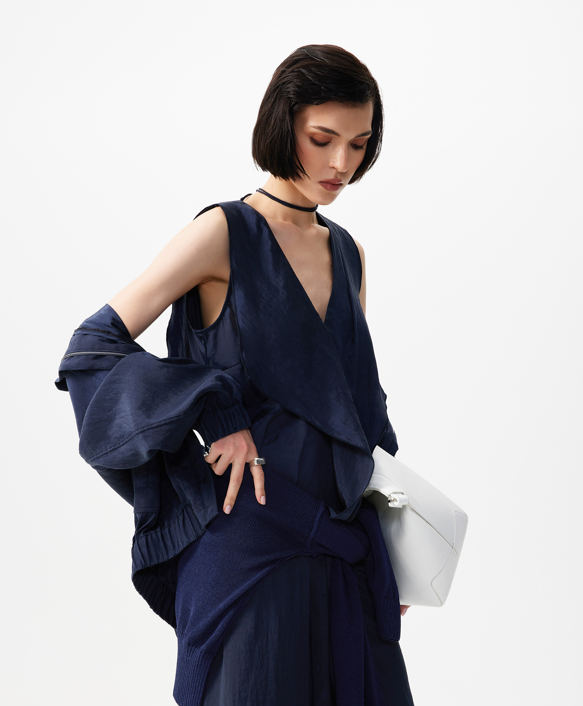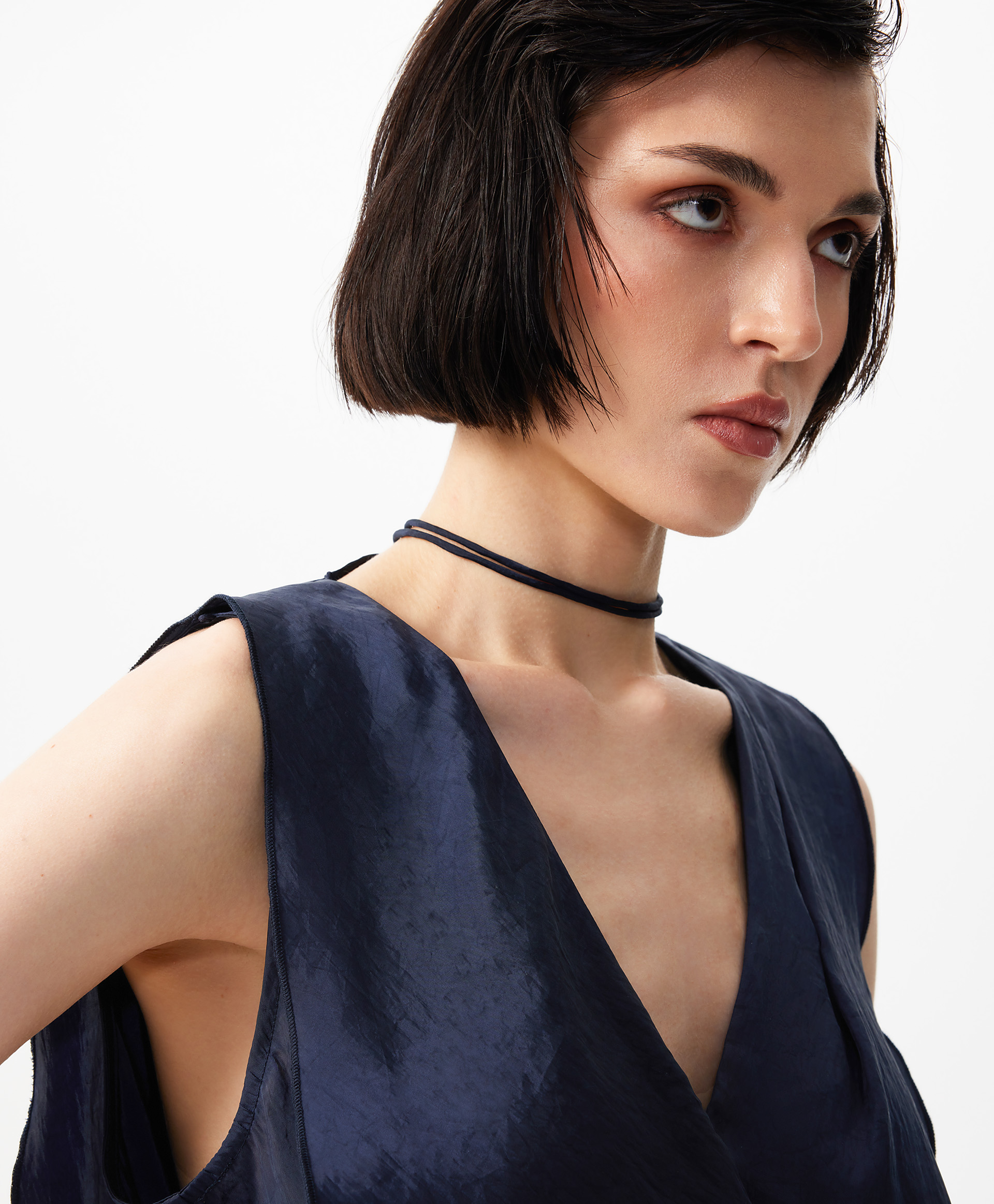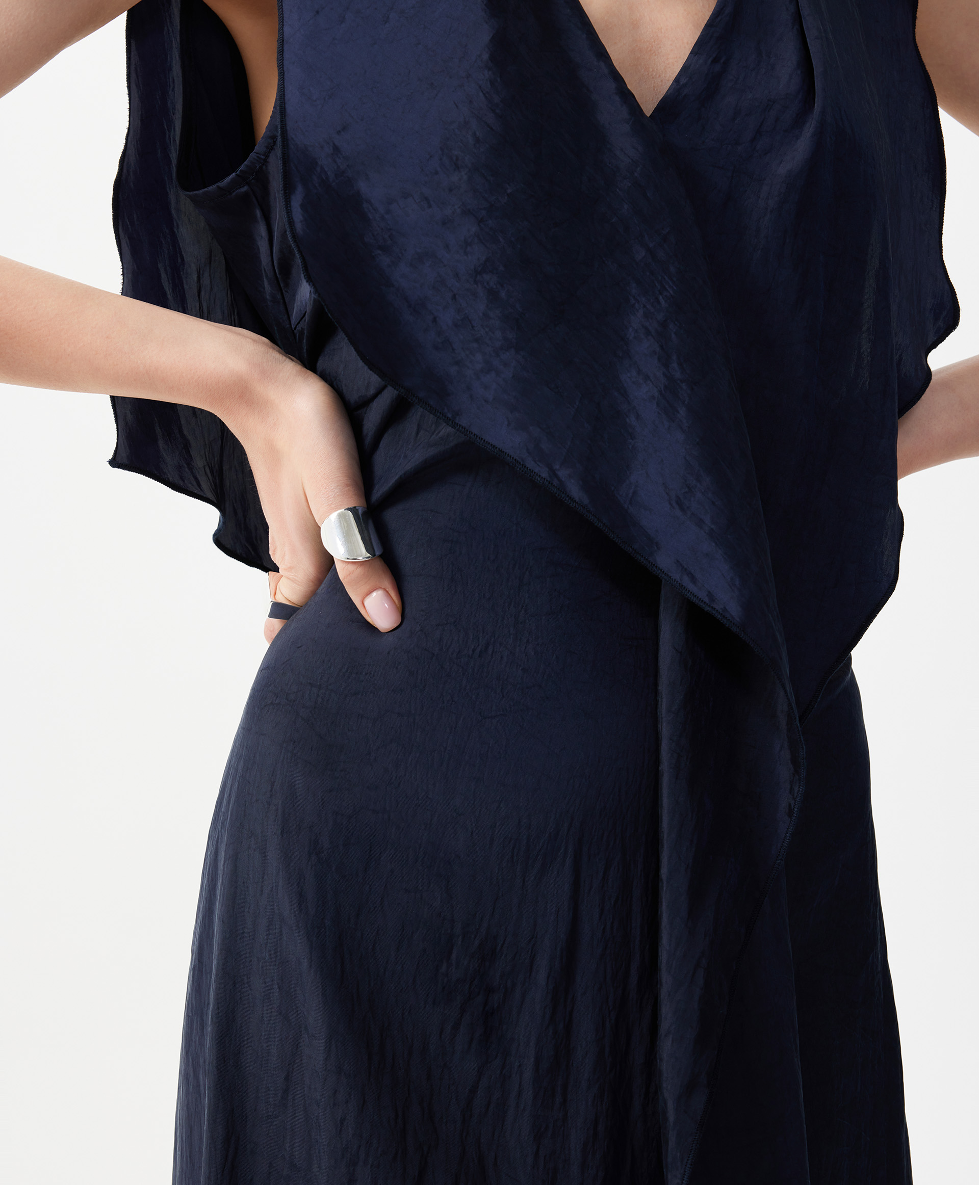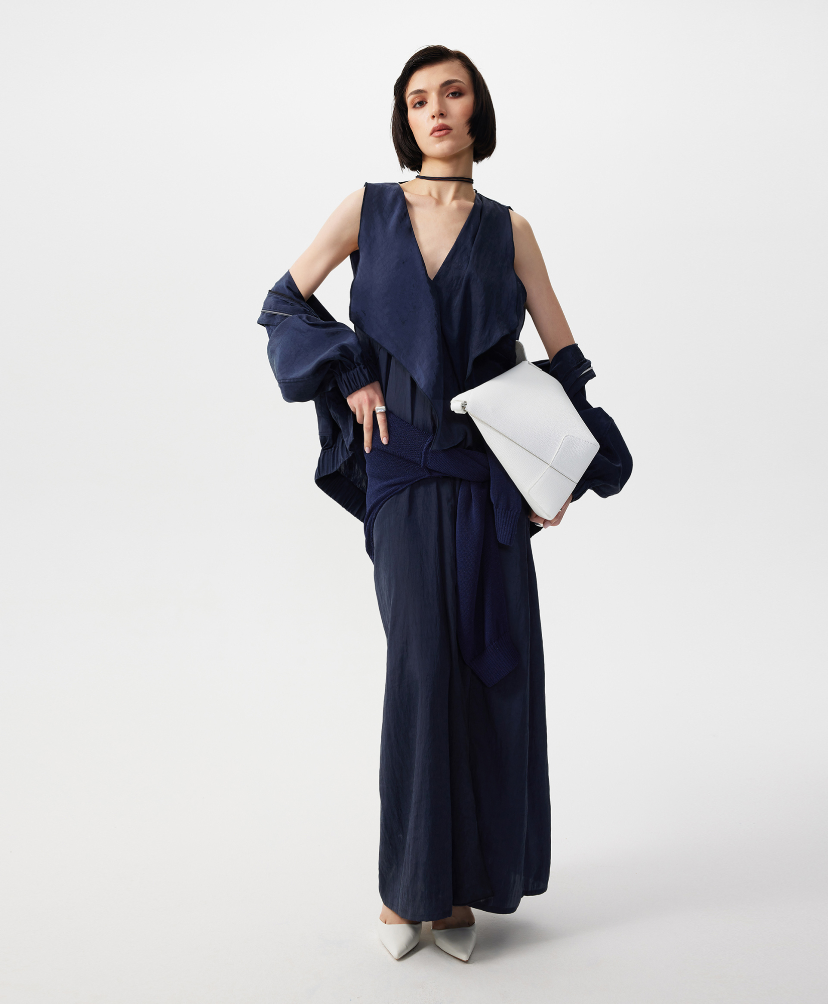 Это платье вдохновлено эстетикой декаданса: роскошно, красиво, чувственно и немного небрежно. Выполненное из матовой шелковистой вискозной ткани с легким жатым эффектом, длинное приталенное платье А-силуэта с открытой спиной и глубоким вырезом, деликатно подчеркивающим зону декольте - воплощение женственности. Крой с асимметричным фигурным членением на передней части, переходящим в высокий разрез для комфортного шага, подчеркнут широкими ниспадающими отлетными деталями. Они мягко касаются плеч, создают приятное скольжение при взаимодействии друг с другом, изящно колышутся на ветру, создавая шлейфовый эффект при движении. Платье застегивается на потайную молнию на спинке. Небольшой декоративный акцент - съемный шнур из основного материла, который проходит через маленькие петли в зоне плеч - позволяет завязать его на узел, оставив длинные тонкие концы лежать в свободном положении или зафиксировать иным способом. Шнур-колье придает платью красивое завершение. Отлетные детали обработаны по краю микрообметкой