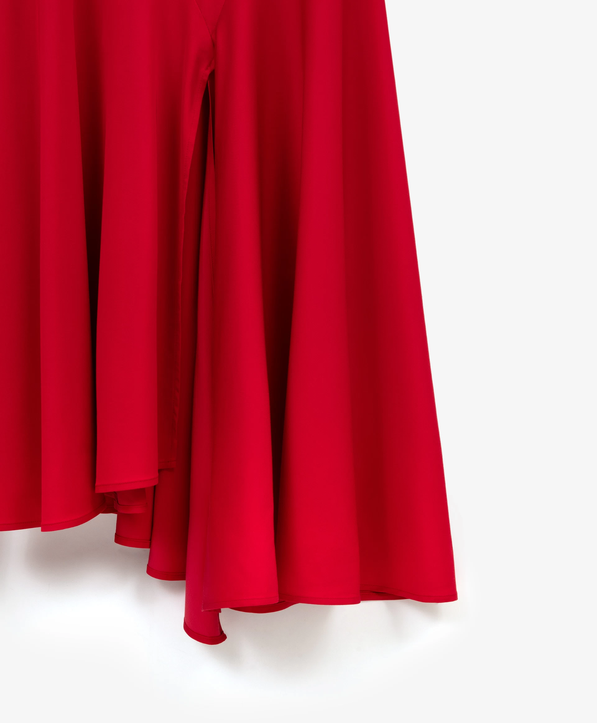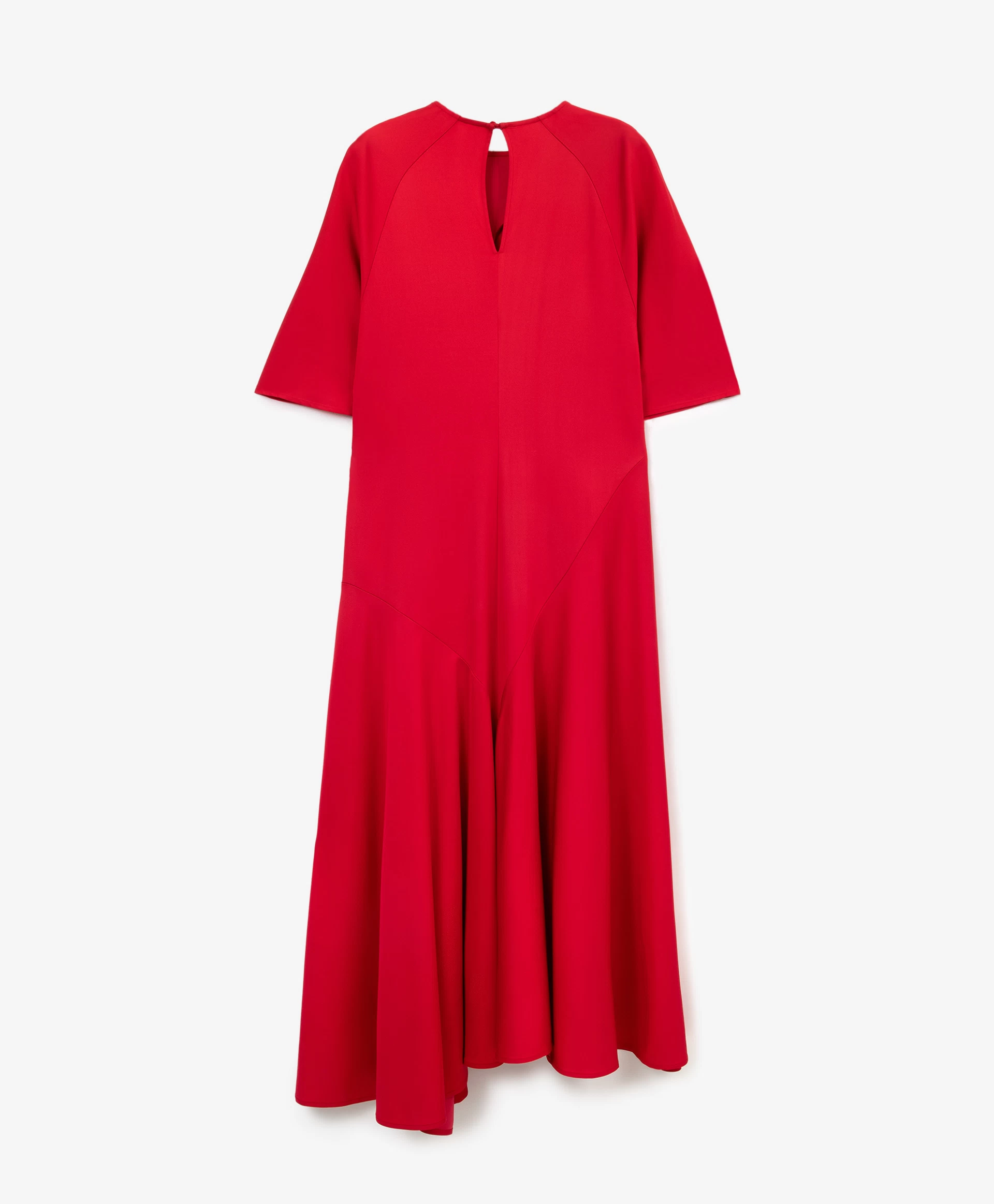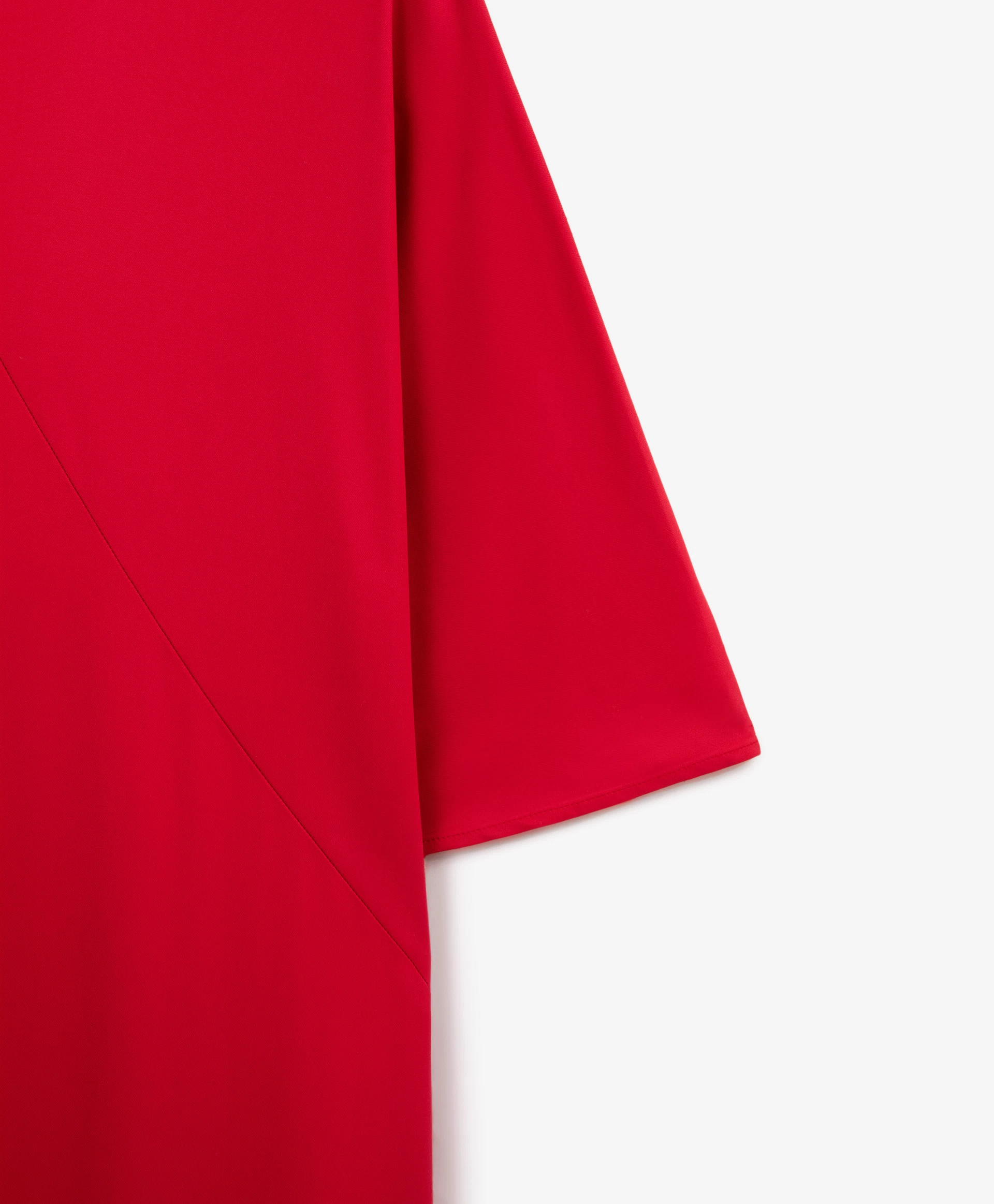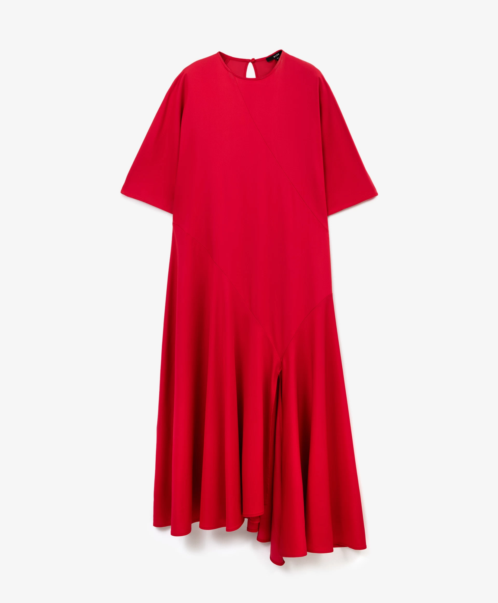Платье макси с коротким рукавом А-силуэта - отражение модного минимализма с нотками романтики. Выполненное из пластичного вискозного текстиля с благородным атласным блеском, платье имеет гладкую шелковистую поверхность, очень приятную при тактильном контакте. Асимметричные конструктивные членения - по диагонали - на передней части и спинке, завершающиеся высокими разрезами, придают модели динамику. Рукава-реглан на спинке и цельнокроенные - кимоно - на полочке создают мягкость в плечевой зоне, подчеркивающей женственность образа. Неровная линия низа отсылает к эстетике декаданса: роскошно, красиво, чувственно и немного небрежно… Платье имеет каплевидную застежку на спинке. Трендовый цвет из палитры глубоких, насыщенных цветочных красных оттенков - цвет страсти, энергии, любви, вызывает эмоциональный подъем, повышает самооценку, делает женщину сильнее.