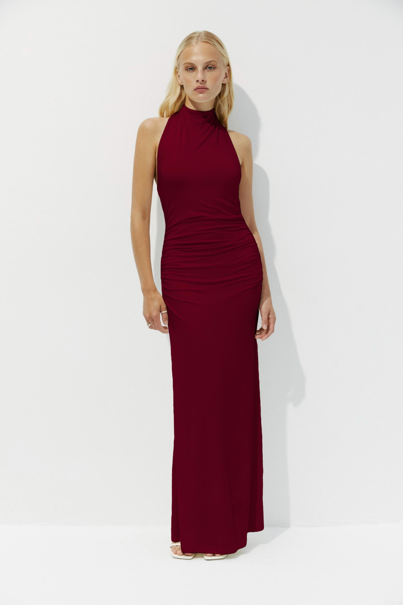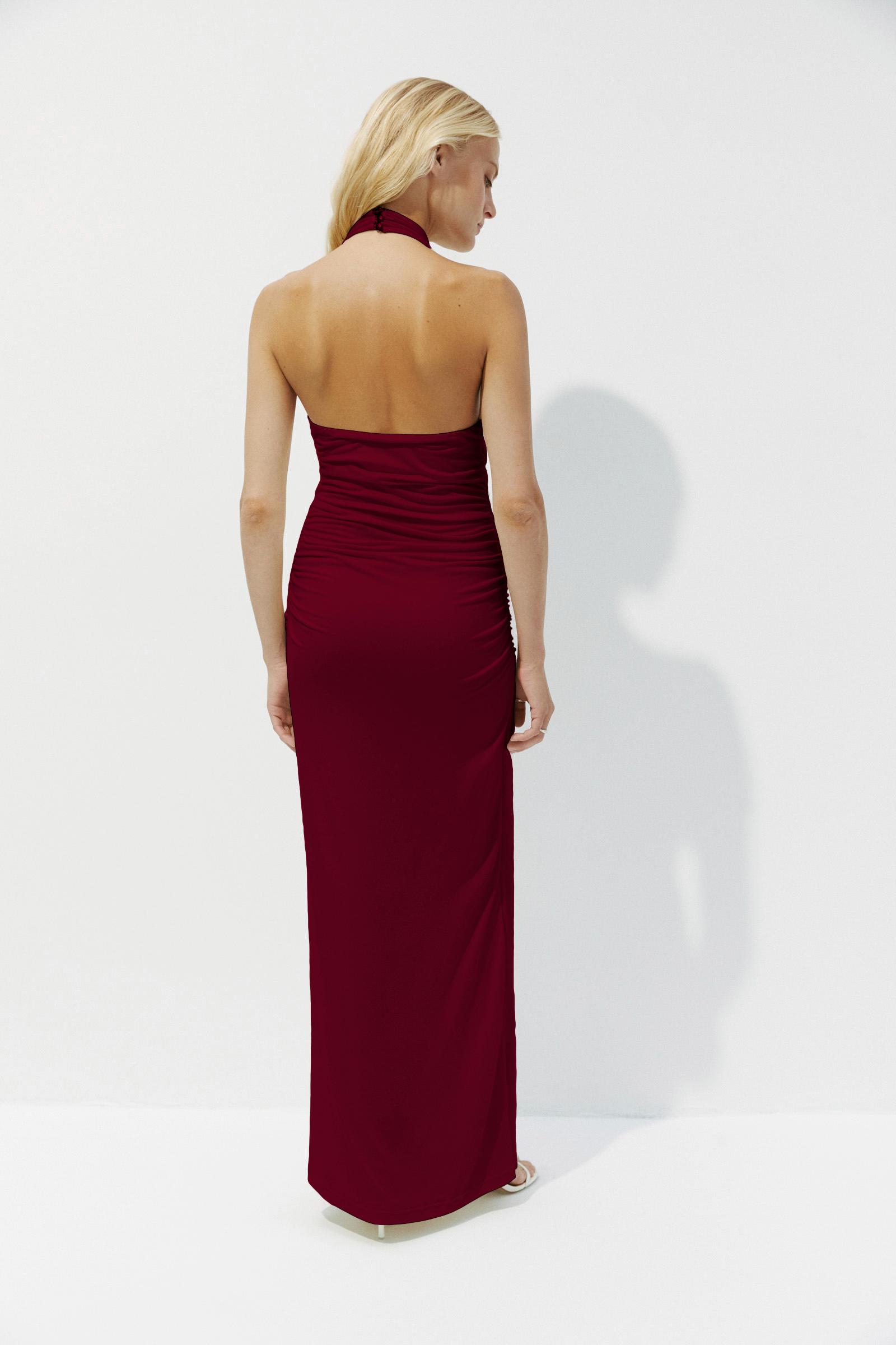Облегающее макси платье с воротником. Акцентом модели является воротник и эффектная открытая спина. Струящийся трикотаж деликатно прилегает к телу, обращая внимание на линию талии. За счет слегка расклешенного низа, модель очень удобна в носке. Большей выразительности платью добавляет драпировка по талии.