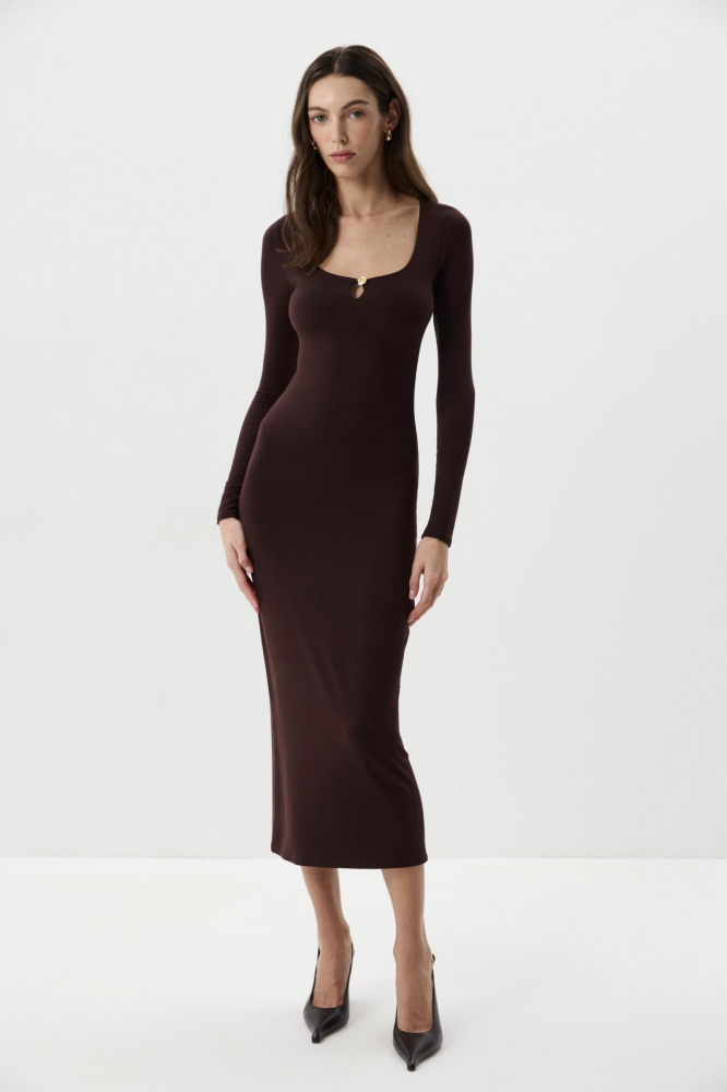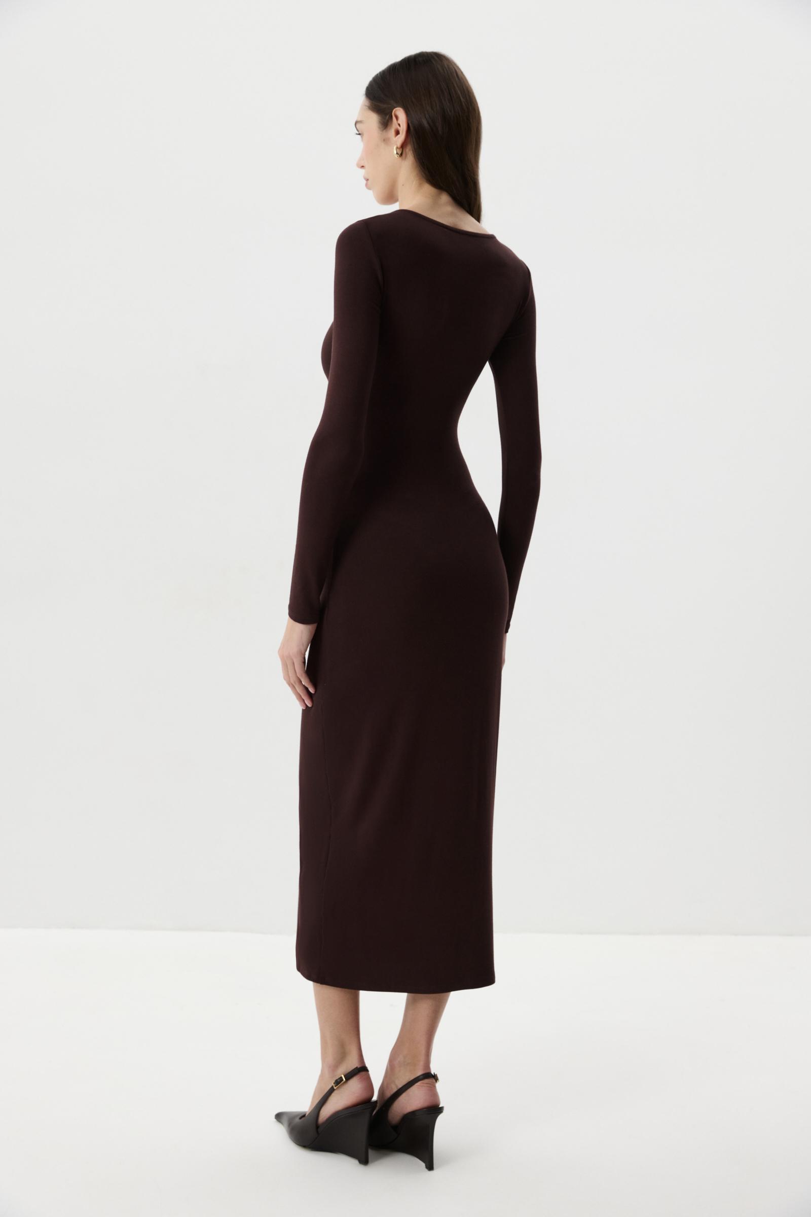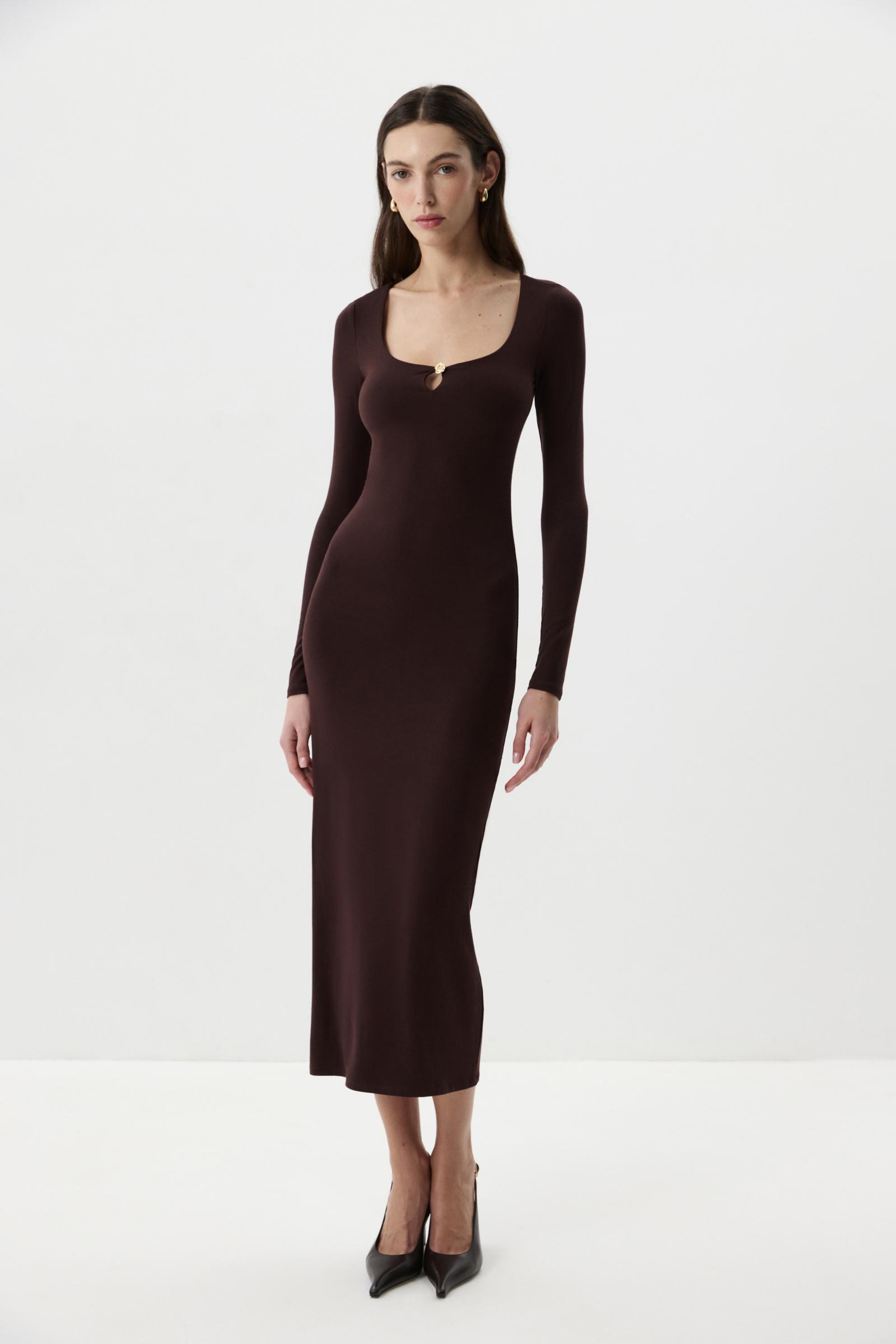 Платье из вискозного трикотажа в длине миди. Платье прилегающего силуэта с длинным рукавом. Глубокое декольте подчеркивает линию ключиц, а декоративный элемент в виде золотой розы добавляет платью акцент.