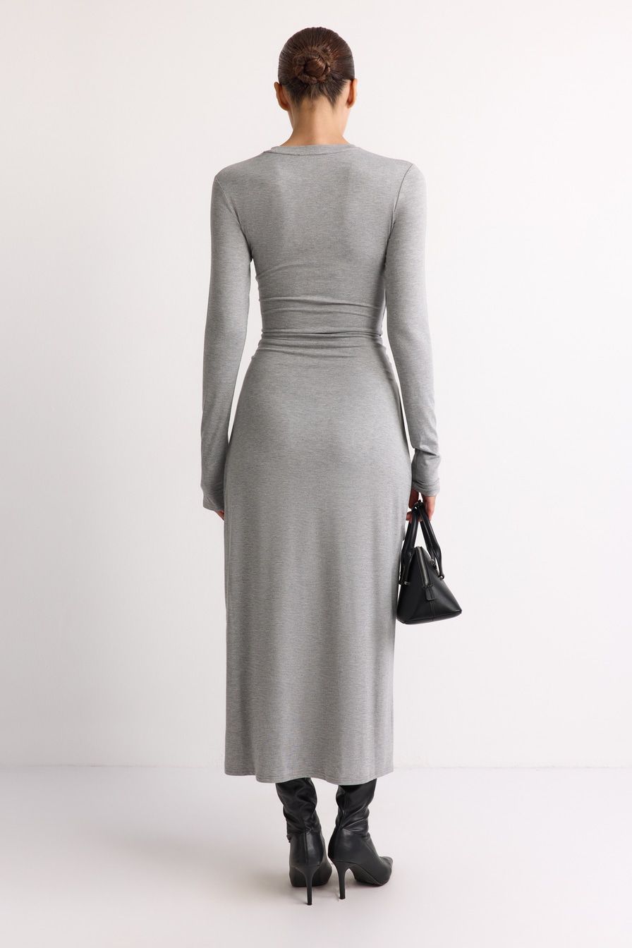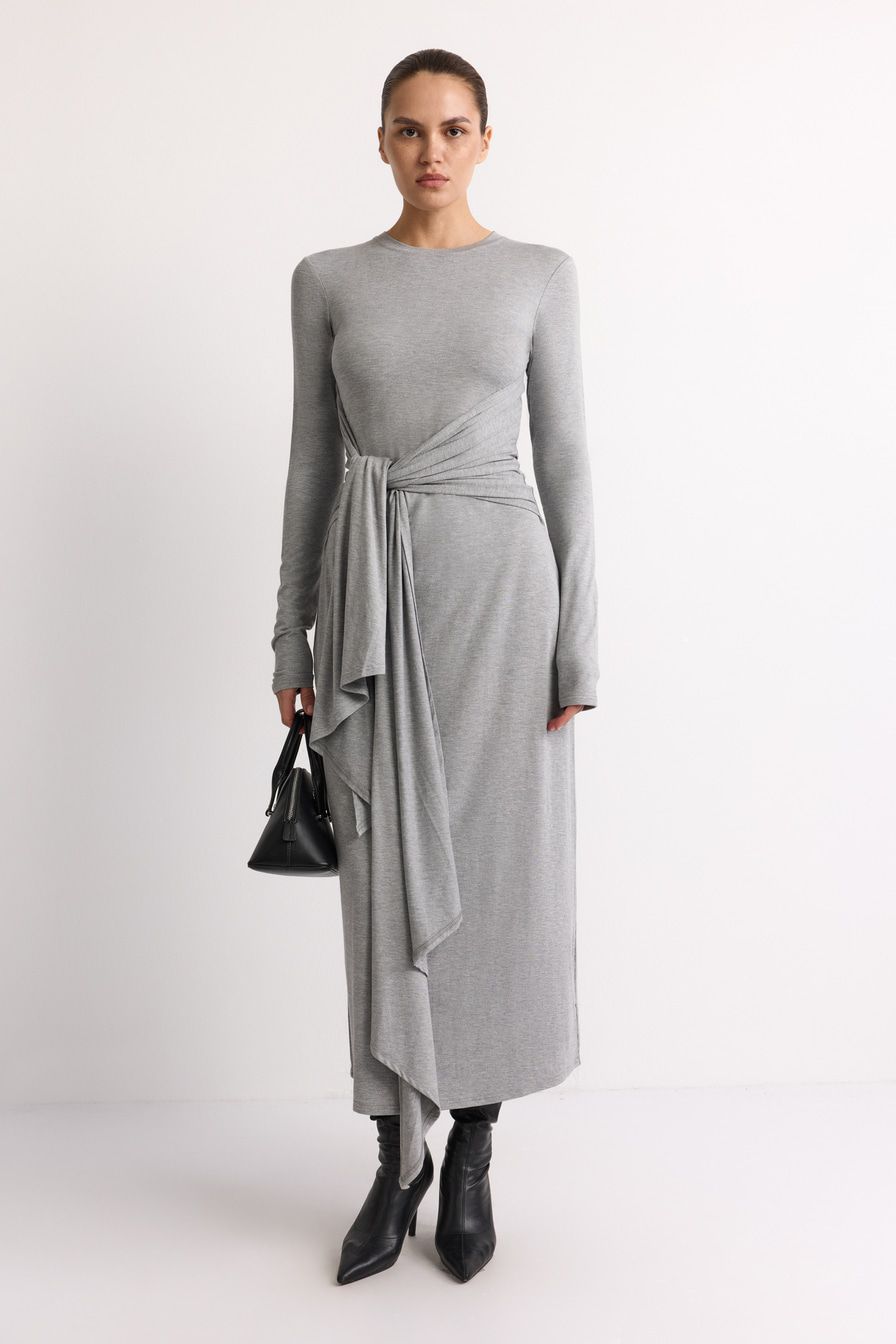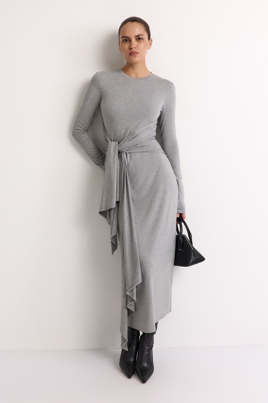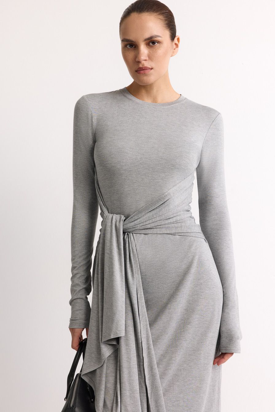 Серое трикотажное платье из смесовой вискозы – модель облегающего кроя с завязками на поясе.