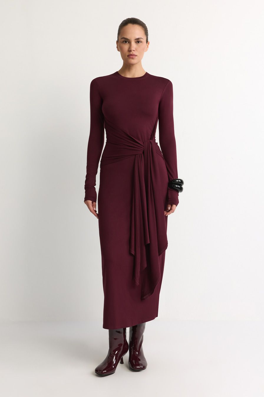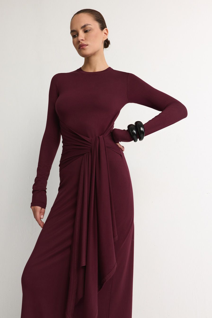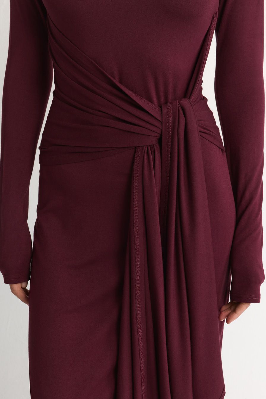 Бордовое трикотажное платье из смесовой вискозы – модель облегающего кроя с завязками на поясе.