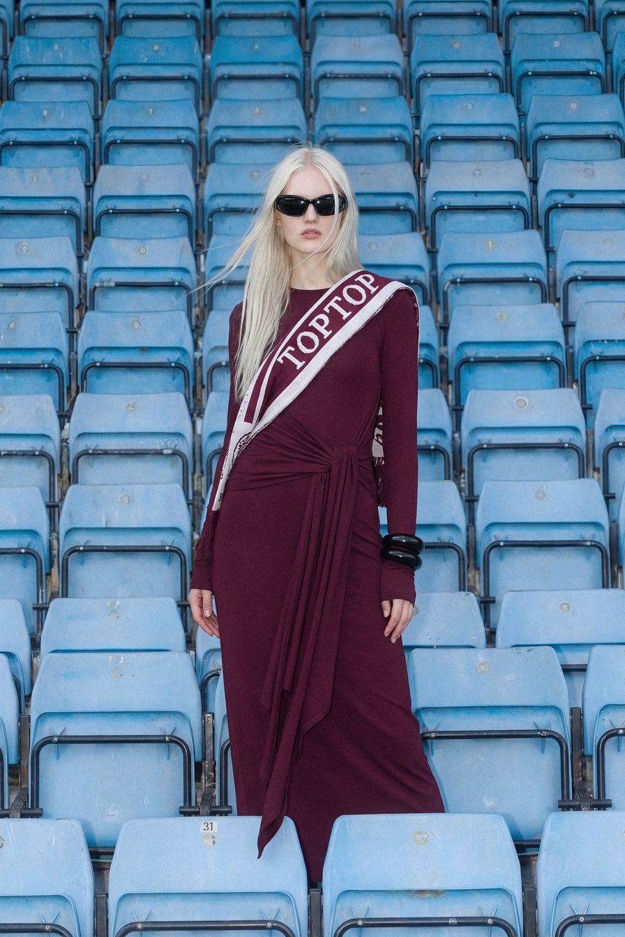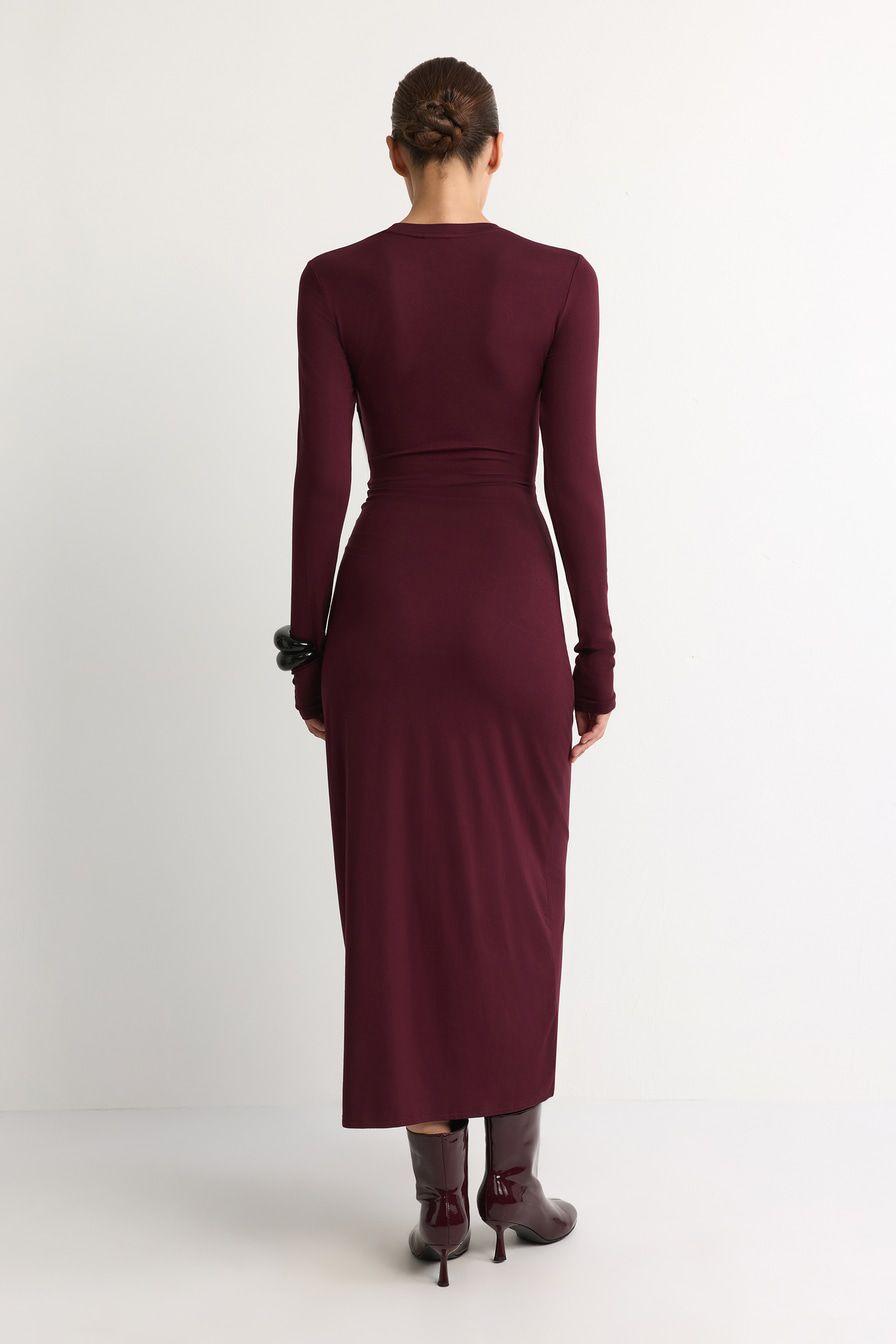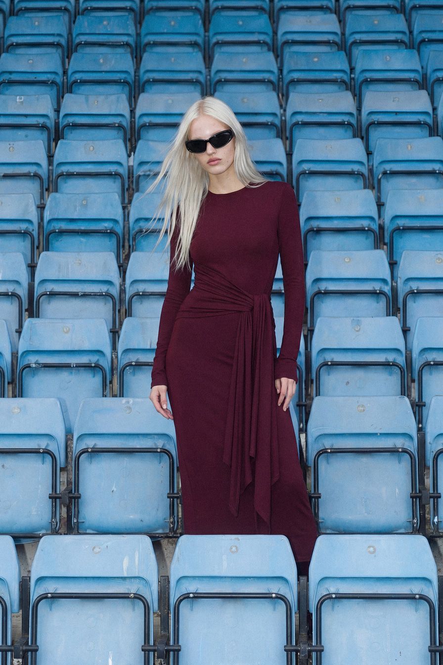 Бордовое трикотажное платье из смесовой вискозы – модель облегающего кроя с завязками на поясе.