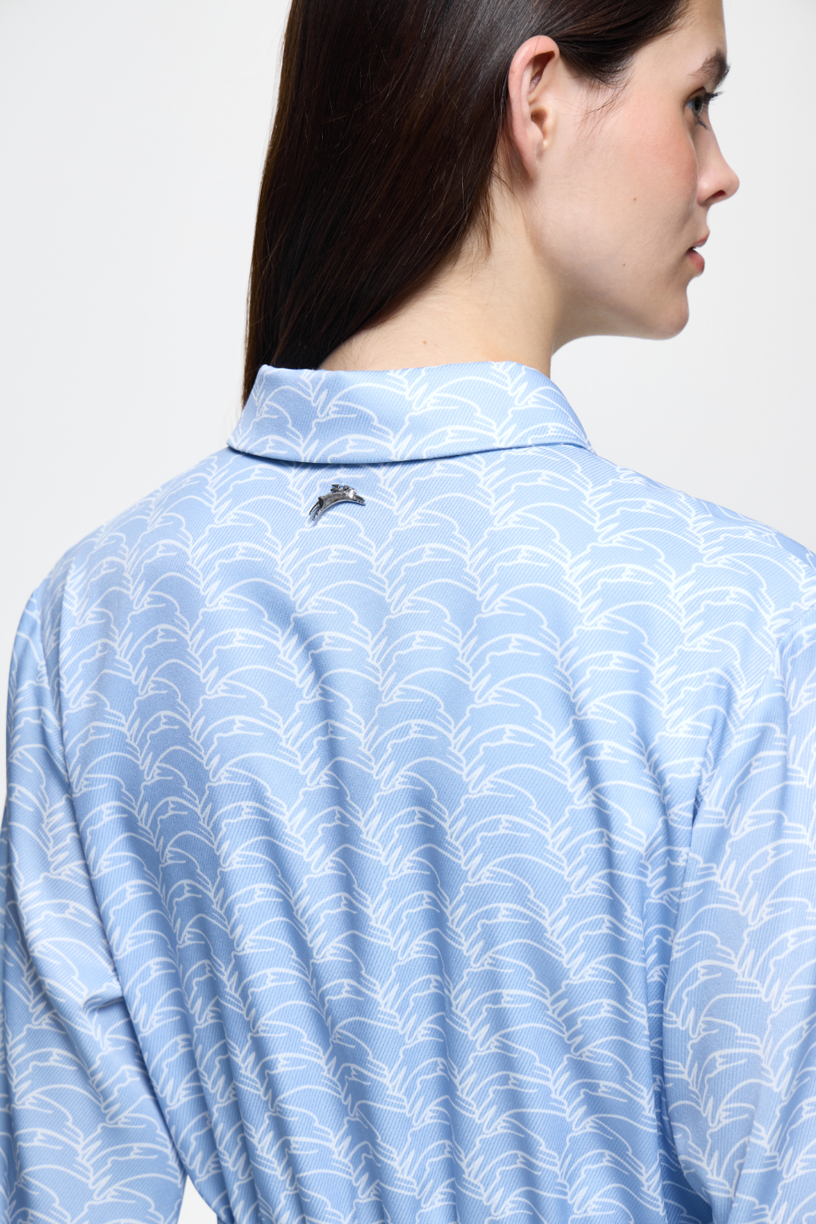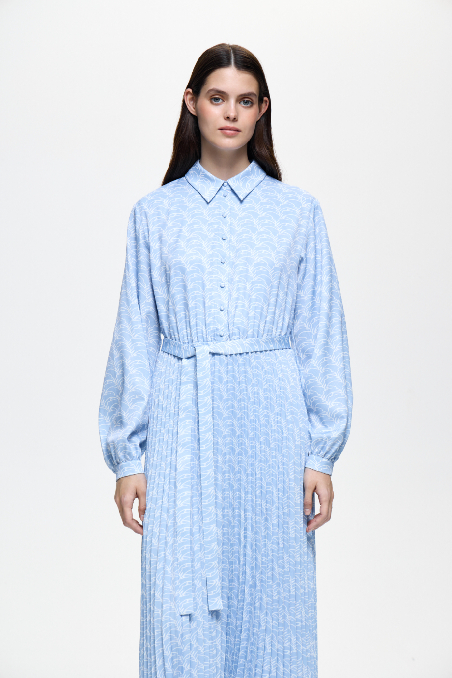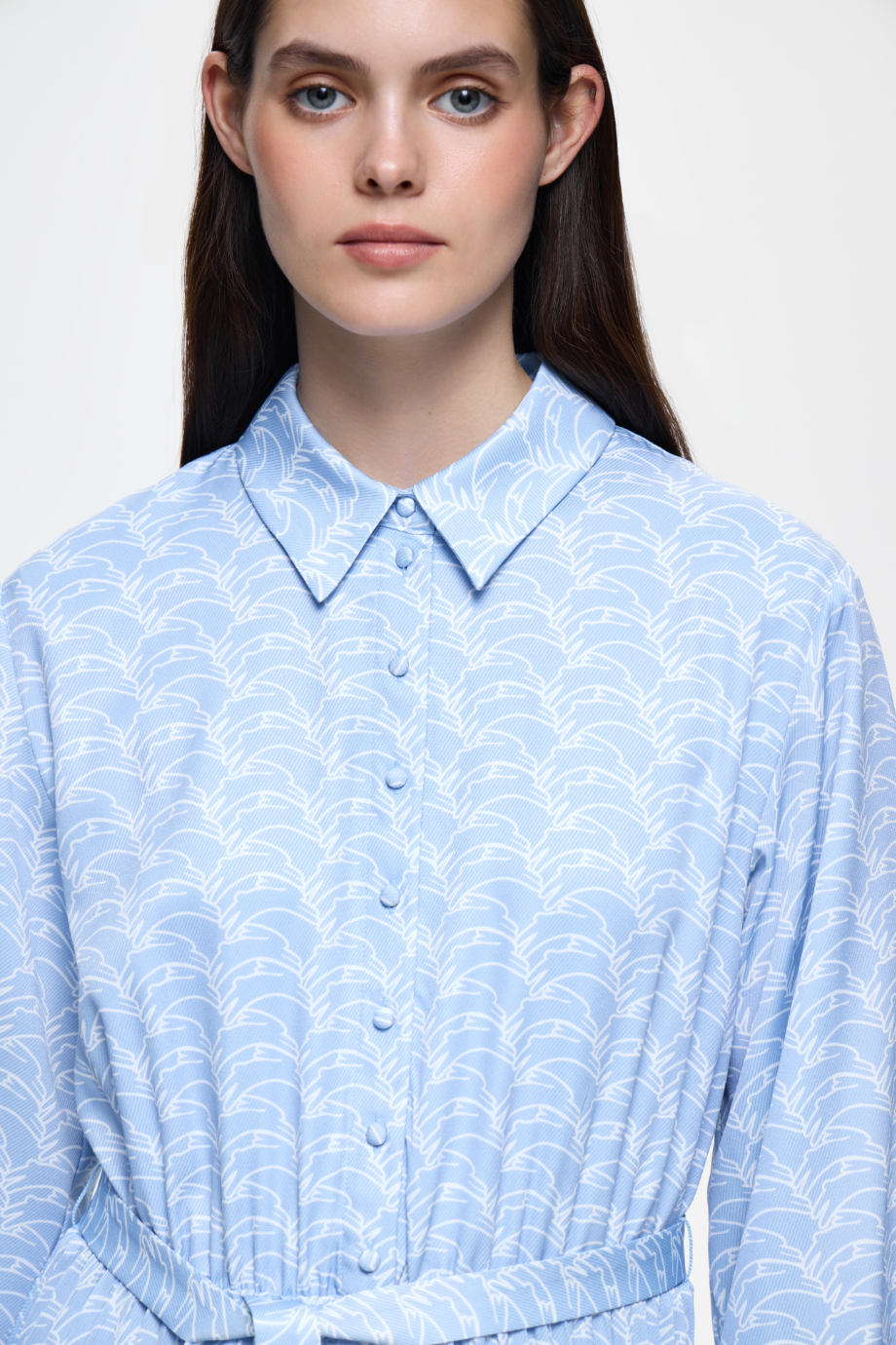 Платье-рубашка — идеальный выбор для создания стильного образа. Голубой цвет с интересным паттерном придаёт платью уникальность и яркость. Удобная модель подойдёт для различных повседневных ситуаций.