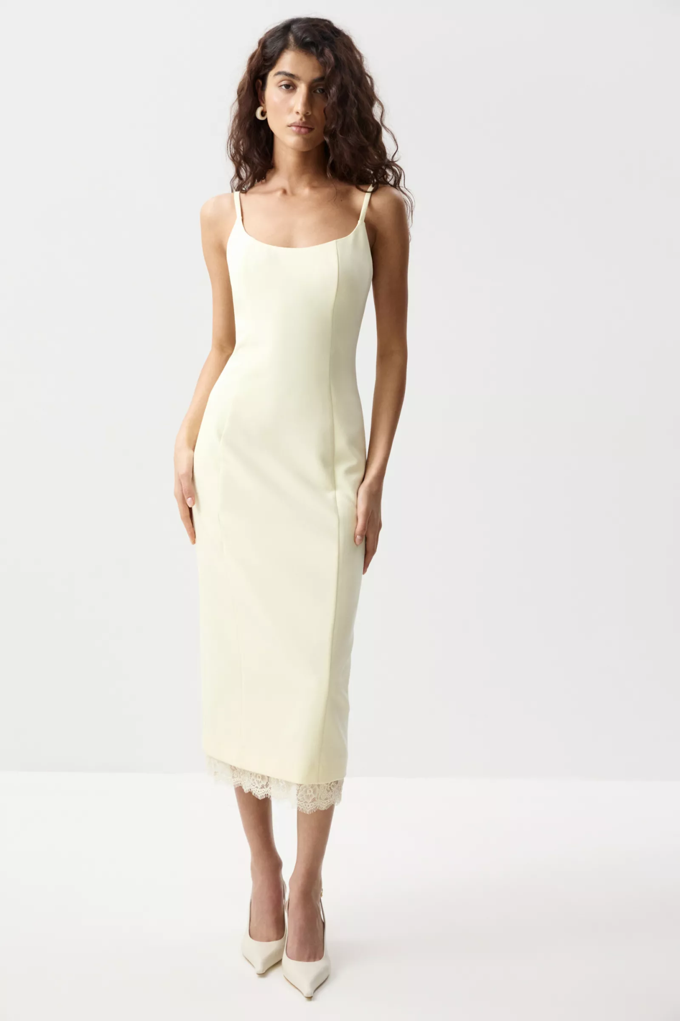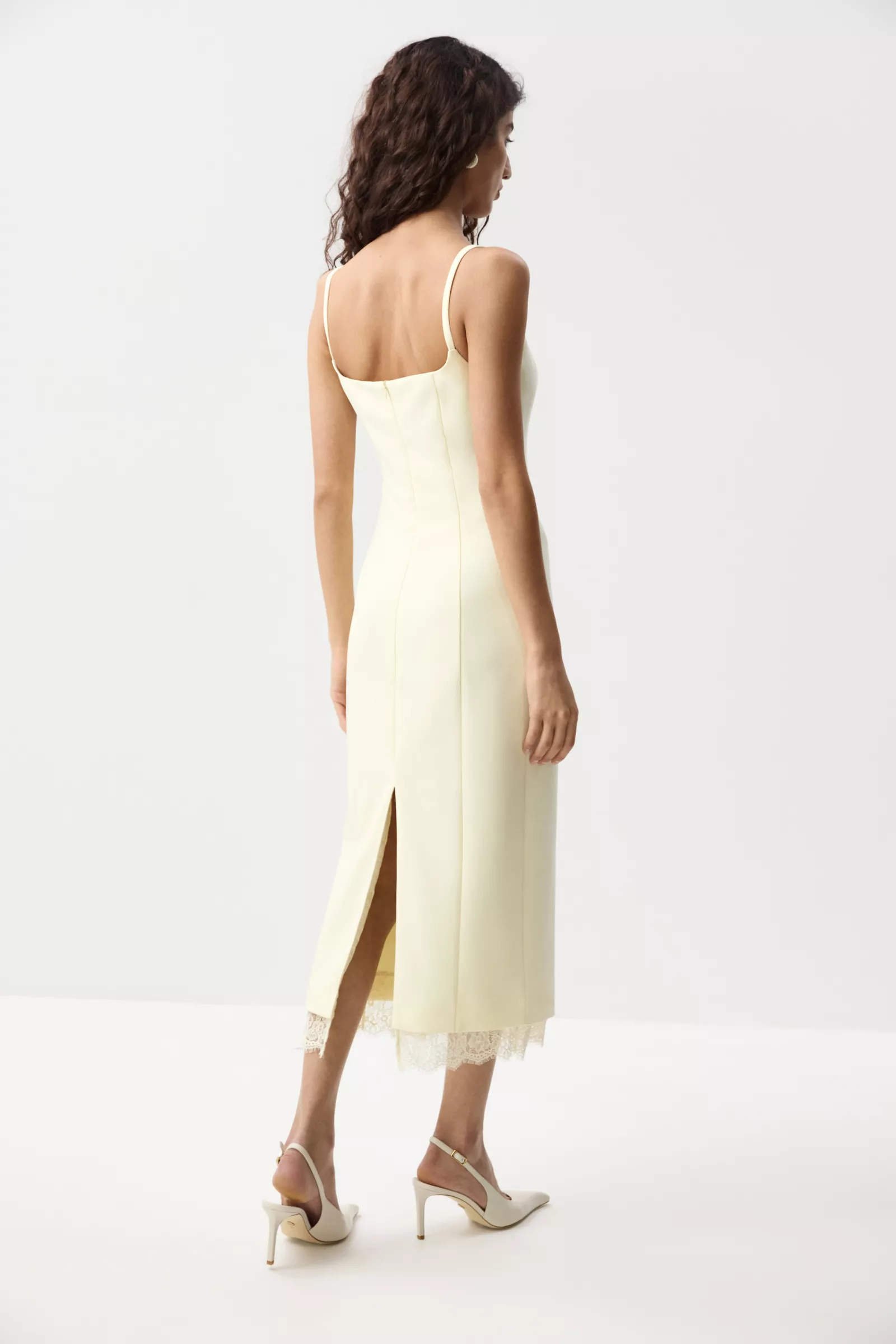 Платье макси из костюмной ткани на бретелях с кружевной отделкой по низу. Вертикальные рельеф образуют вытянутый силуэт, а глубокая горловина и тонкие бретели акцентируют внимание на декольте. Платье на отлетной подкладке с застежкой на потайную молнию в среднем шве спинки. По спинке разрез, для удобства ходьбы.