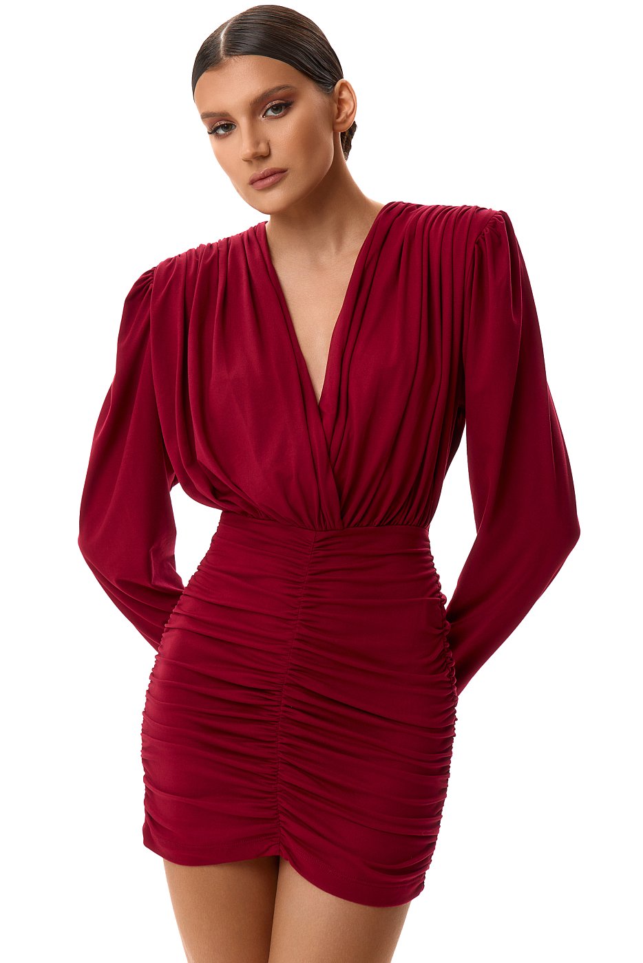 Изысканный и яркий элемент гардероба, который подчеркнёт вашу индивидуальность. Бордовый цвет платья придаёт образу элегантность, делая его подходящим для различных мероприятий. Увеличенные плечи добавляют платью уникальности и оригинальности, создавая интересный акцент. Вырез подчёркивает линию шеи, а драпировки на юбке придают платью изящность и плавность форм. Это платье станет отличным выбором для тех, кто хочет выглядеть стильно и запоминающееся.