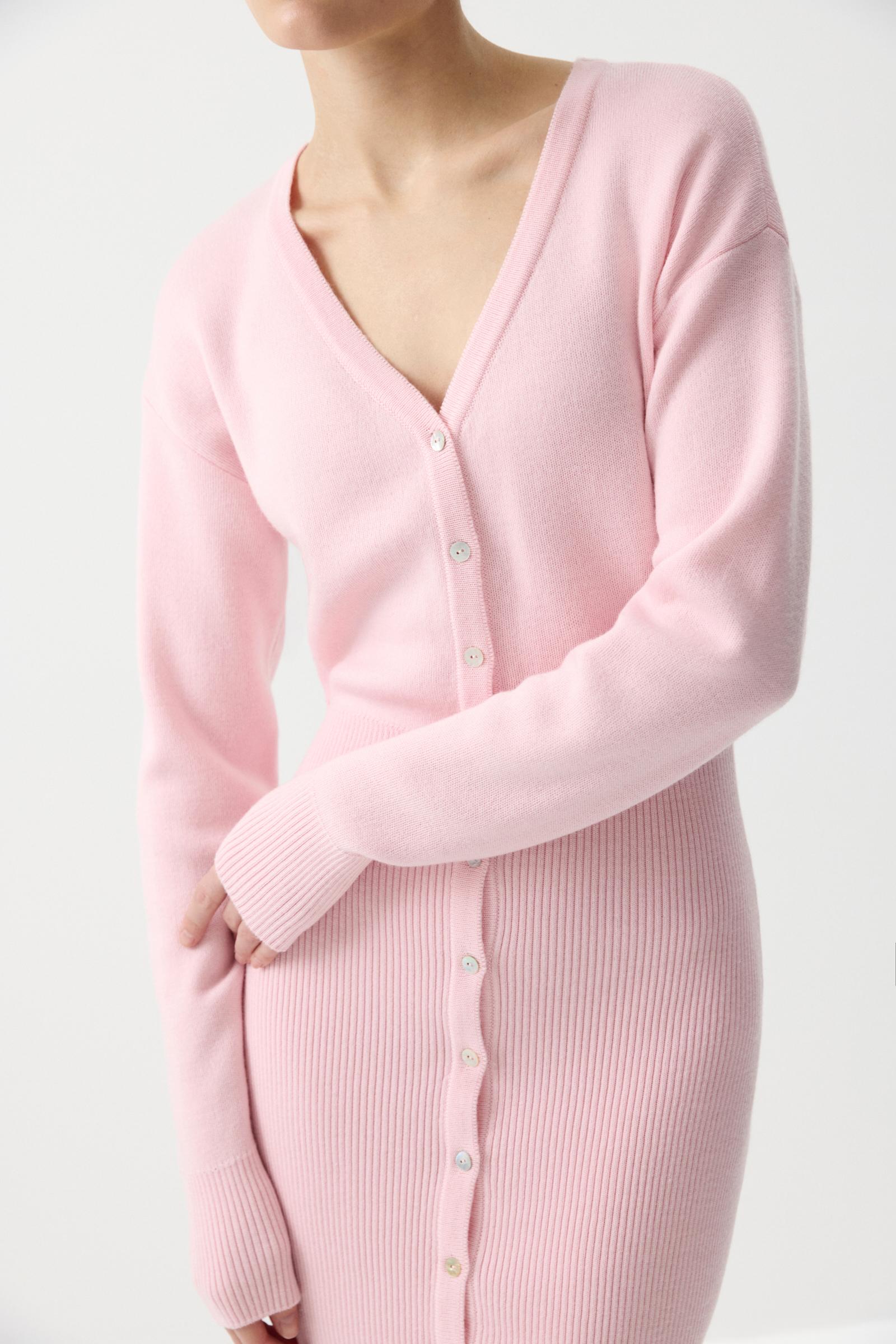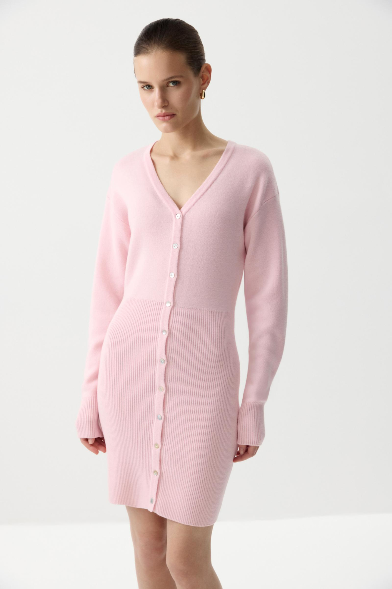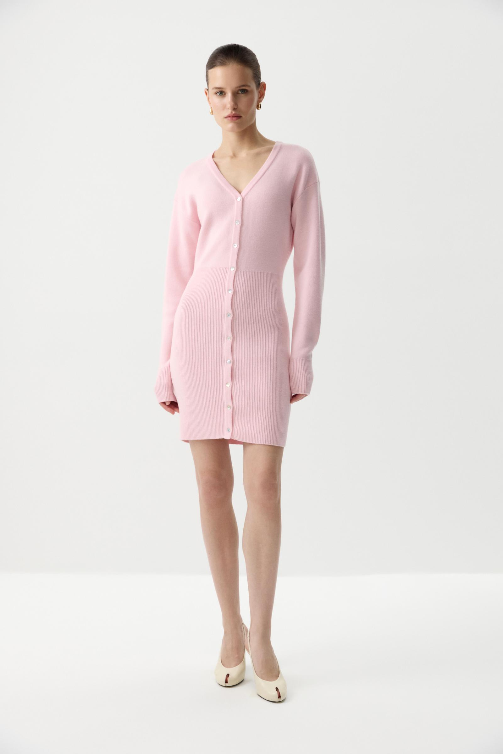 Вязаное платье из мягкой пряжи с шерстью мериноса в составе. Мини платье облегающего силуэта с V-образным вырезом, визуально подчеркивающим шею. Застежка на планку и пуговицы. Спущенная линия плеча и широкий рубчик по низу изделия плотно прилегает к тело и подчеркивает фигуру. Длинный рукав с широкой эластичной резинкой по низу.