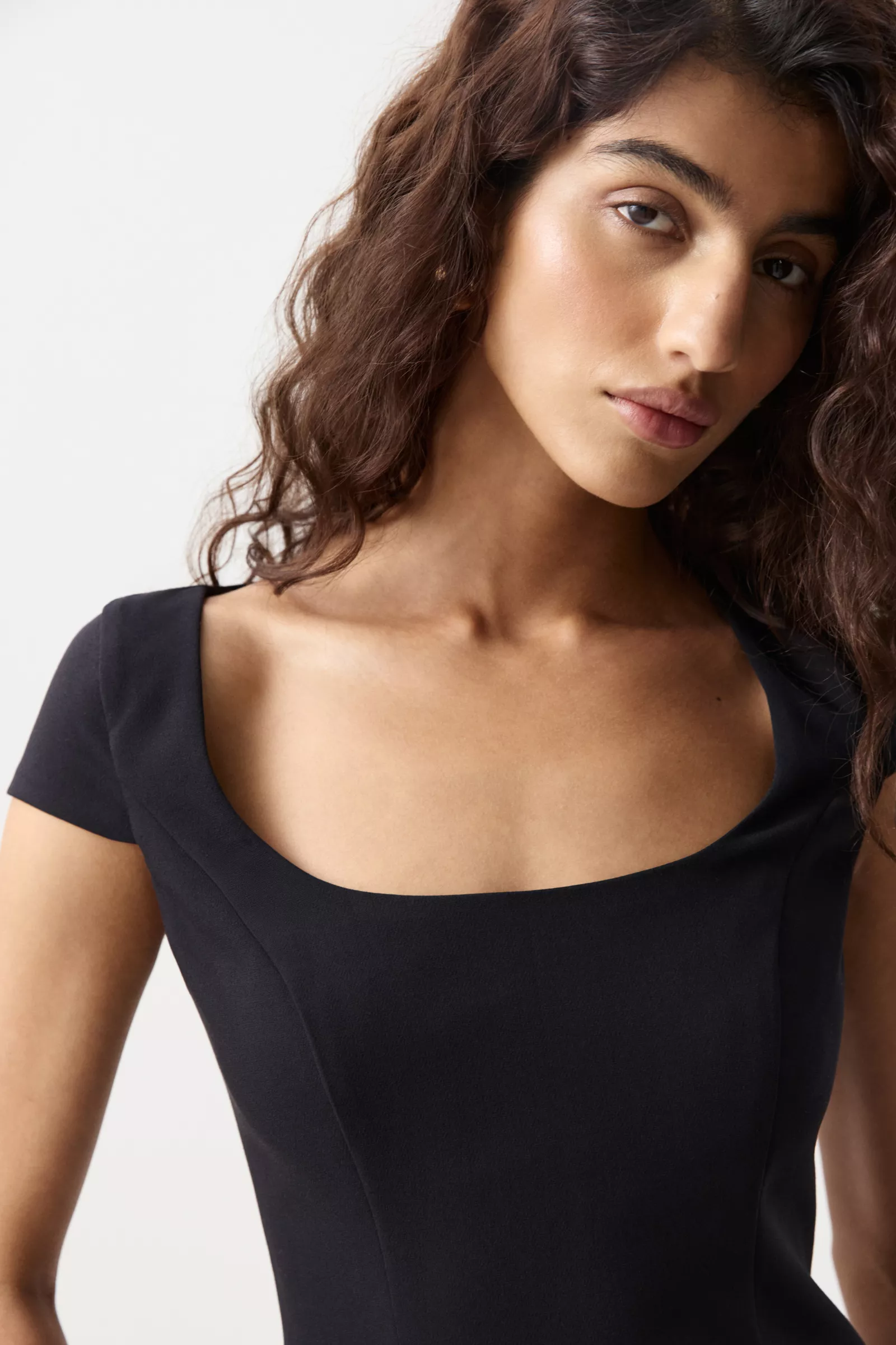 Платье мини с коротким рукавом. Платье из плотной костюмной ткани с вертикальными рельефами, подчеркивающими естественные изгибы фигуры. Короткий рукав и глубокая округлая горловина подчеркивает линию плеч и ключиц. Платье на подкладке с застежкой в среднем шве спинки.