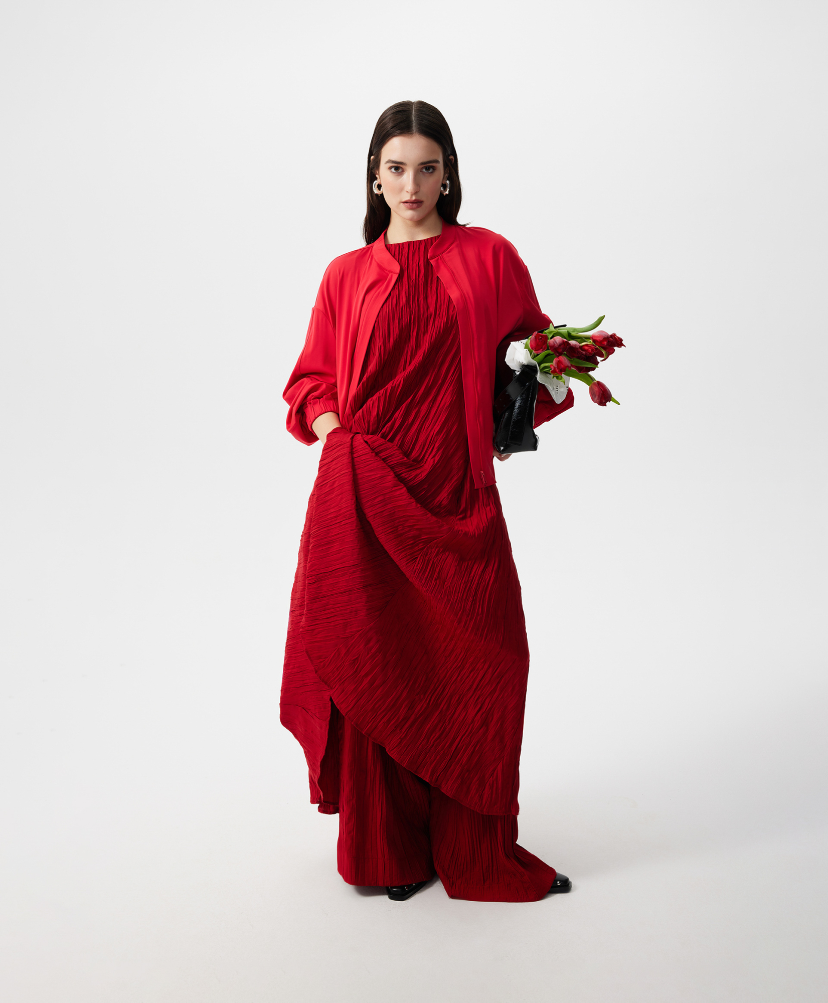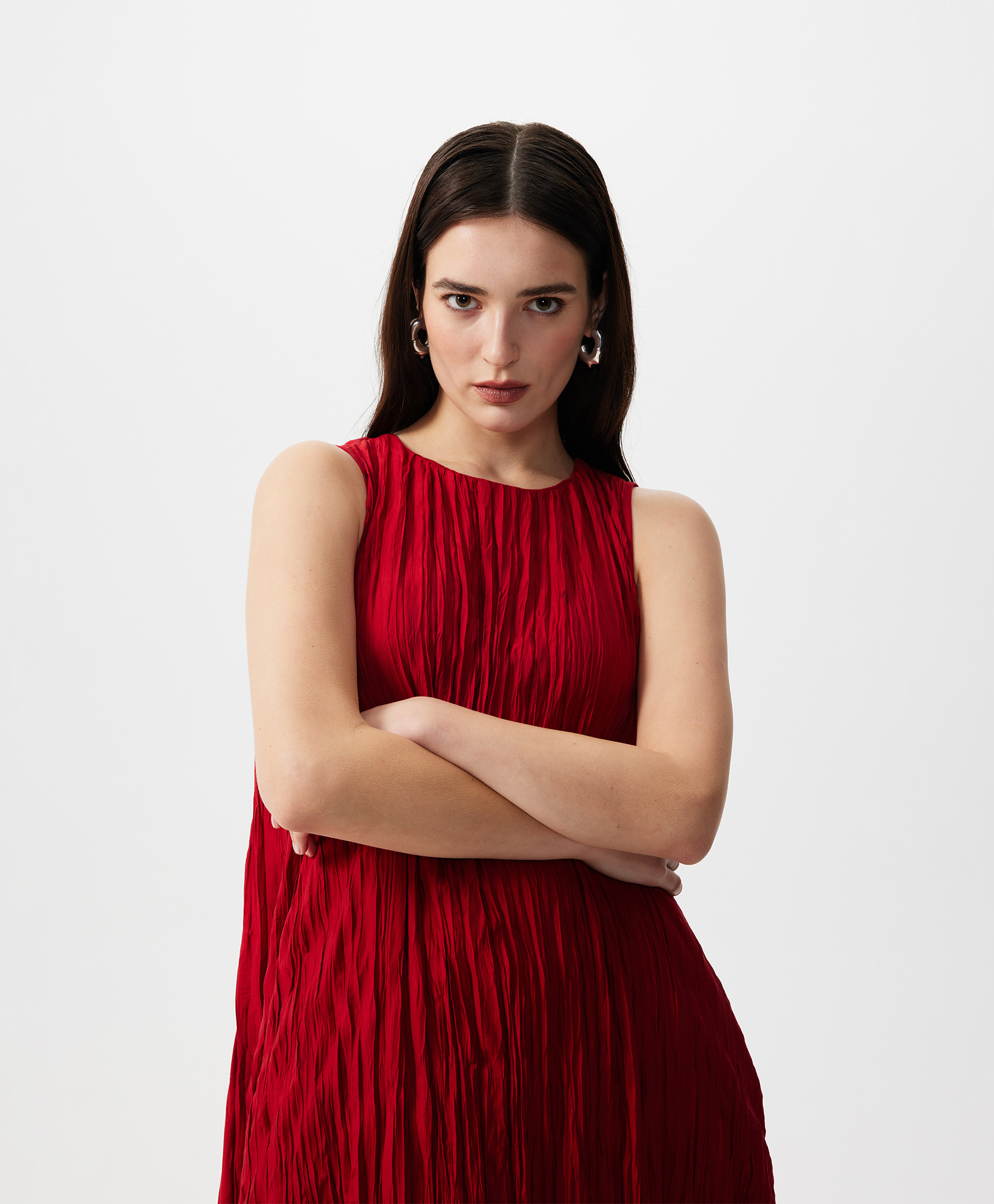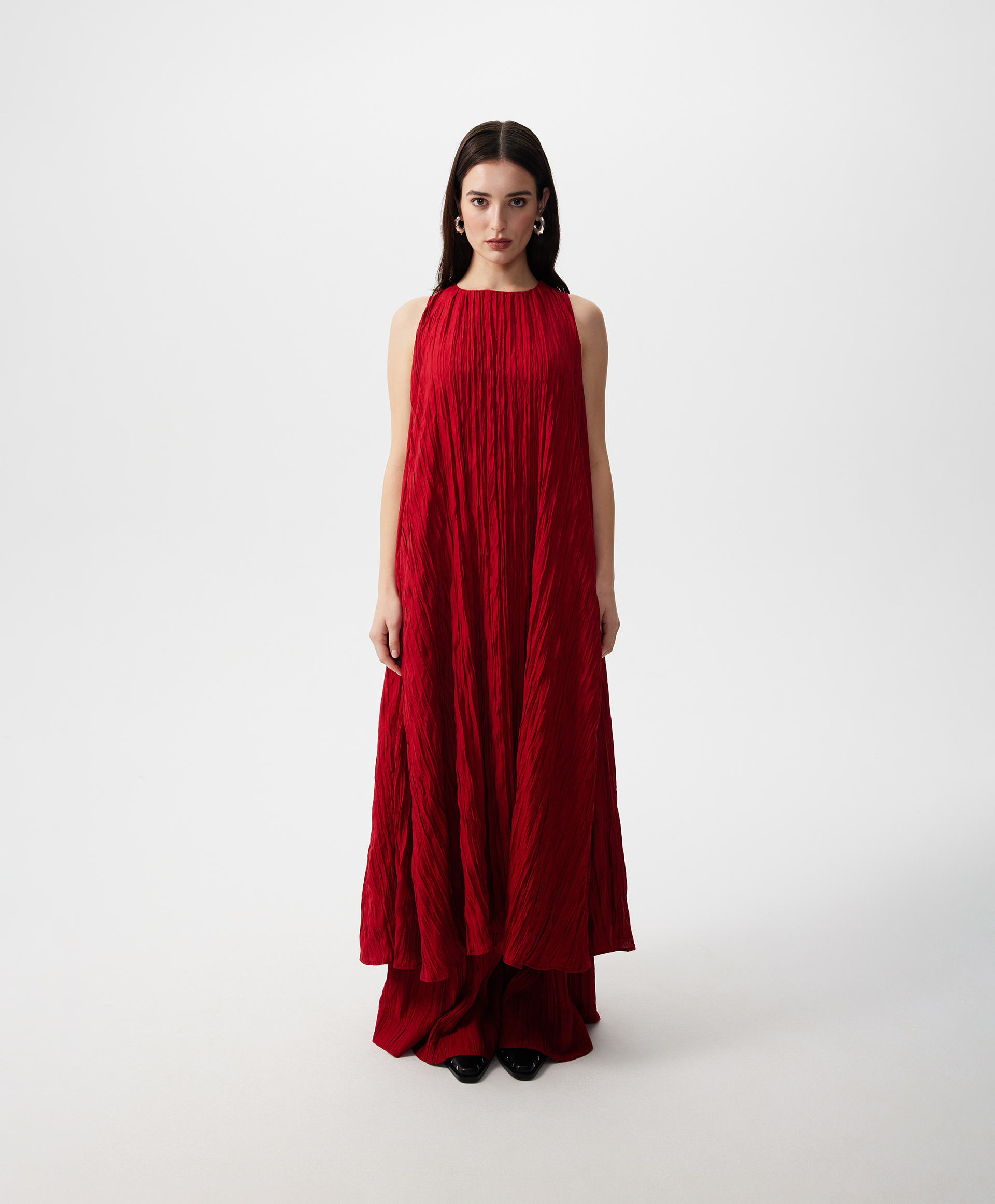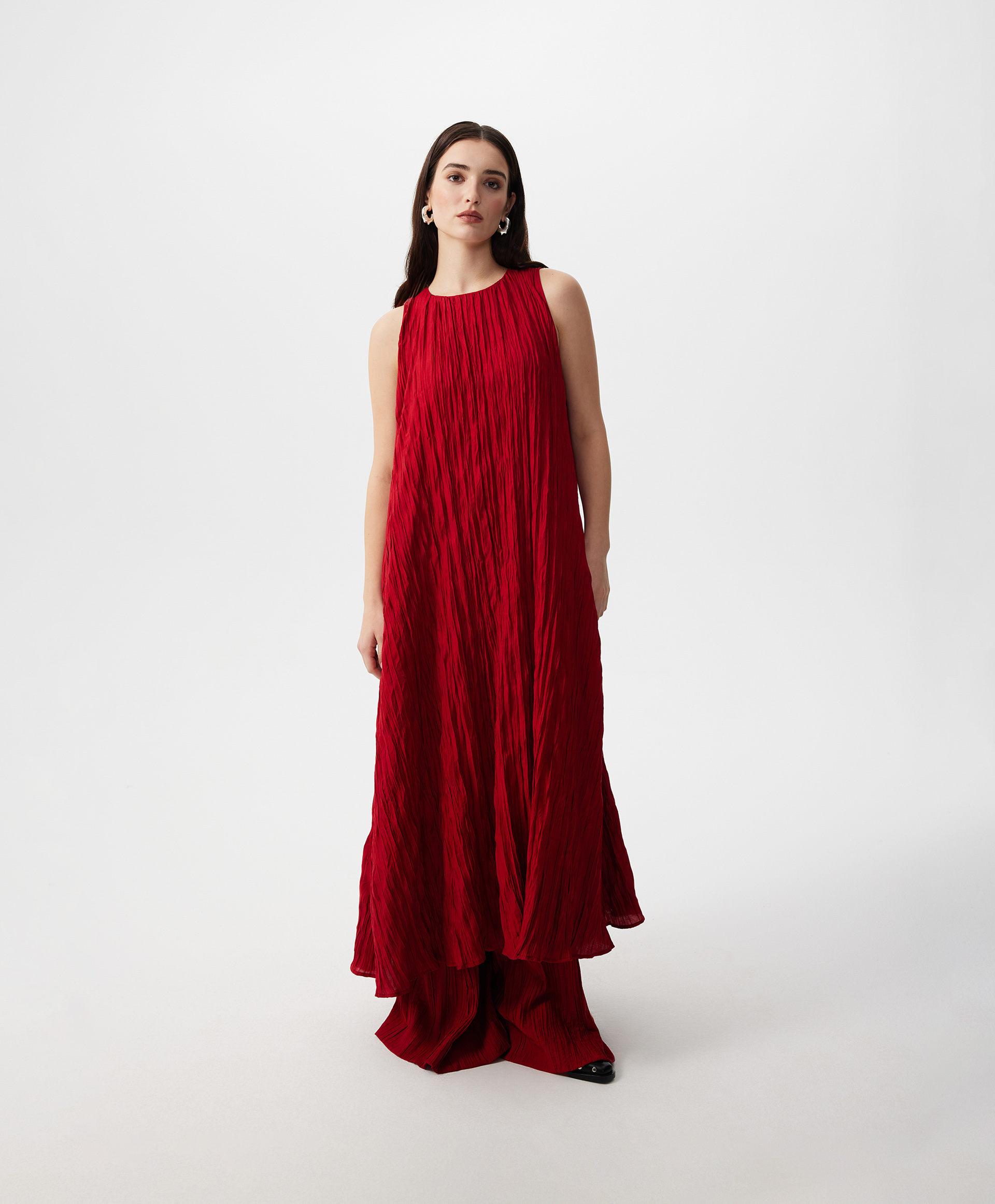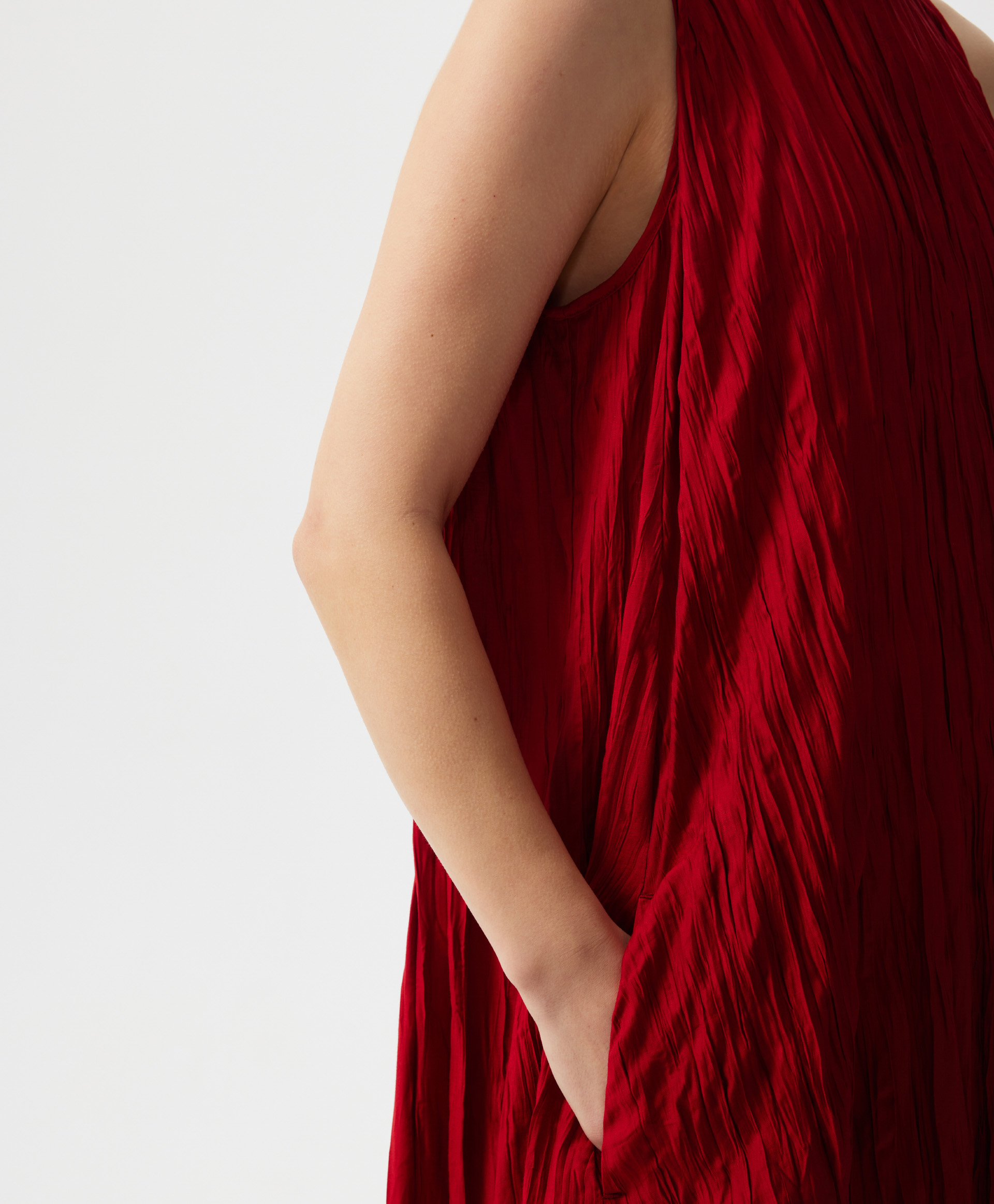 Модное платье-сарафан с жатым эффектом - стильная запоминающаяся вещь, способная придать образу женщины остроту и экстравагантность! Платье макси трапециевидного силуэта выполнено из вискозного текстиля с интересной объемной структурой, играющего всеми гранями хаотичных складок, заминов, заломов. Модный цвет из палитры глубоких, насыщенных цветочных красных оттенков иллюстрирует эмоциональный подъем, вселяет уверенность и делает женщину сильнее. Оформление задней части горловины капелькой имеет не только важное утилитарное значение, но и играет декоративную роль. Длинные бейки, завязанные на бант или узел, фиксируют каплевидный разрез и создают шлейфовый эффект при движении. Платье имеет карманы в боковых швах для комфортной эксплуатации.