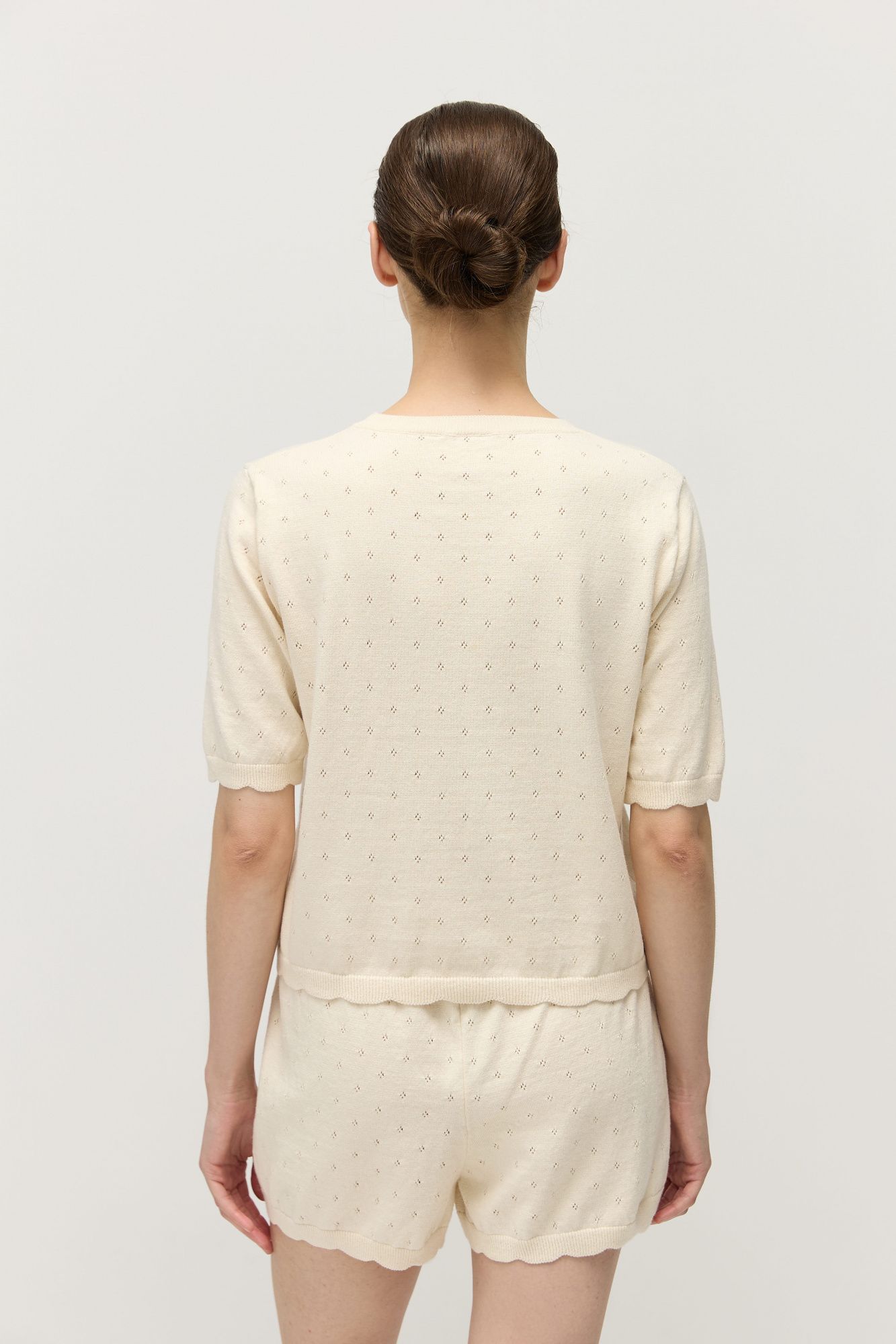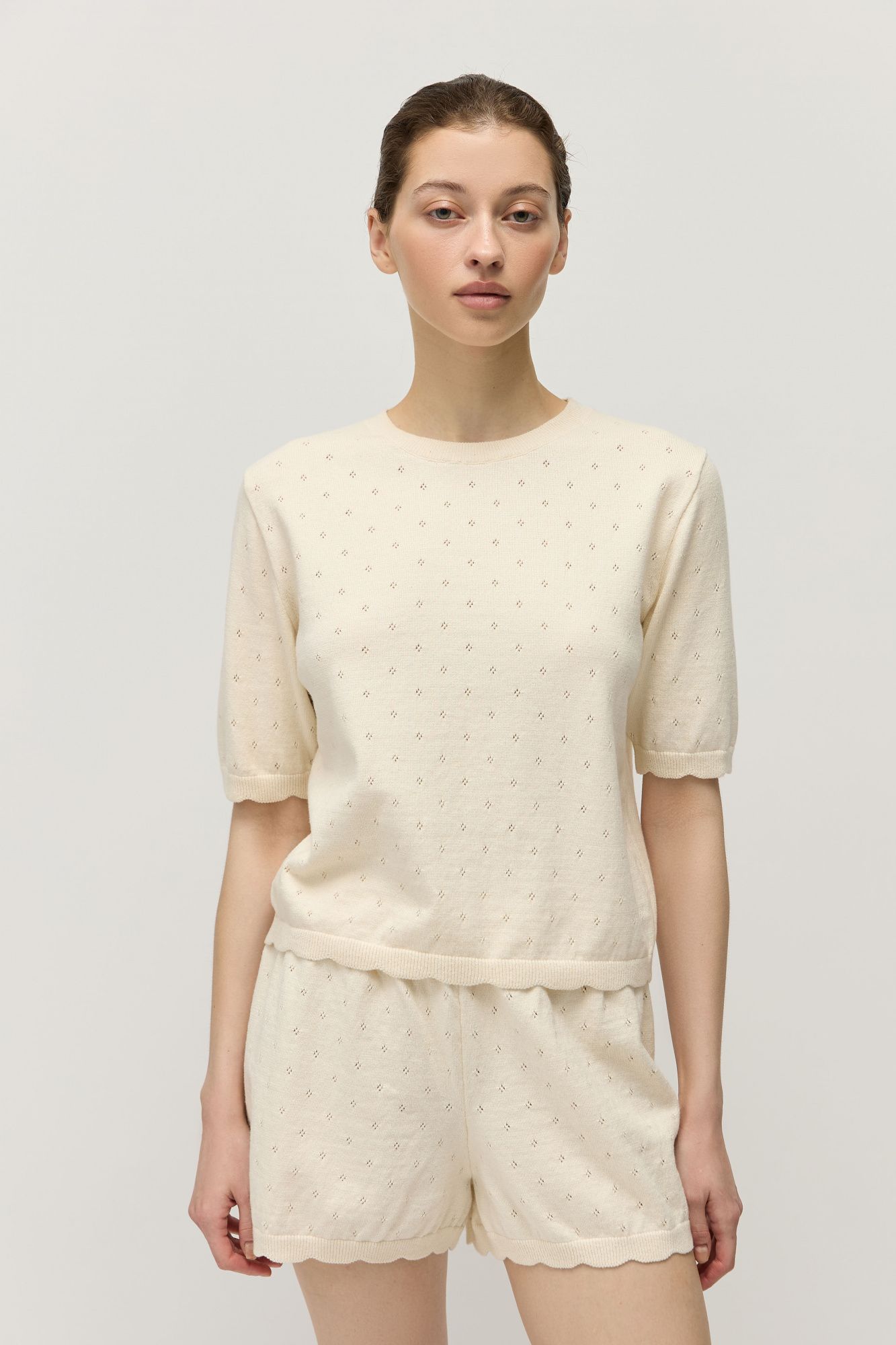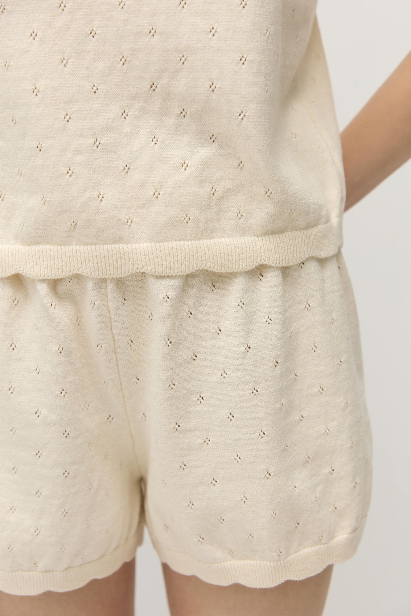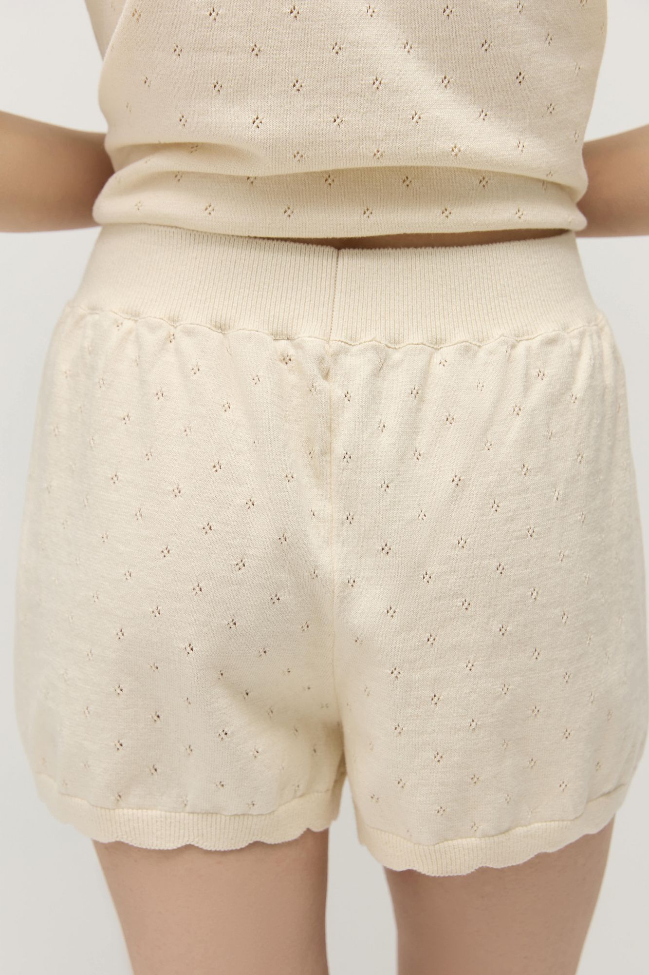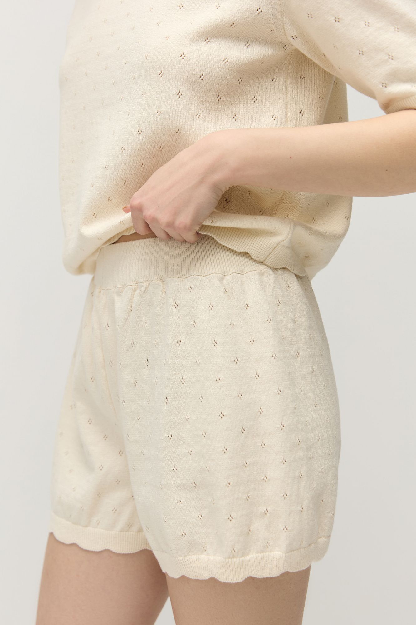 У шорт высокая посадка, комфортный пояс на резинке. По низу шорт вывязаны фестоны, которые слегка заужают брючины, придавая им О-образный силуэт.