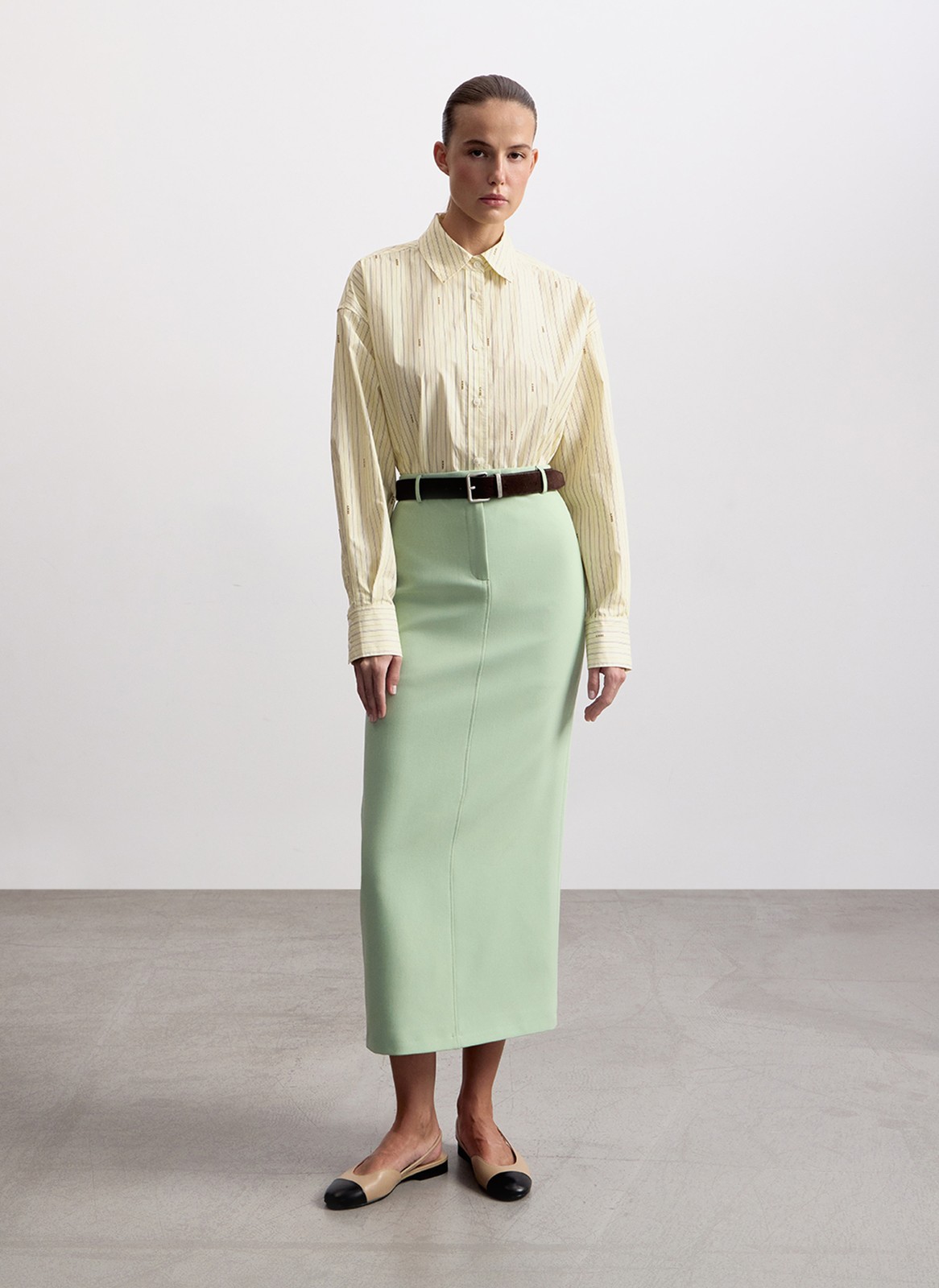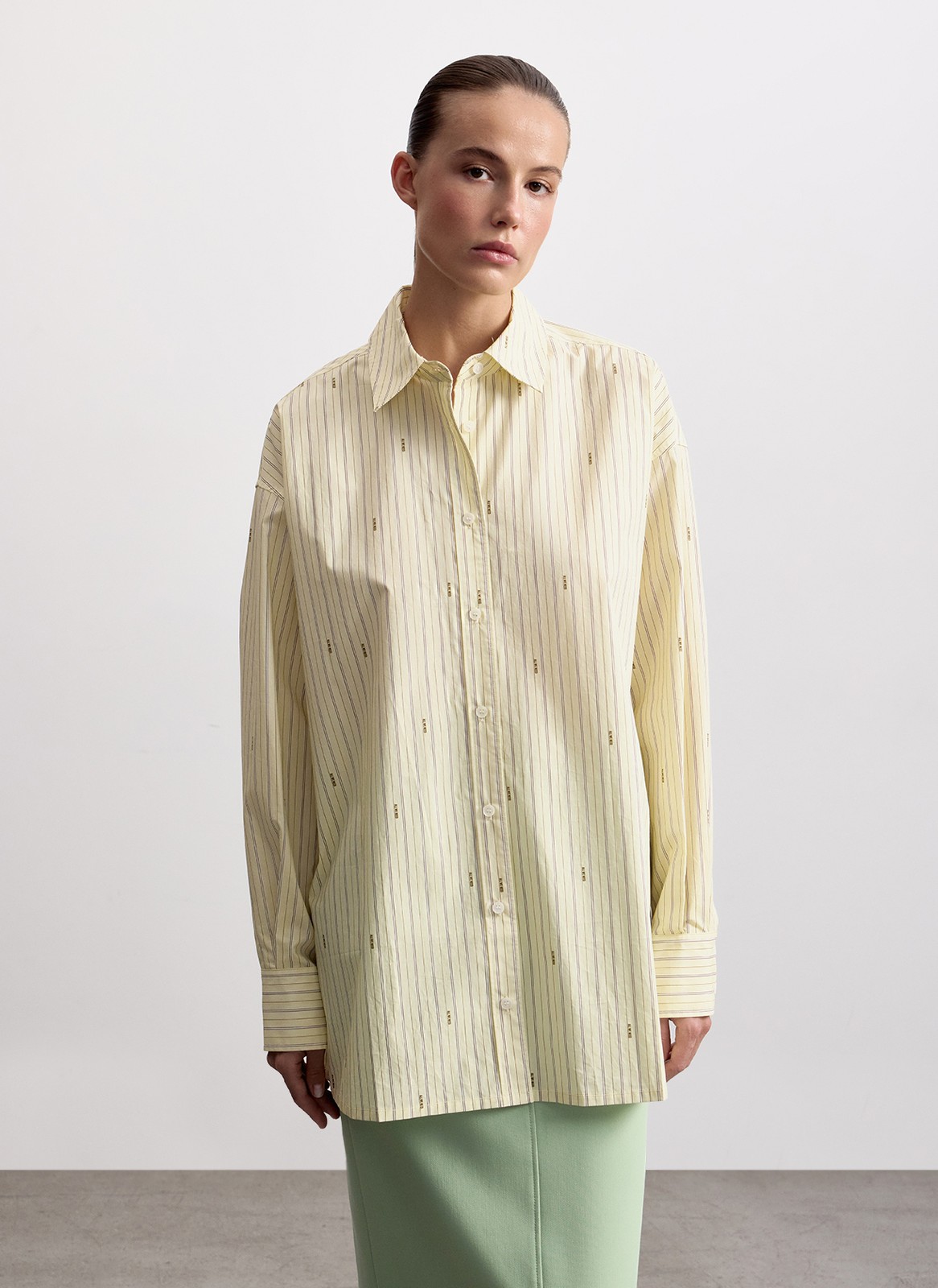 Рубашка прекрасно сочетается с прямыми брюками, джинсами или юбками из нашей капсулы.