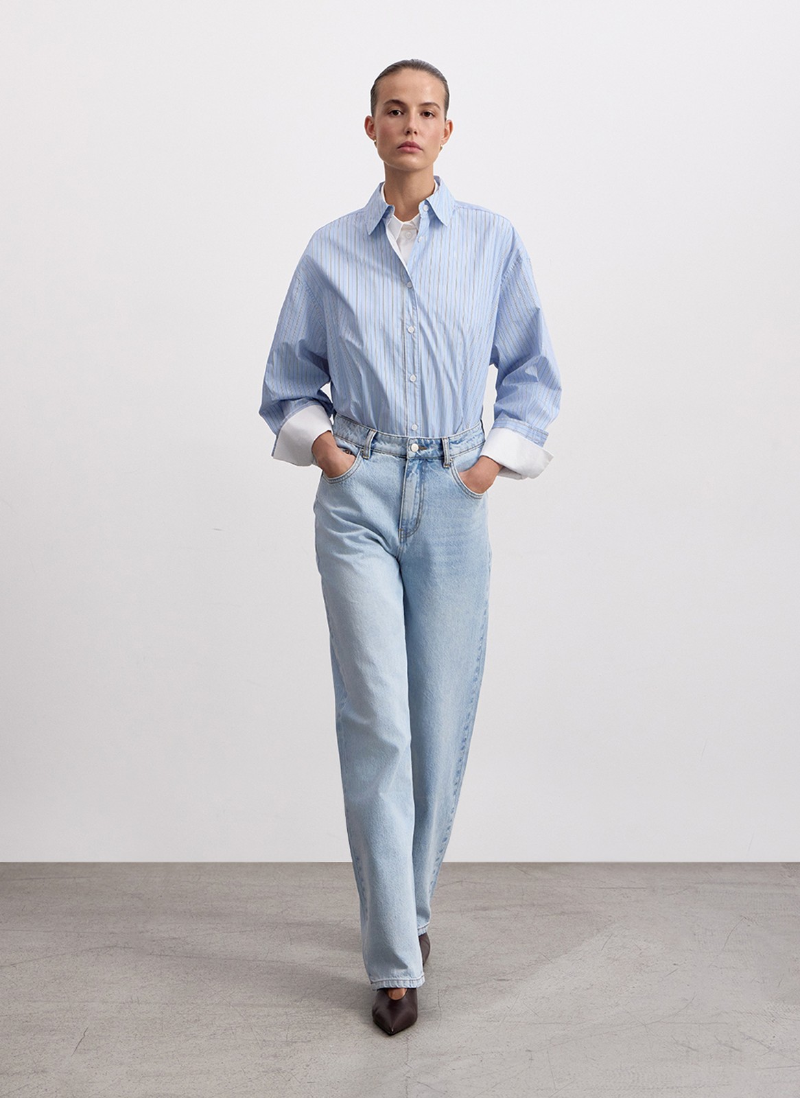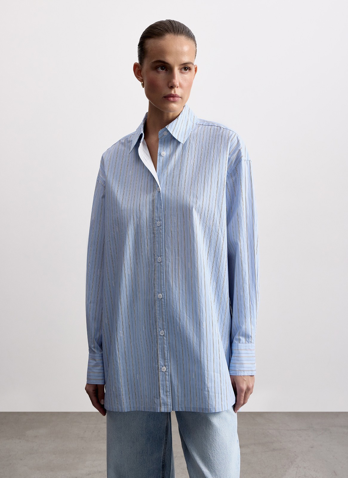 Рубашка прекрасно сочетается с прямыми брюками, джинсами или юбками из нашей капсулы.