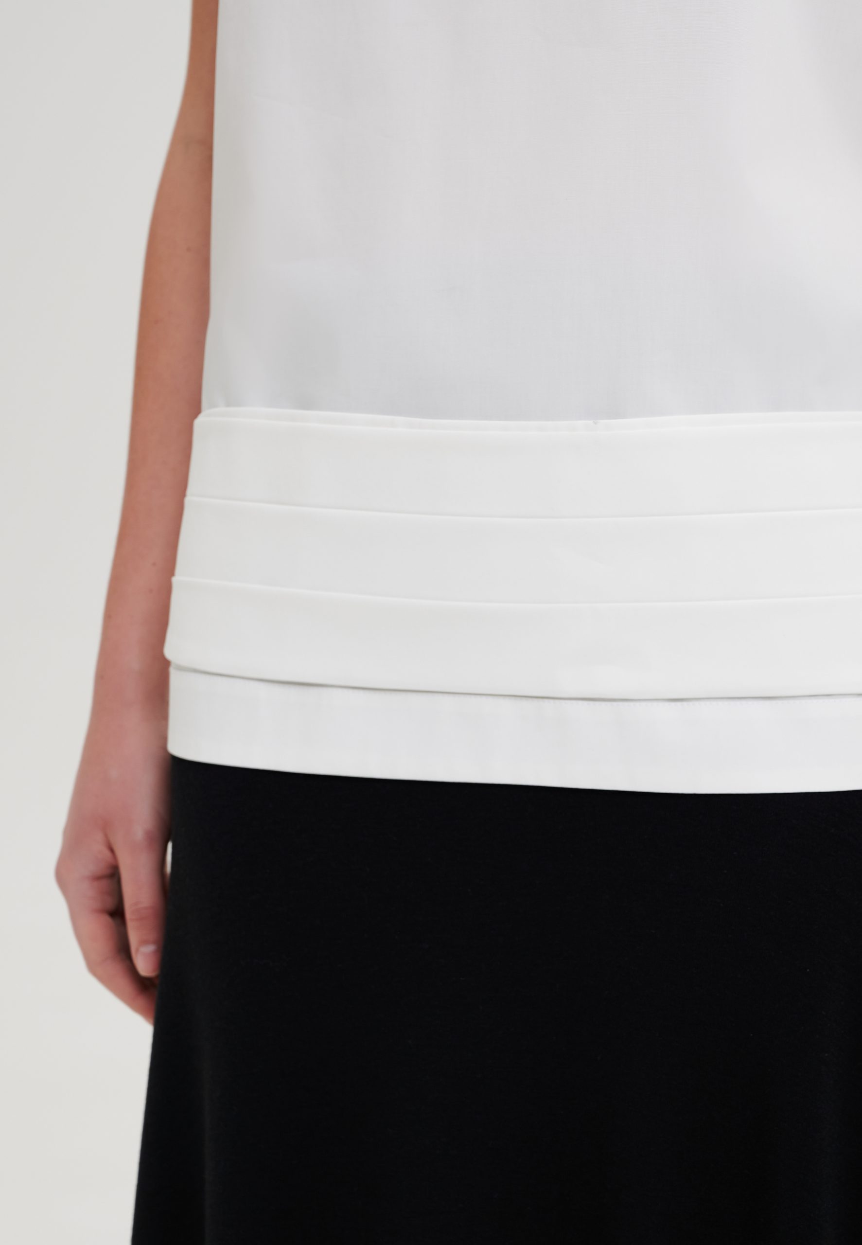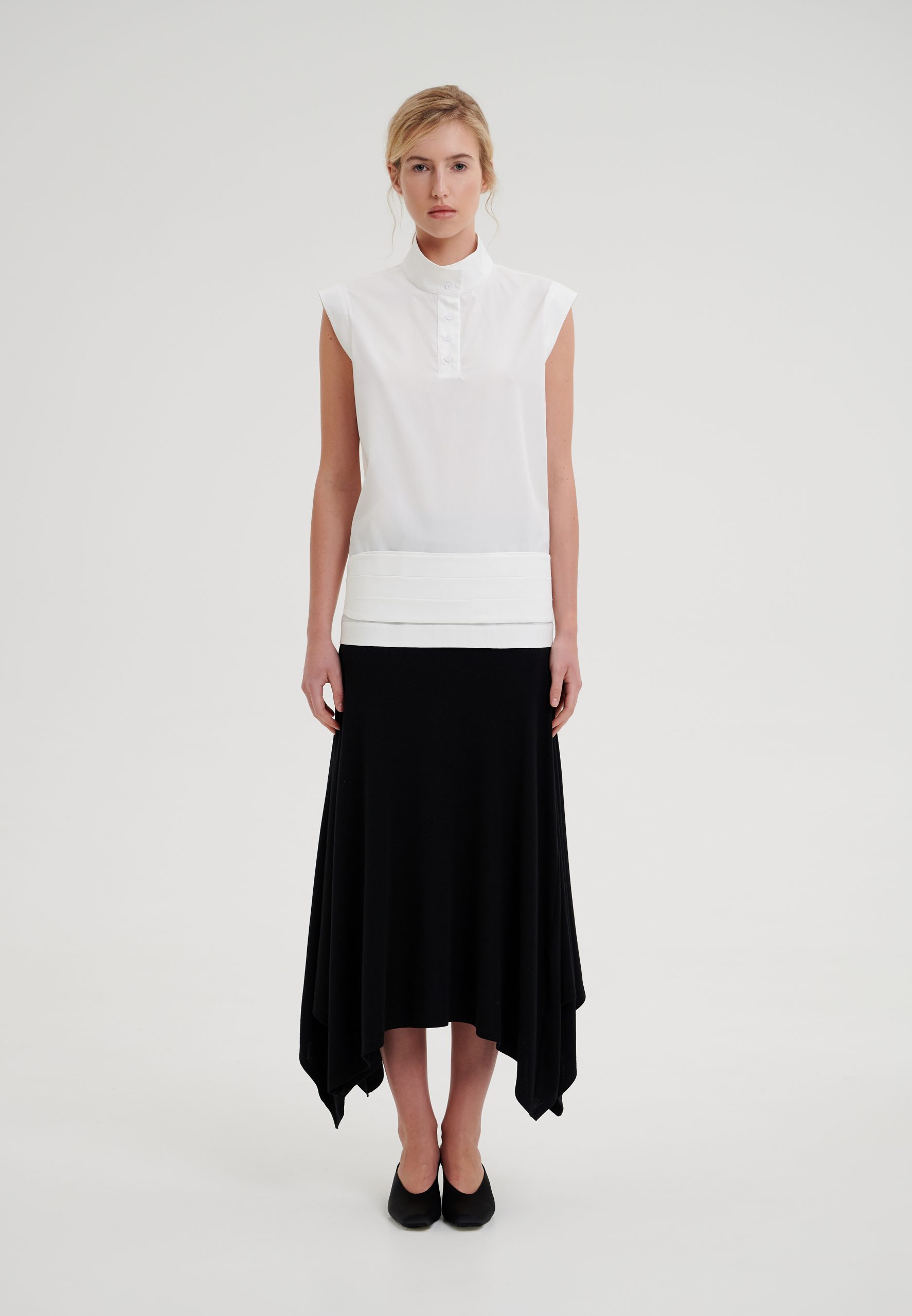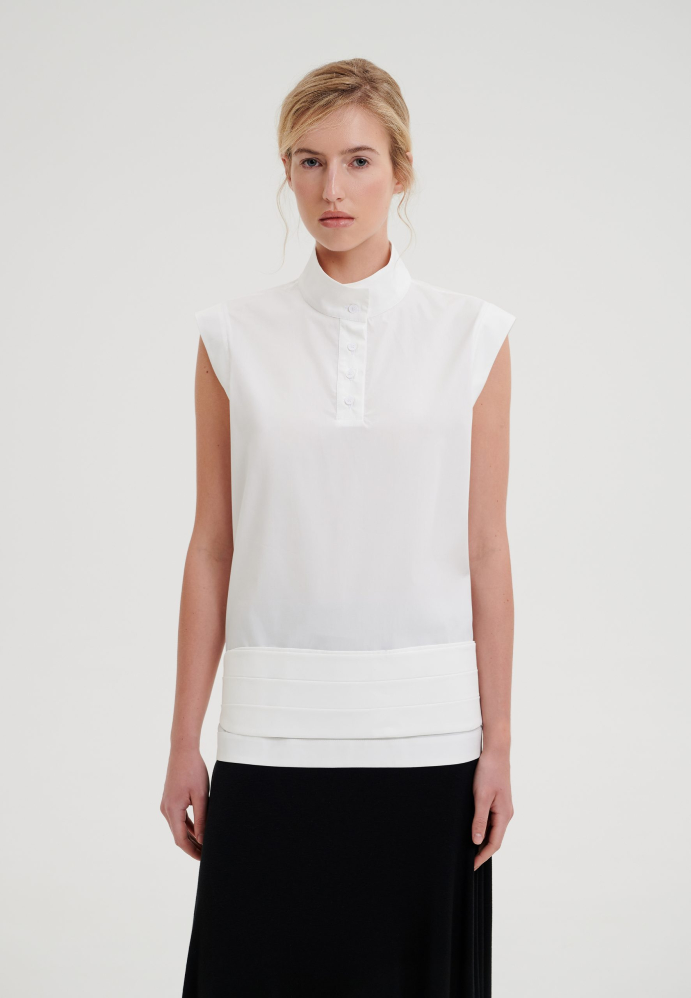 Белая рубашка со стойкой без рукавов – минималистичная модель с чистой архитектурой линий. Свободный крой создает акутальный силуэт и обеспечивает комфорт в течении всего дня. Рубашка выполнена из хлопка – легкого, дышащего и приятного к телу. Стойка застегивается на пуговицы. Обратная обтачка по низу изделия и по краю проймы добавляет аккуратности и завершенности, сохраняя четкую форму. Идаельная база для весенне – летнего гардероба.