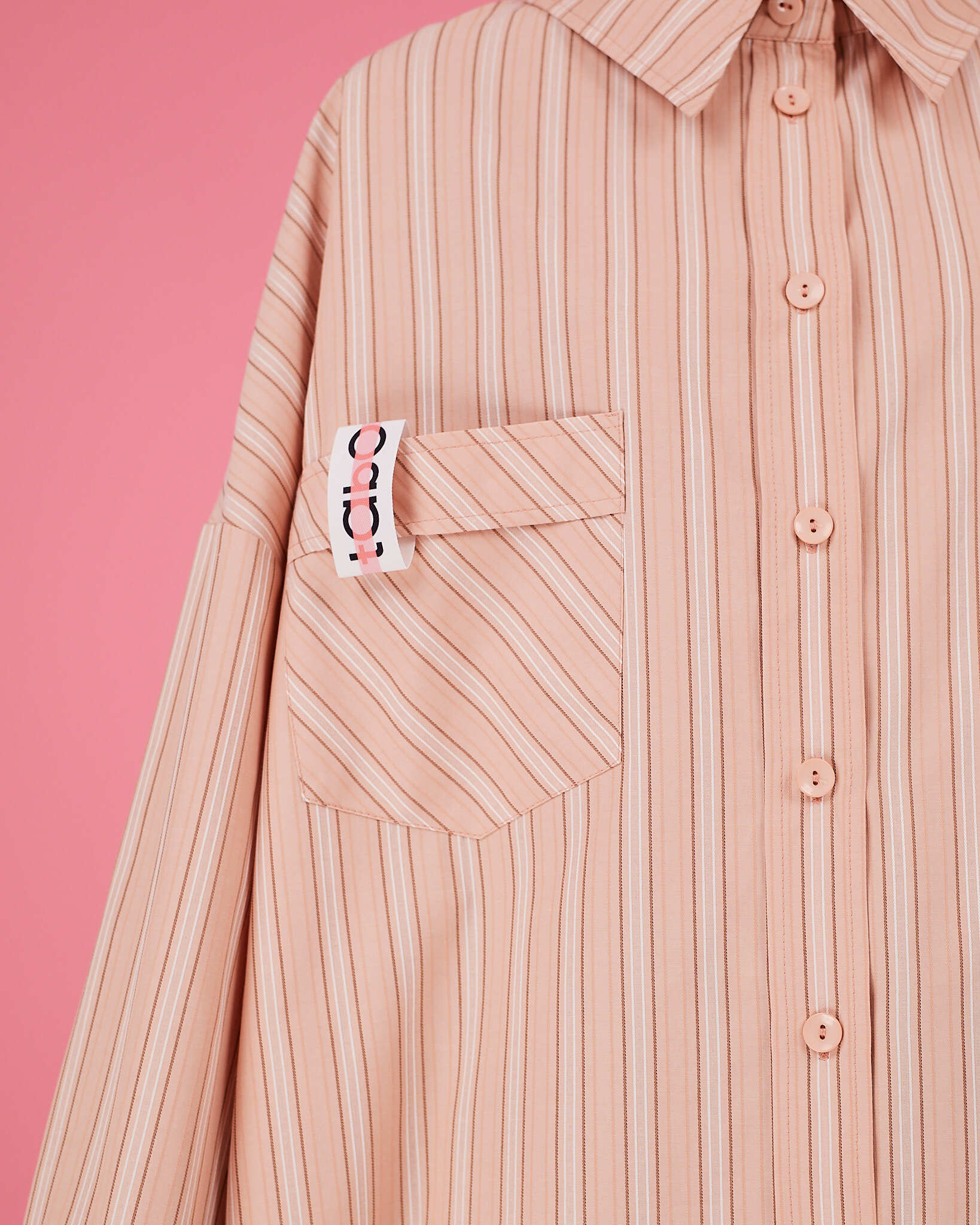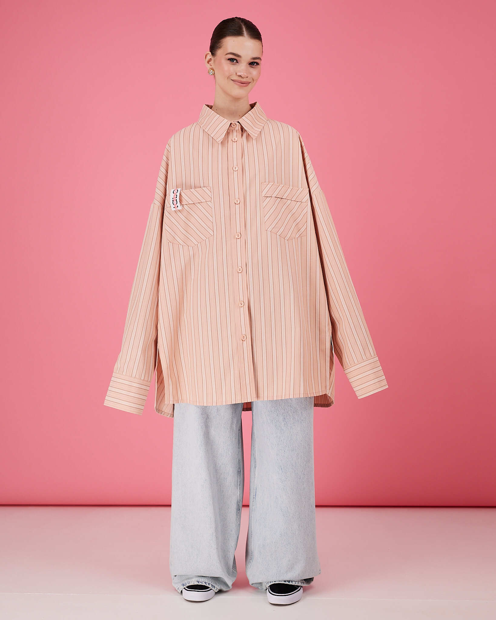 Рубашка прямого очень объемного силуэта имеет отложной воротник, кокетку и двойную складку на спинке. Рукава со складками на притачной манжете с застежкой на пуговицу. Линия низа немного скруглена. В боковых швах разрезы обработаны киперной лентой с логотипом бренда. Два передних кармана, на одном из которых логотип бренда.