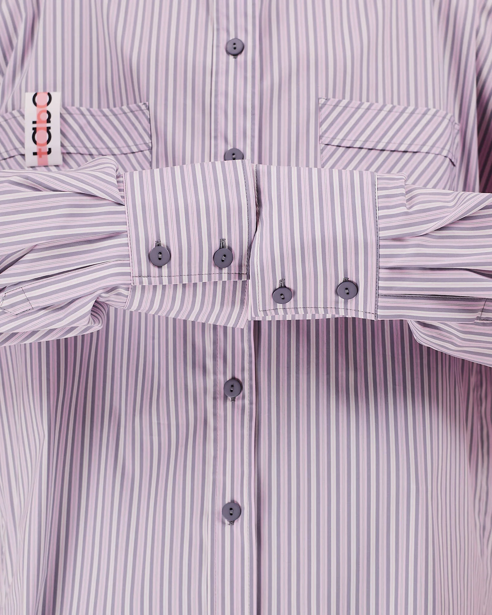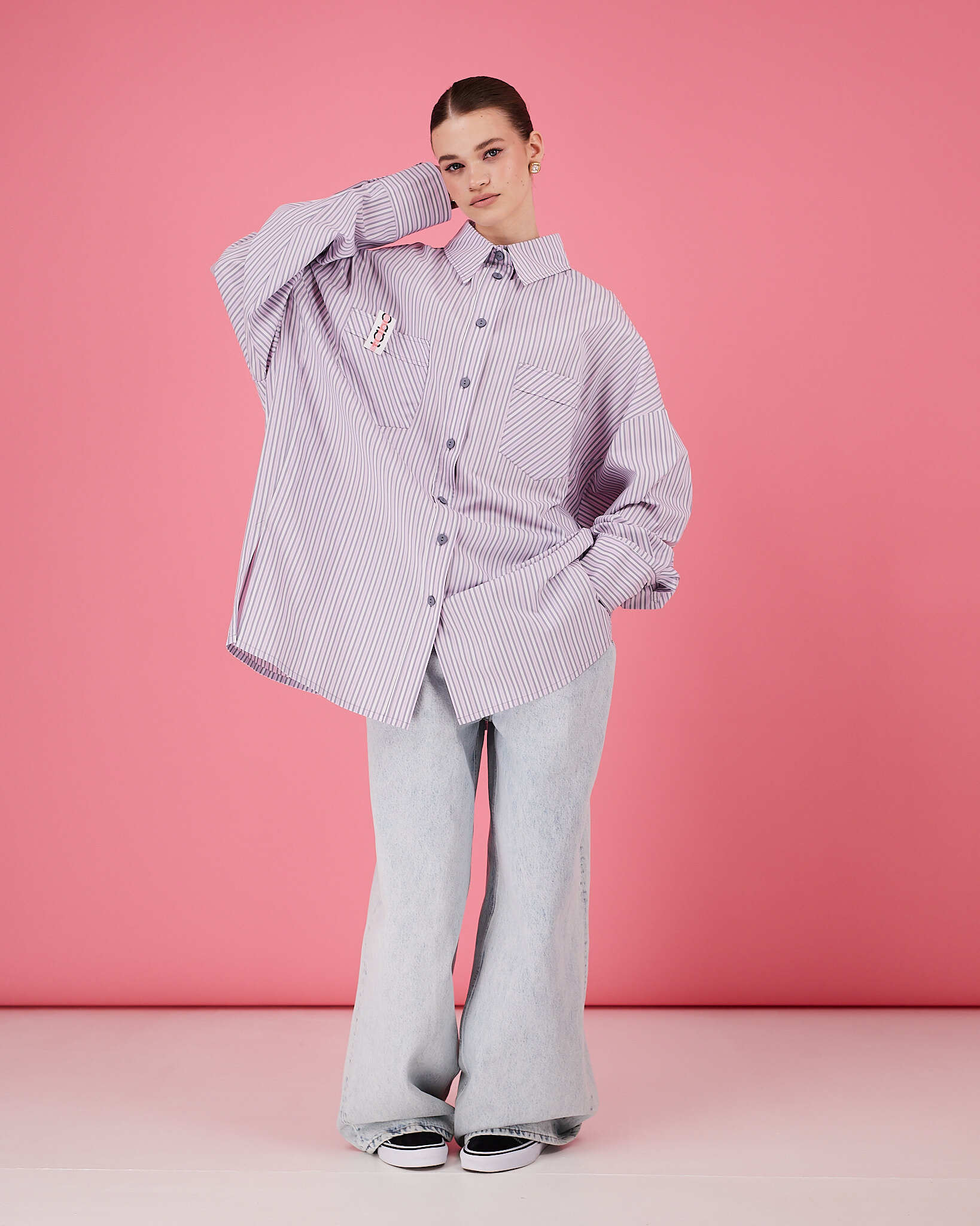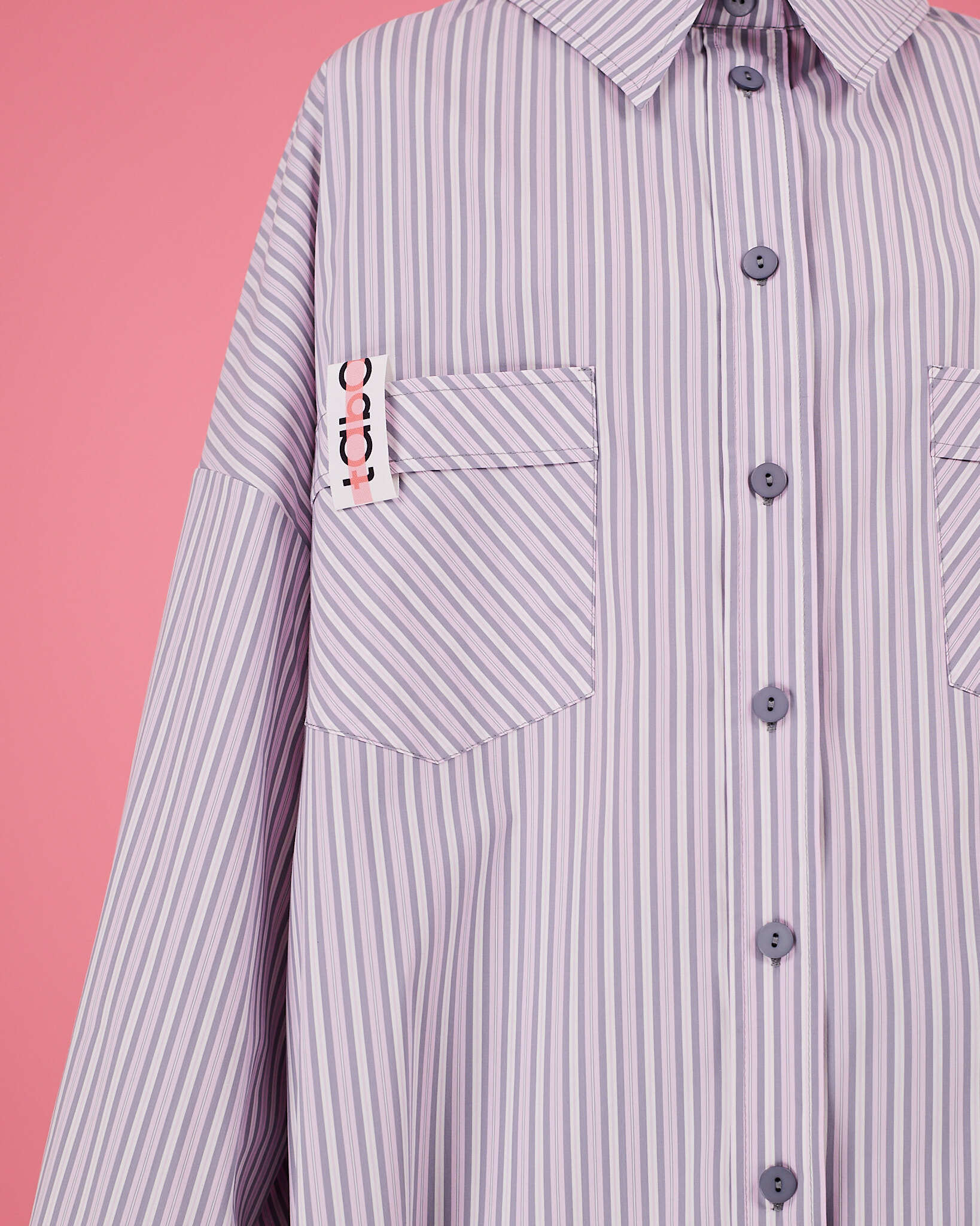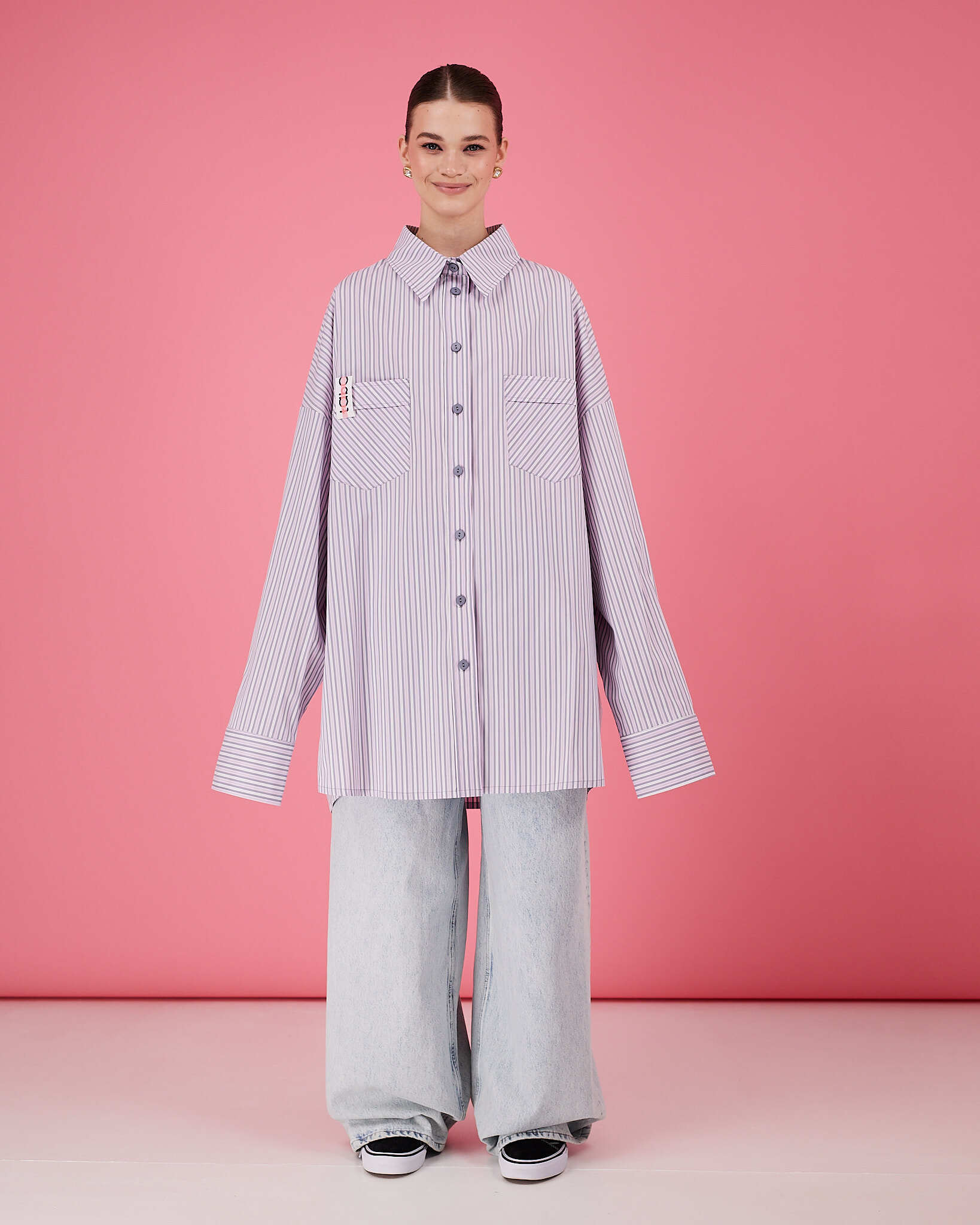 Рубашка прямого очень объемного силуэта имеет отложной воротник, кокетку и двойную складку на спинке. Рукава со складками на притачной манжете с застежкой на пуговицу. Линия низа немного скруглена. В боковых швах разрезы обработаны киперной лентой с логотипом бренда. Два передних кармана, на одном из которых логотип бренда.