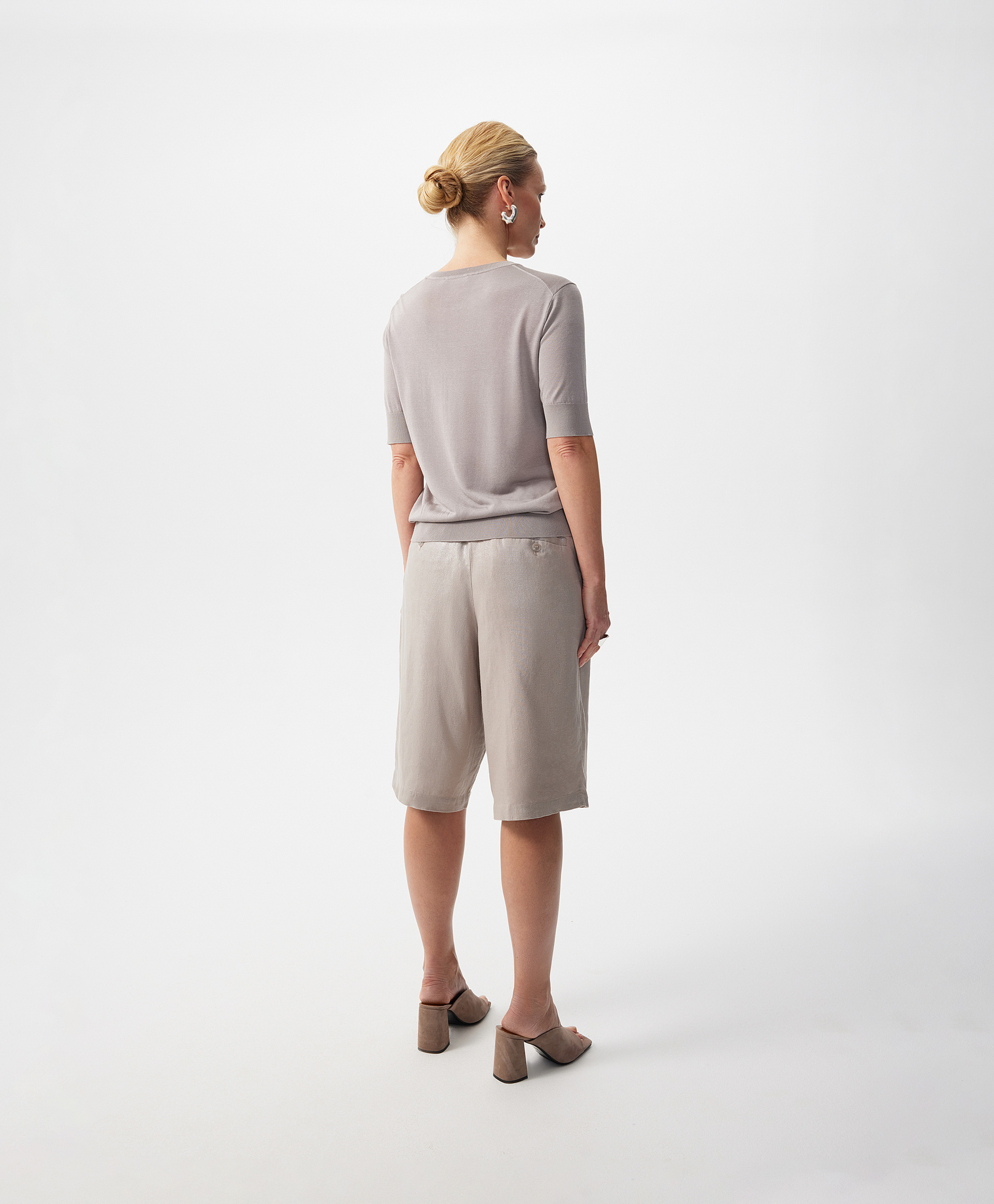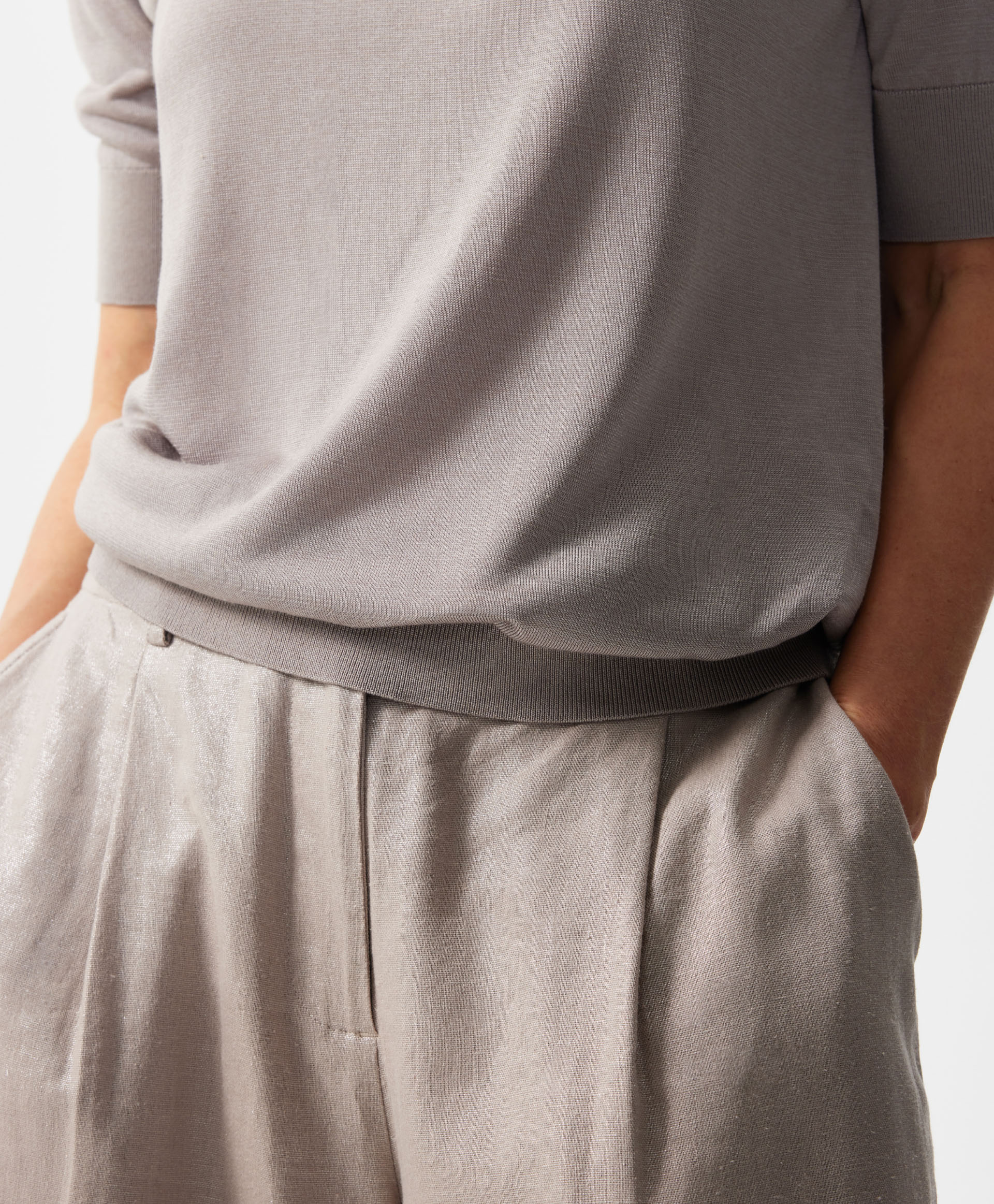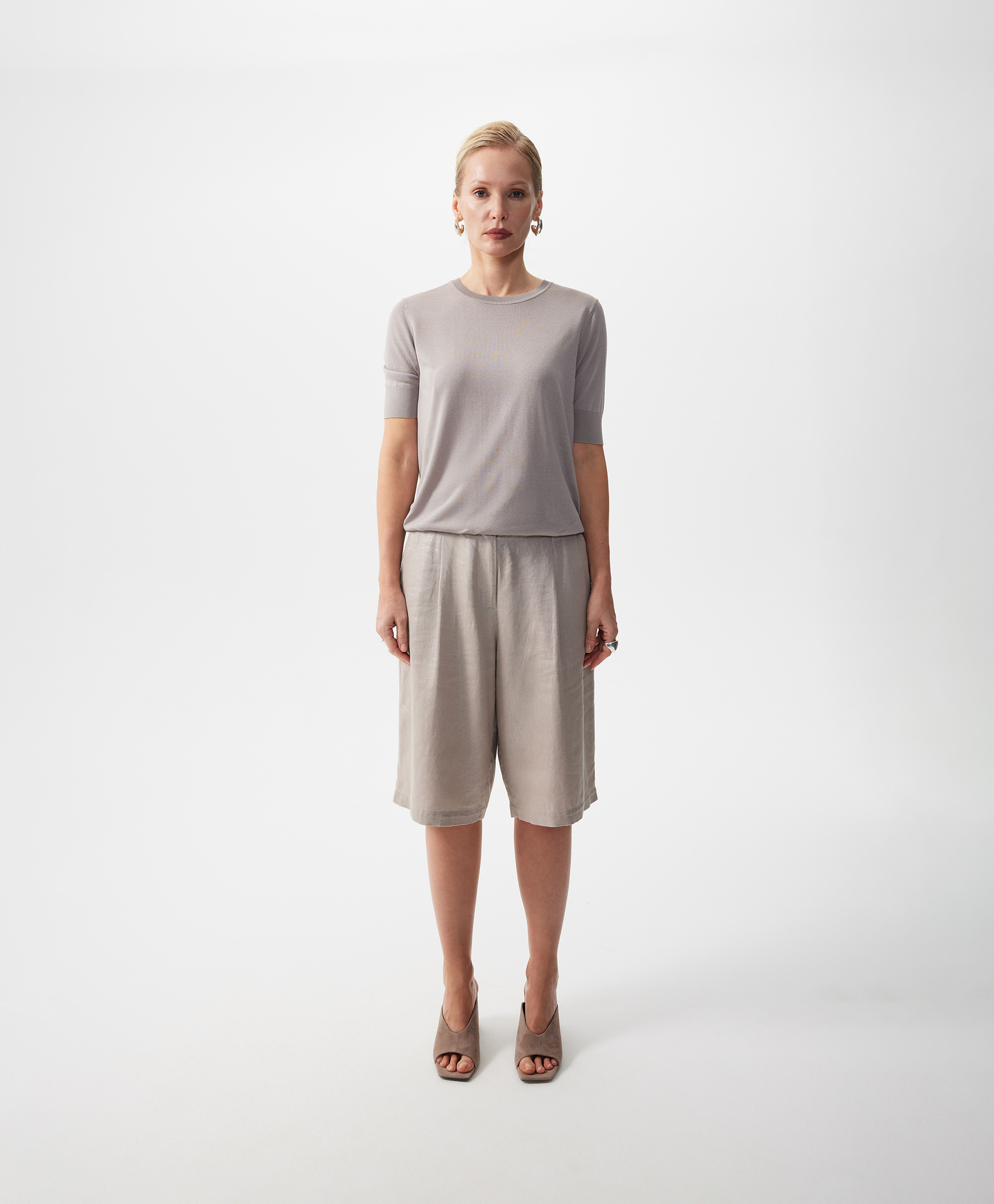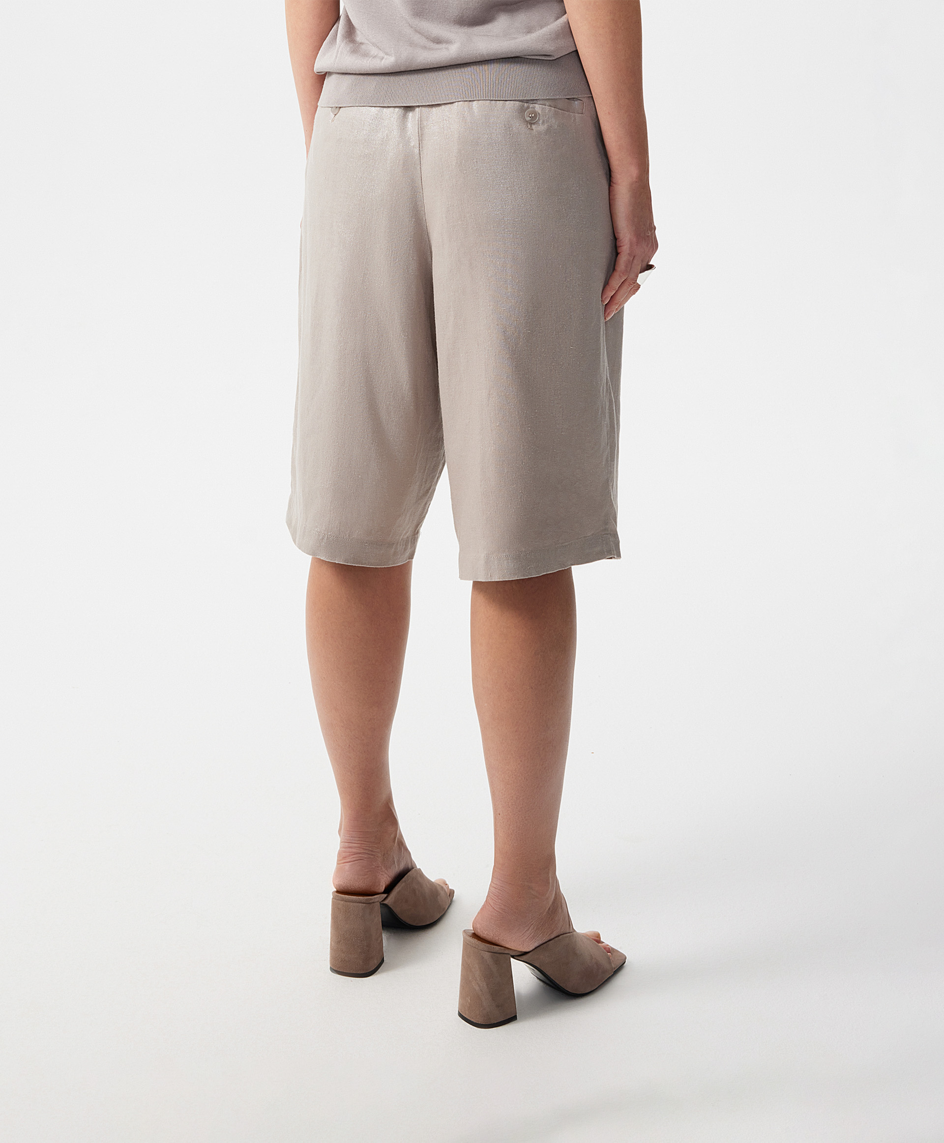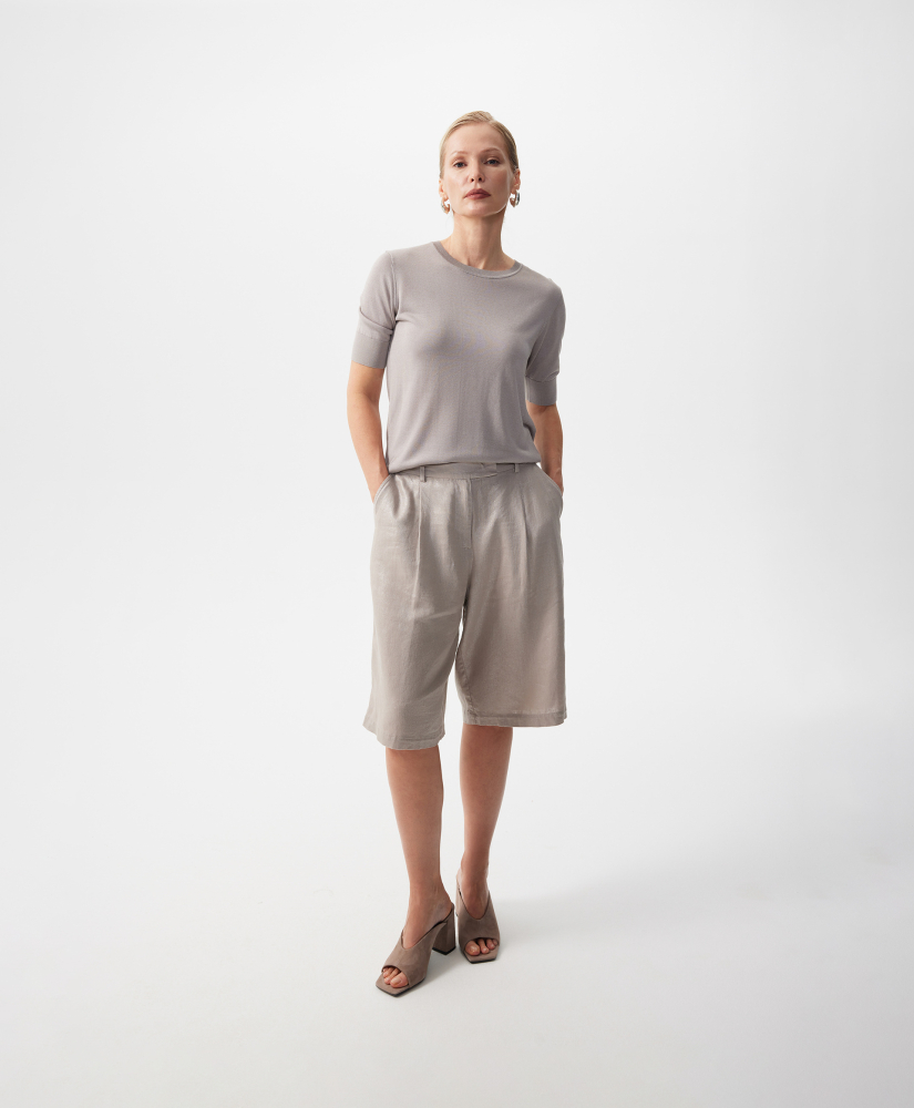 Легкие шорты прямой свободной формы - настоящее спасение жарким летом! Выполненные из смесовой ткани с преобладанием льна с приятной на ощупь слегка шероховатой текстурой, шорты имеют необычную поверхность с деликатным перламутровым блеском. Он усиливает сложность и благородство дымчатого оттенка пыльной розы и благодаря особому сиянию, делает шорты нарядными. Модная форма с небольшими защипами в зоне пояса, высокая посадка и оптимальная длина - чуть выше колен, создают возможности для формирования стильных городских образов. Шорты имеют удобные карманы со скосом на передней части, функциональные карманы-листочки сзади. Присборенная на резинку задняя часть пояса способствует удобству в эксплуатации вещи. Шорты застегиваются на молнию и крючок.
