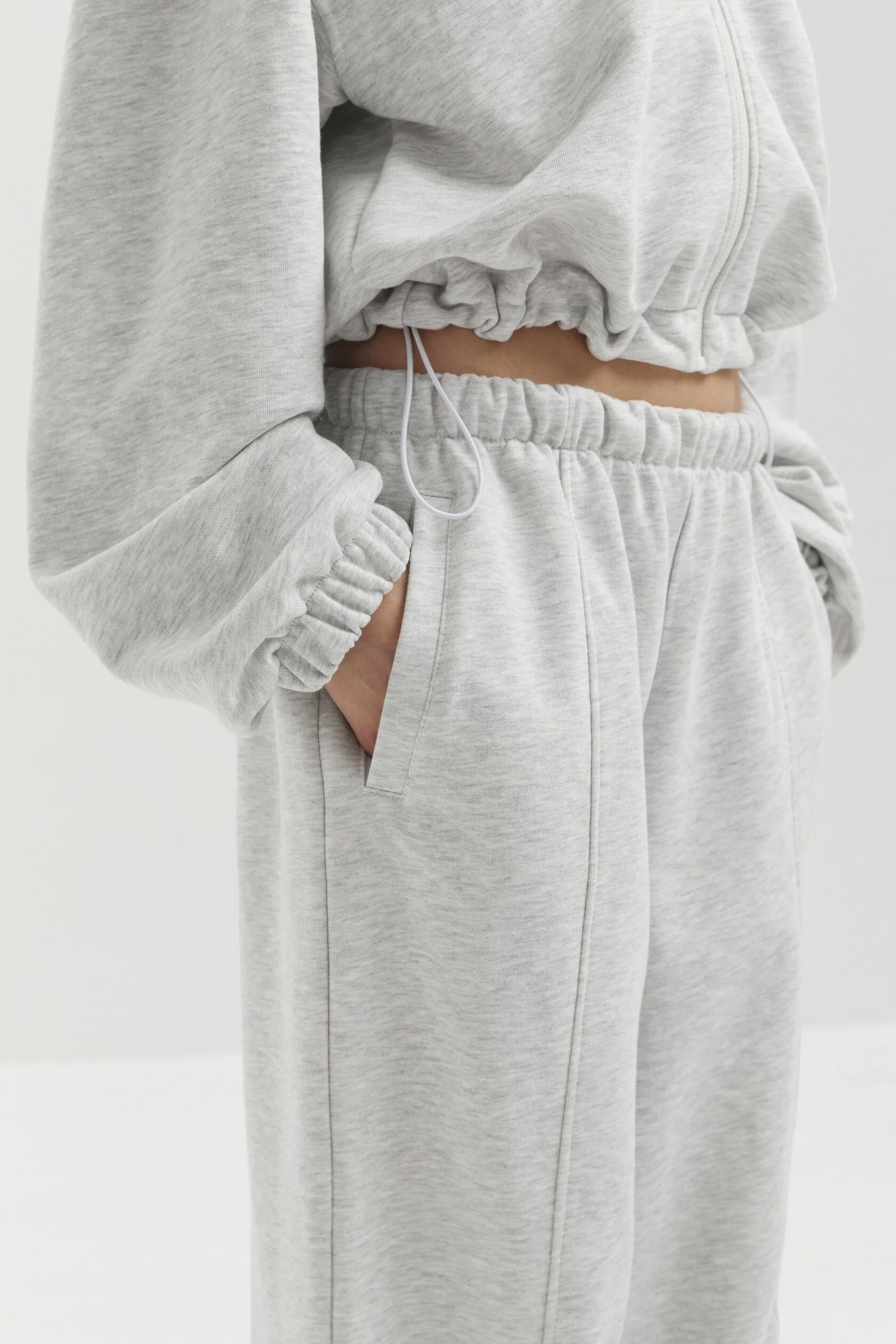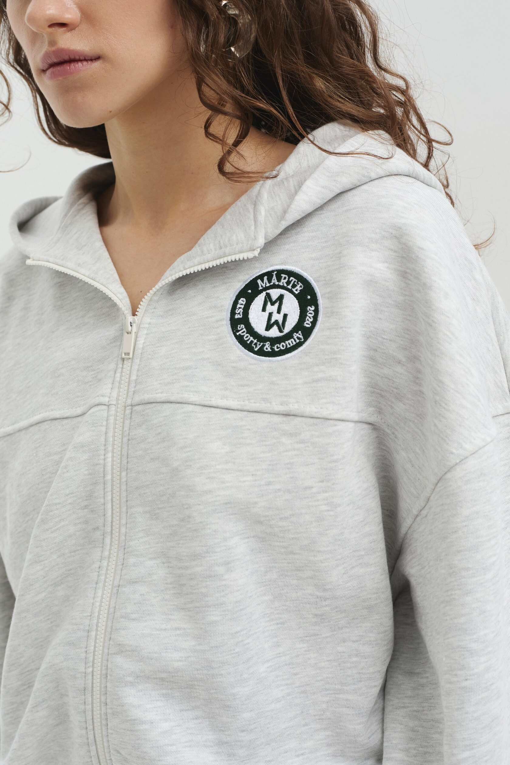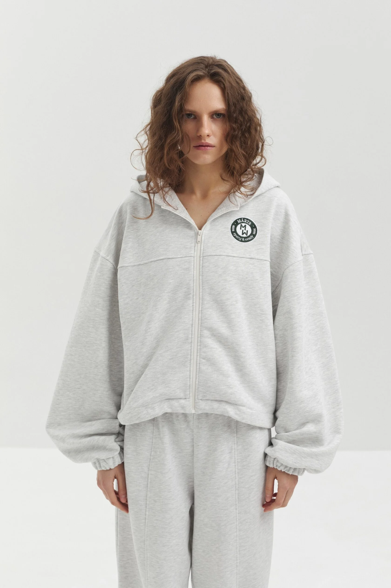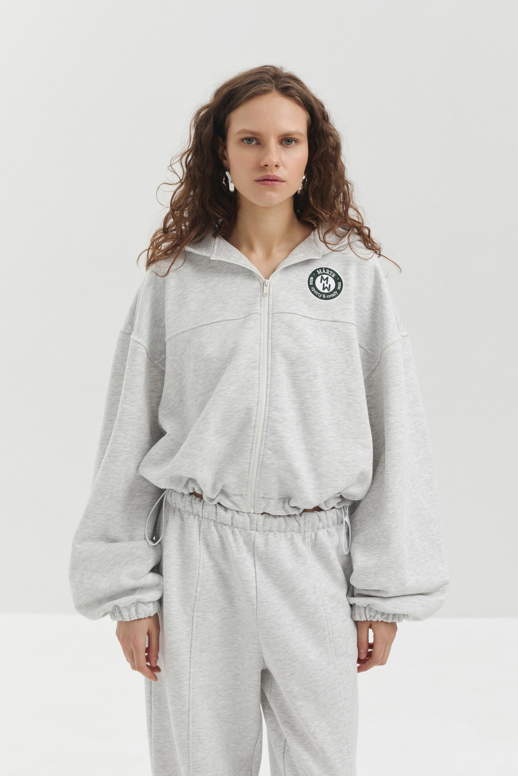 Укороченное худи из мягкого футера на молнии. Особые детали – нашивка логотипа и кулиски по низу изделия, благодаря которым можно регулировать объем изделия.