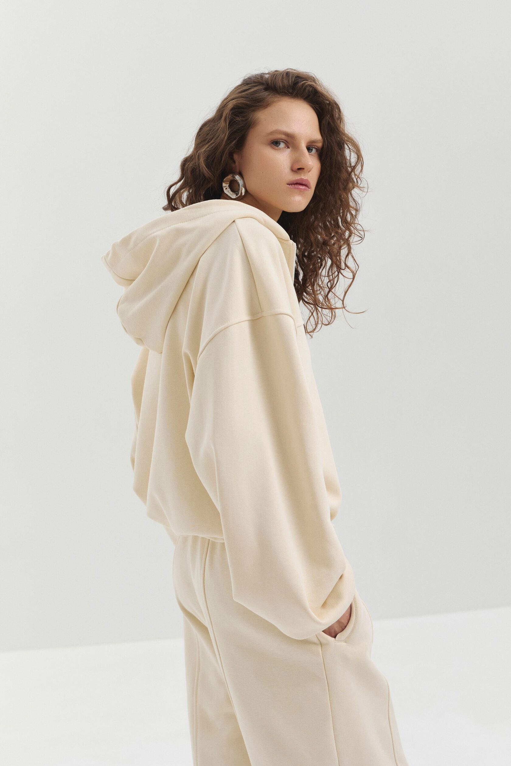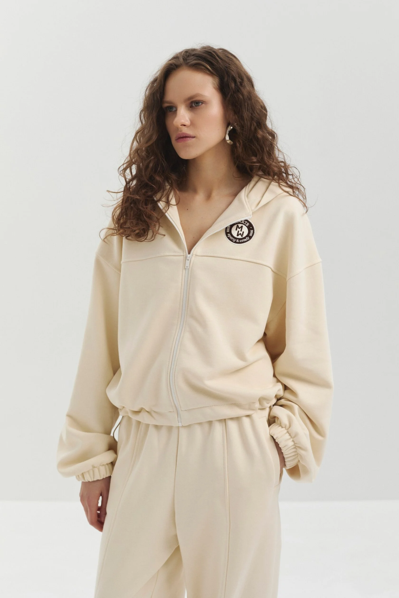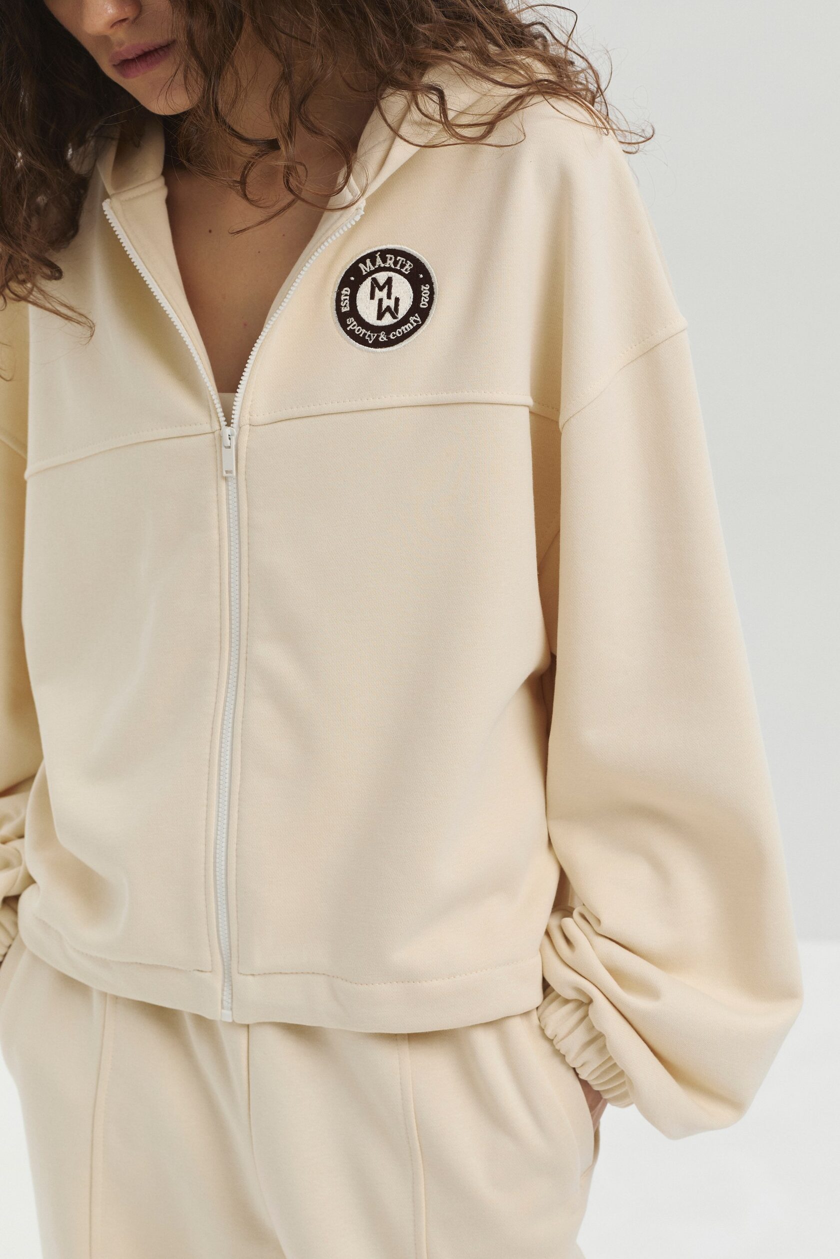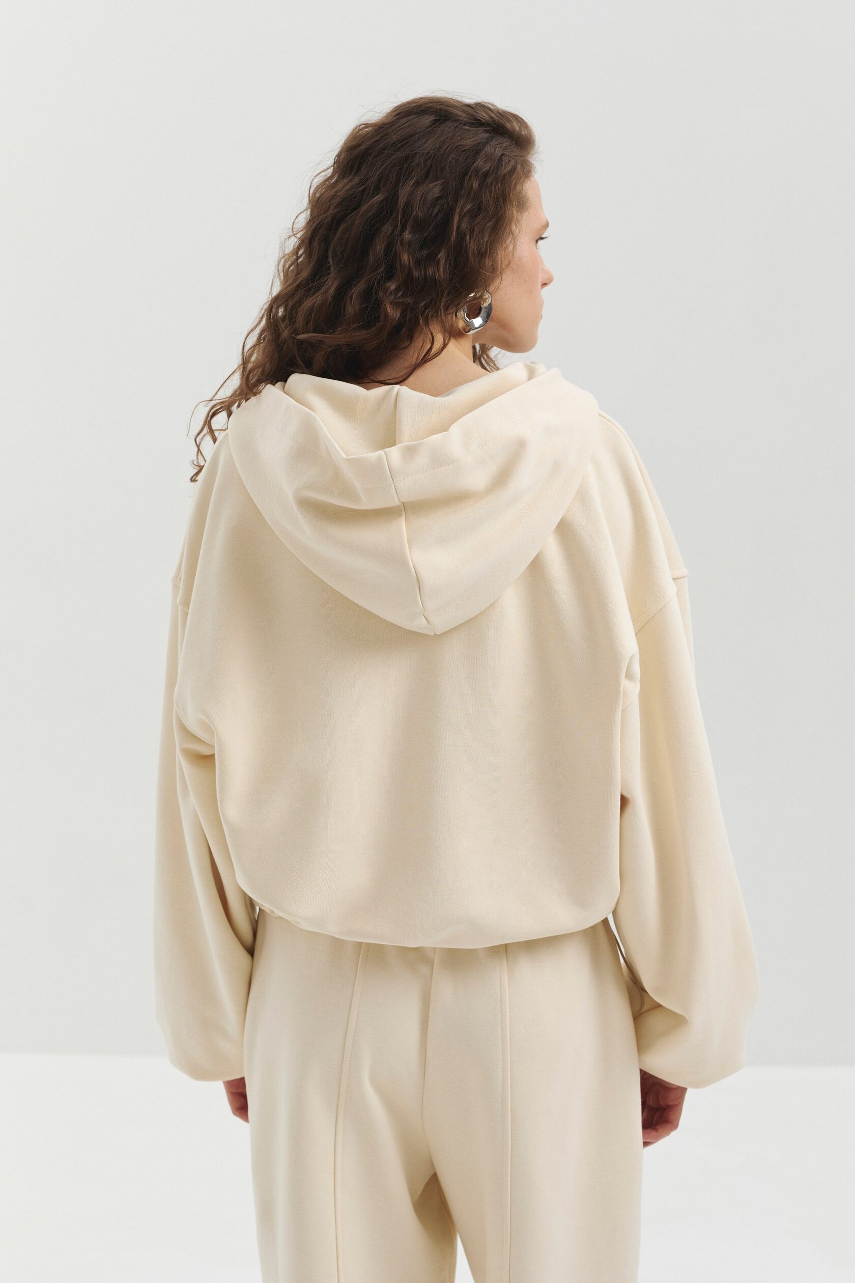 Укороченное худи из мягкого футера на молнии. Особые детали – нашивка логотипа и кулиски по низу изделия, благодаря которым можно регулировать объем изделия.