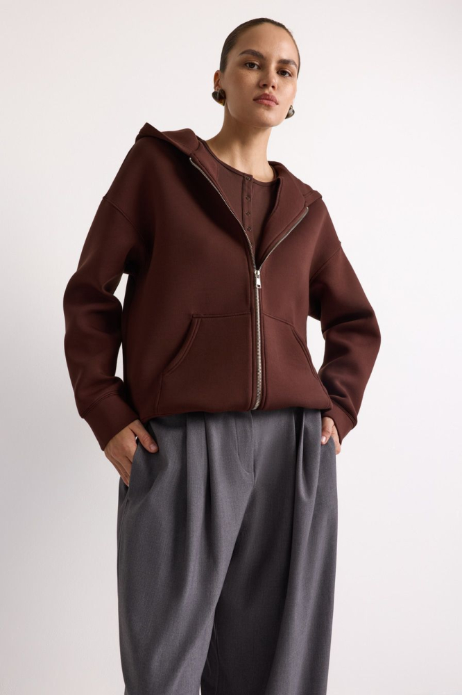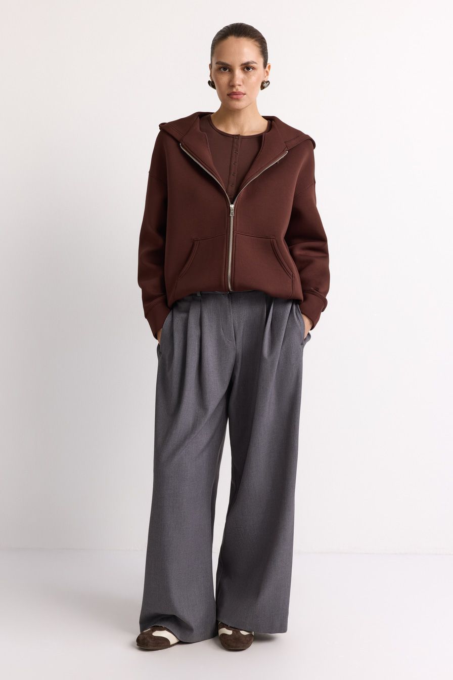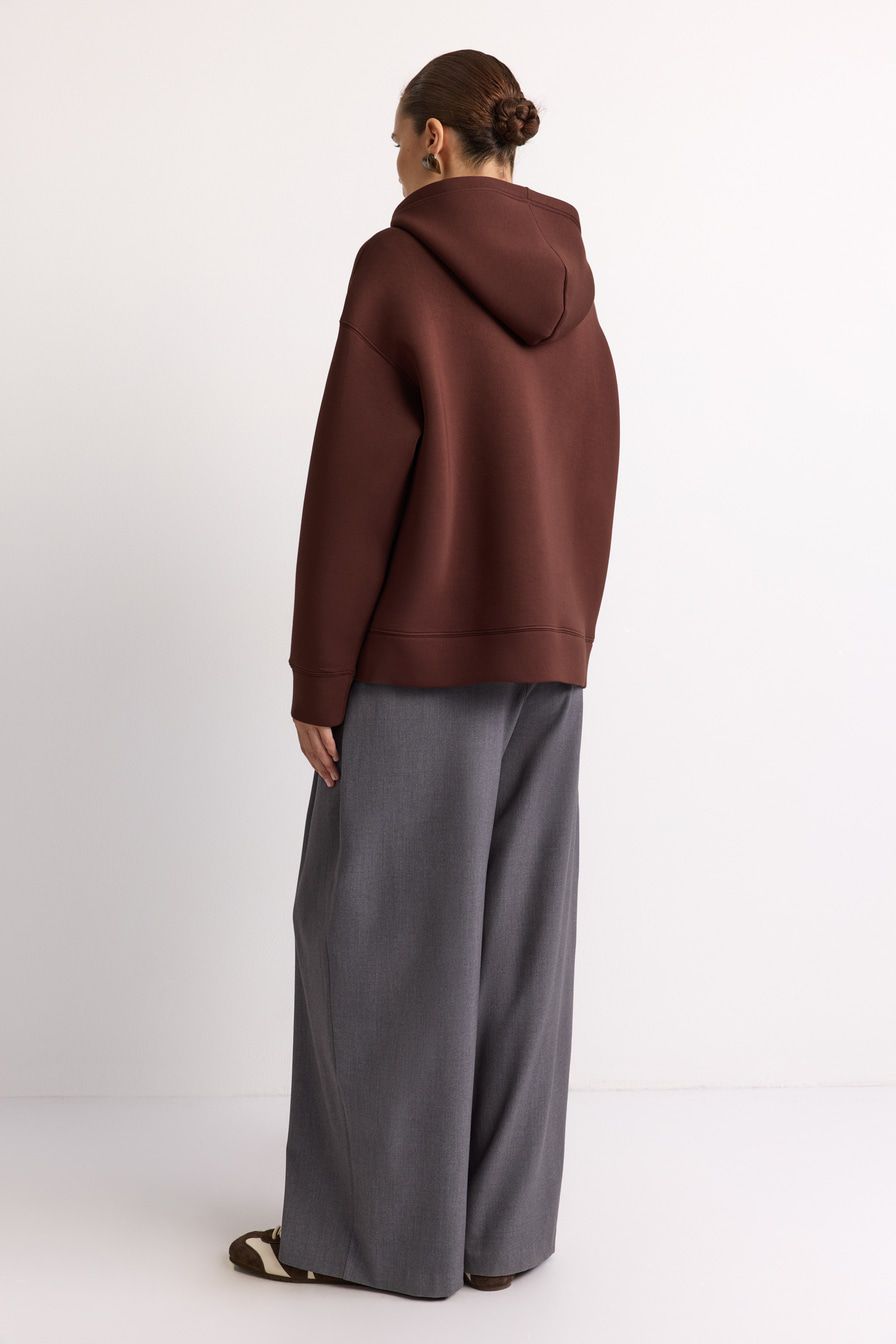 Коричневое худи из вискозного неопрена – модель оверсайз-кроя с застежкой-молнией и боковыми карманами. Мягкий, плотный и упругий материал хорошо держит форму и обеспечивает комфортный температурный режим.