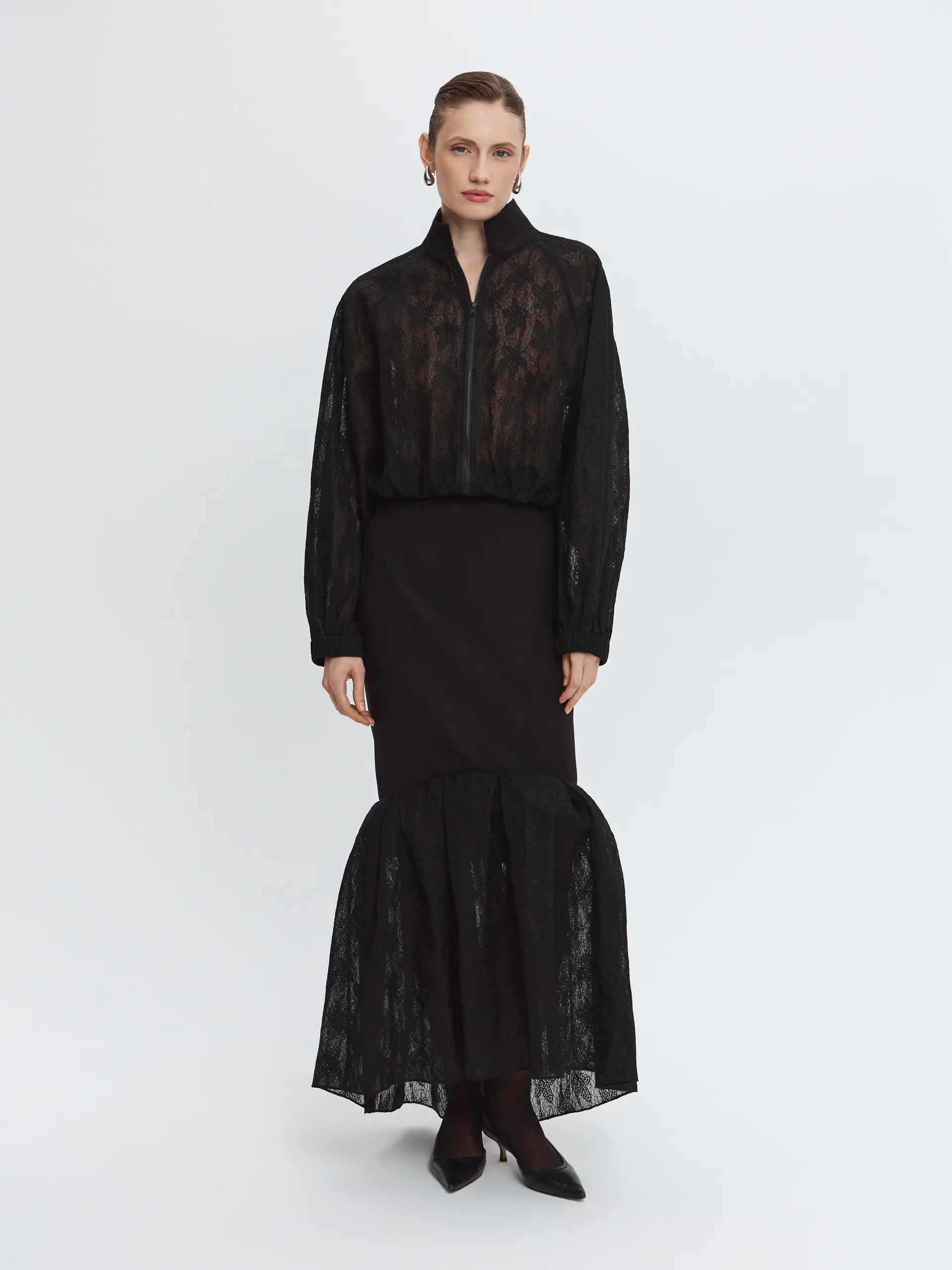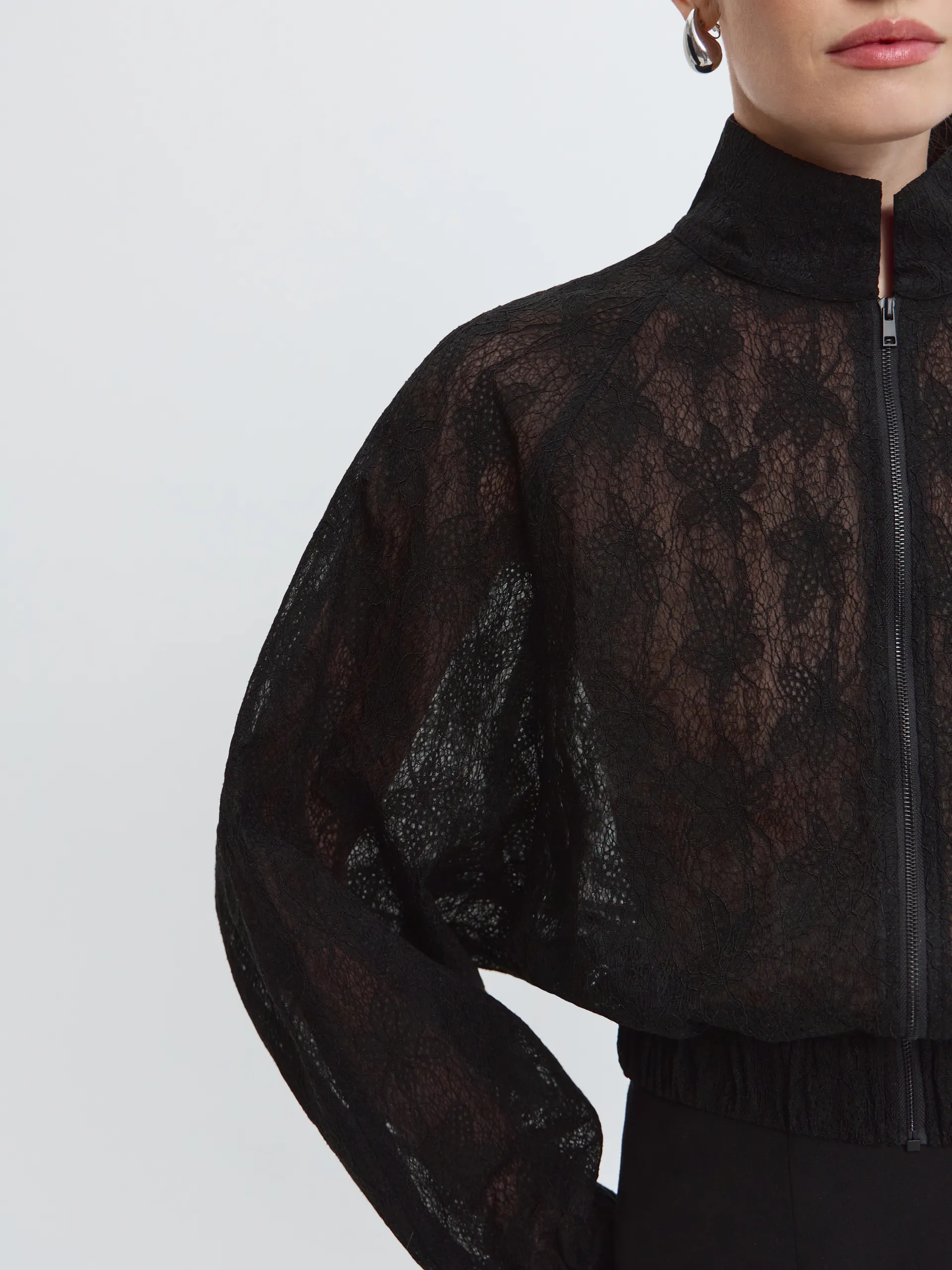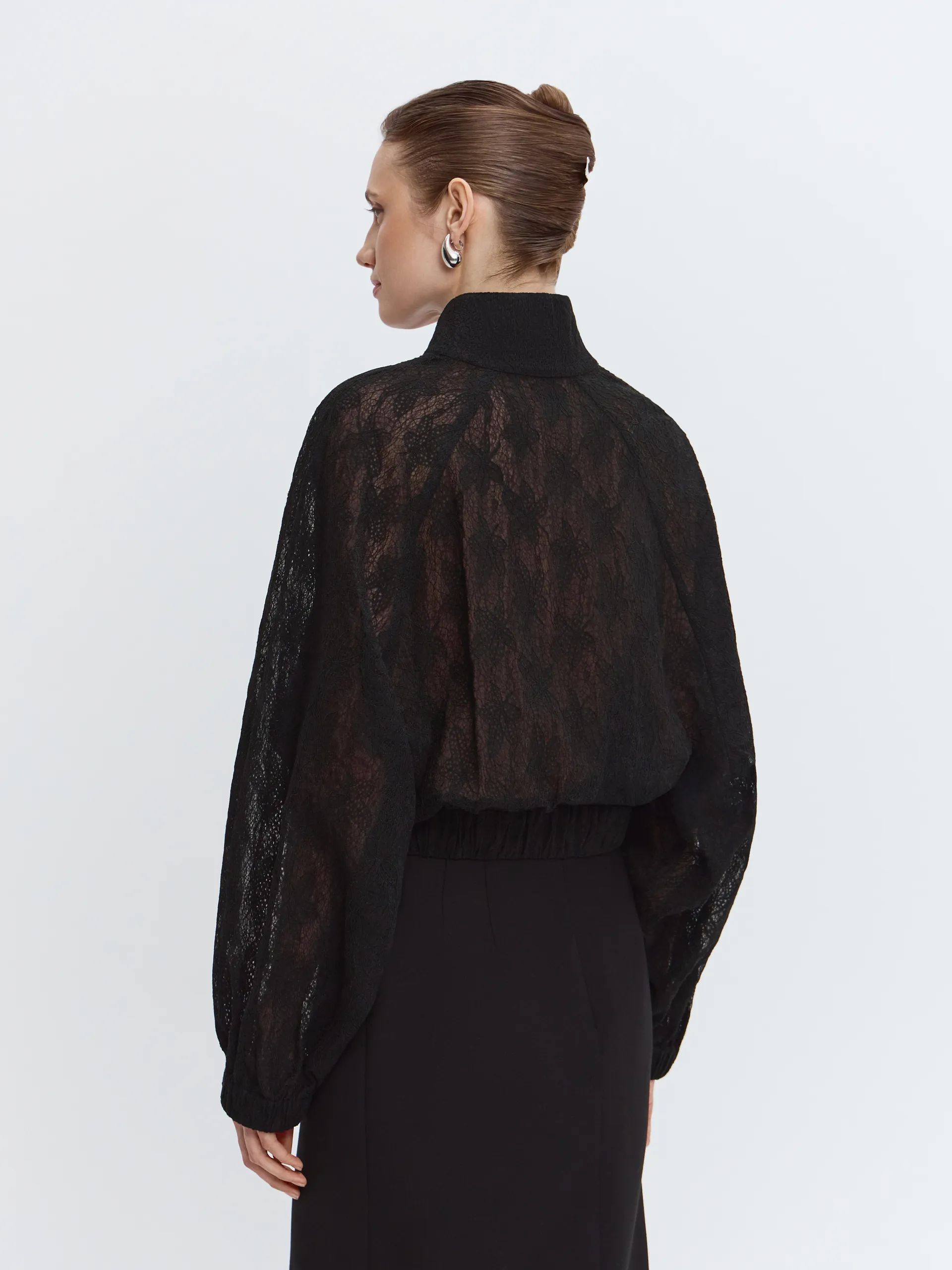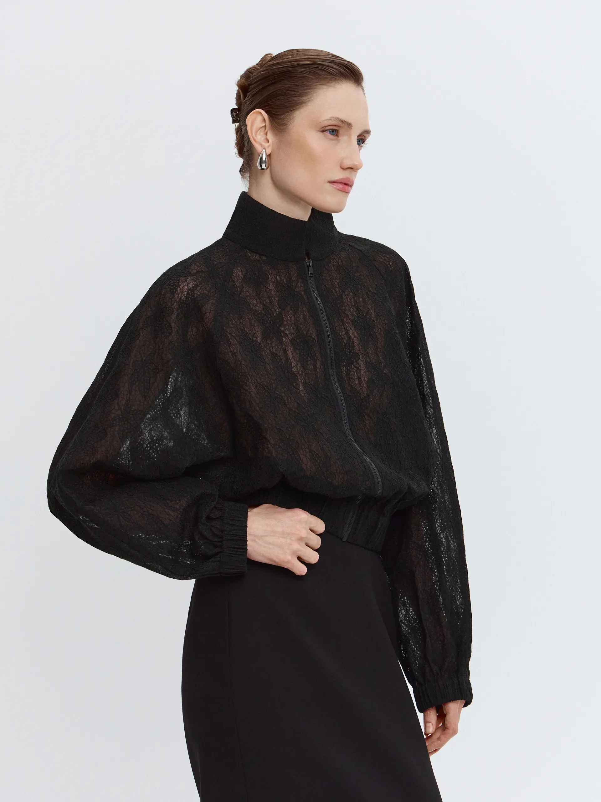 Укороченный бомбер из чёрного кружева — смелое сочетание романтики и спорта. Объёмный силуэт «летучая мышь» и рукав реглан создают расслабленный образ. Манжеты и низ изделия с эластичной тесьмой формируют аккуратный объём. Модель без подкладки, с аккуратно обработанными внутренними швами — лёгкая, выразительная и идеально подходящая для многослойных образов.
