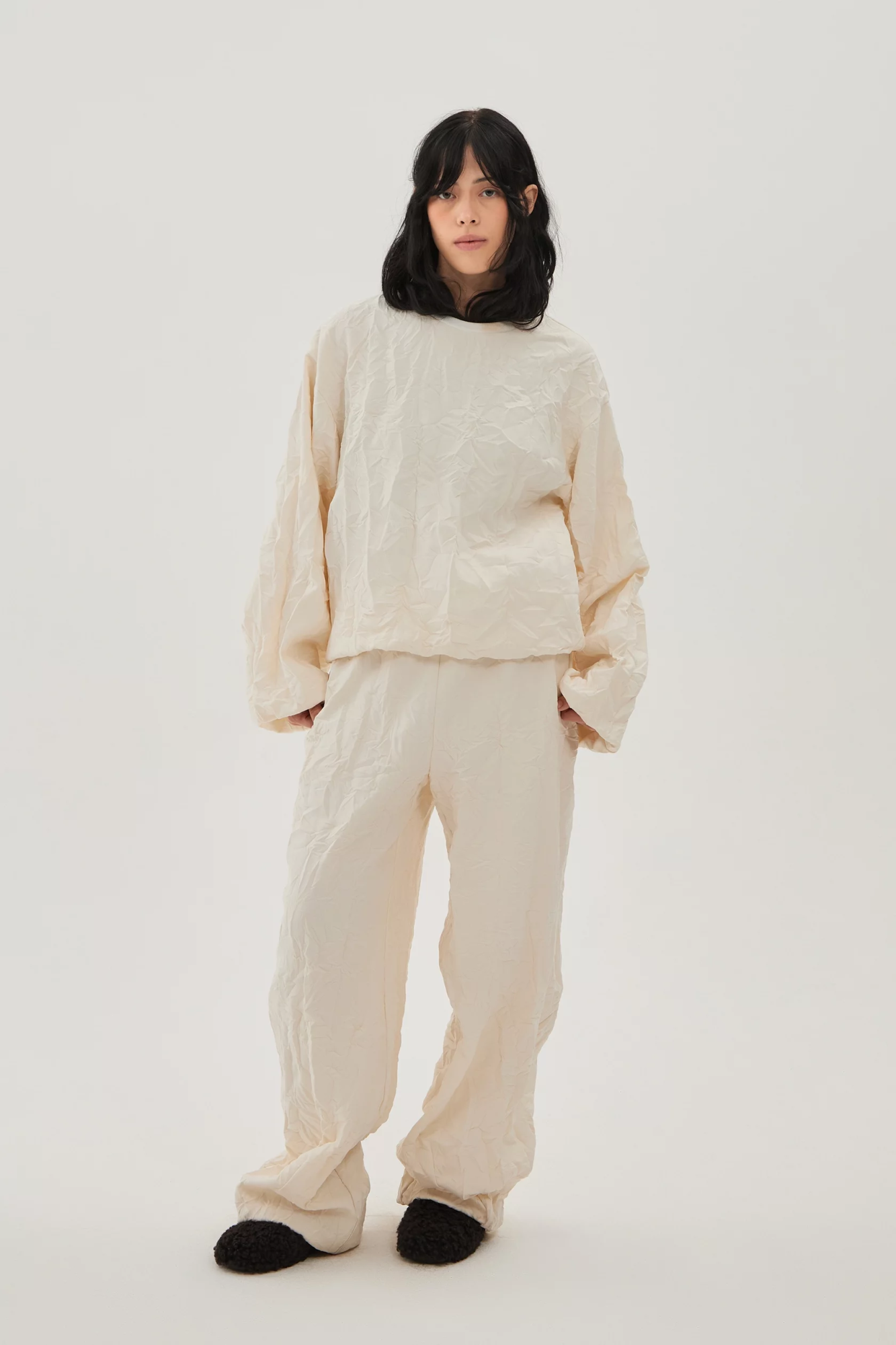 Свитшот из мягкой ткани с фактурой смятой мокрой бумаги на хлопковой подкладке. Свободный крой, низ и низ рукавов сделаны баллоном.