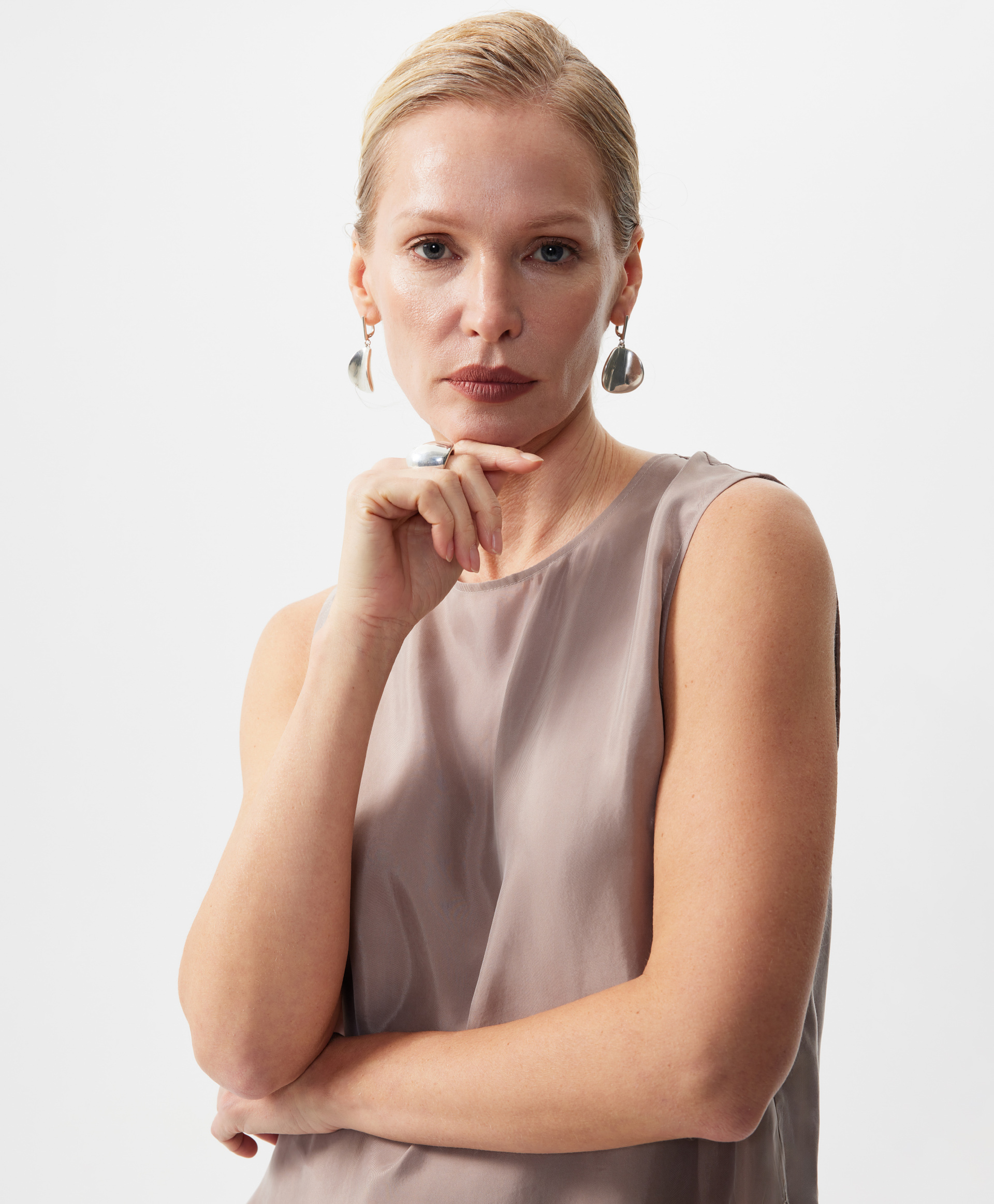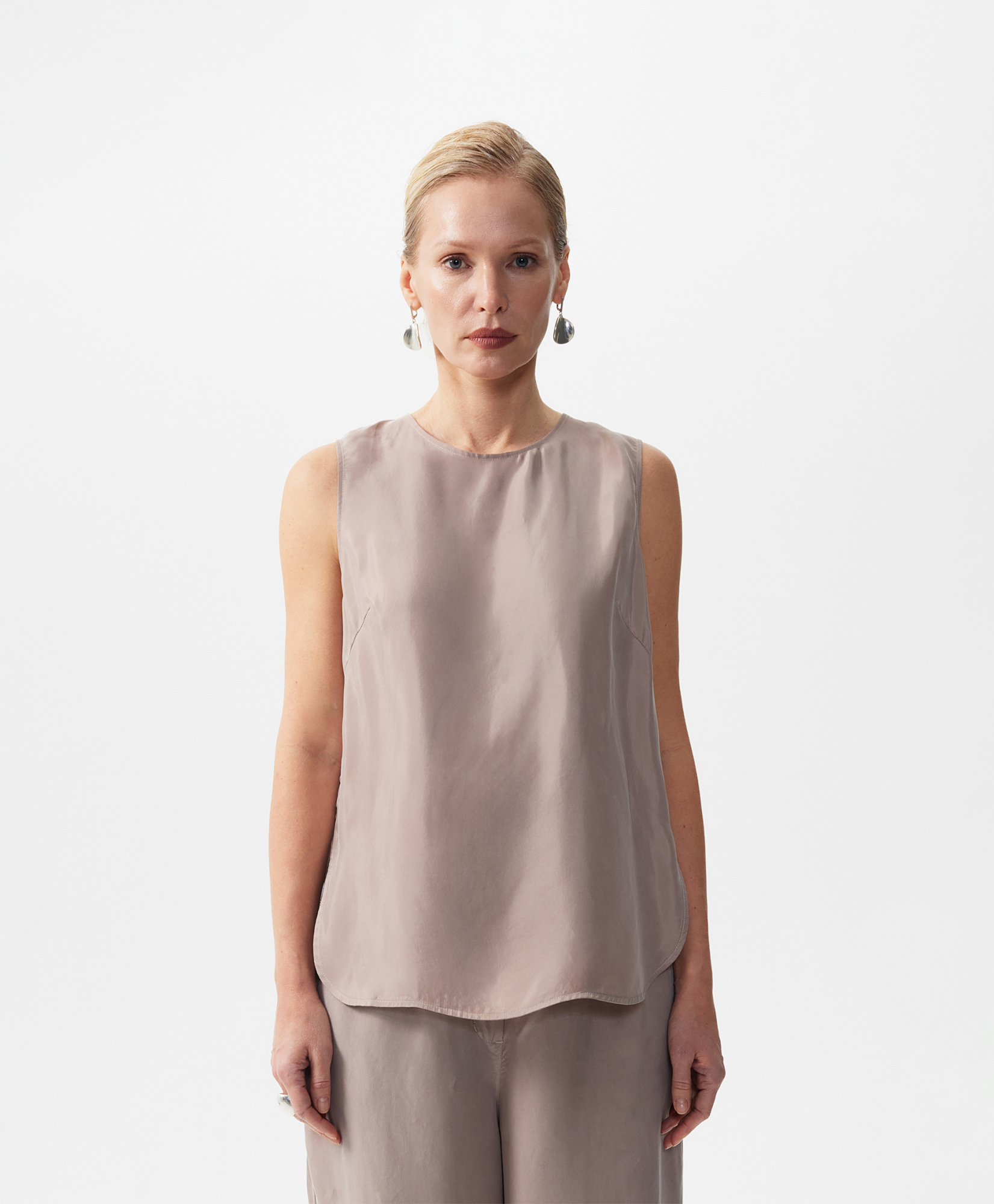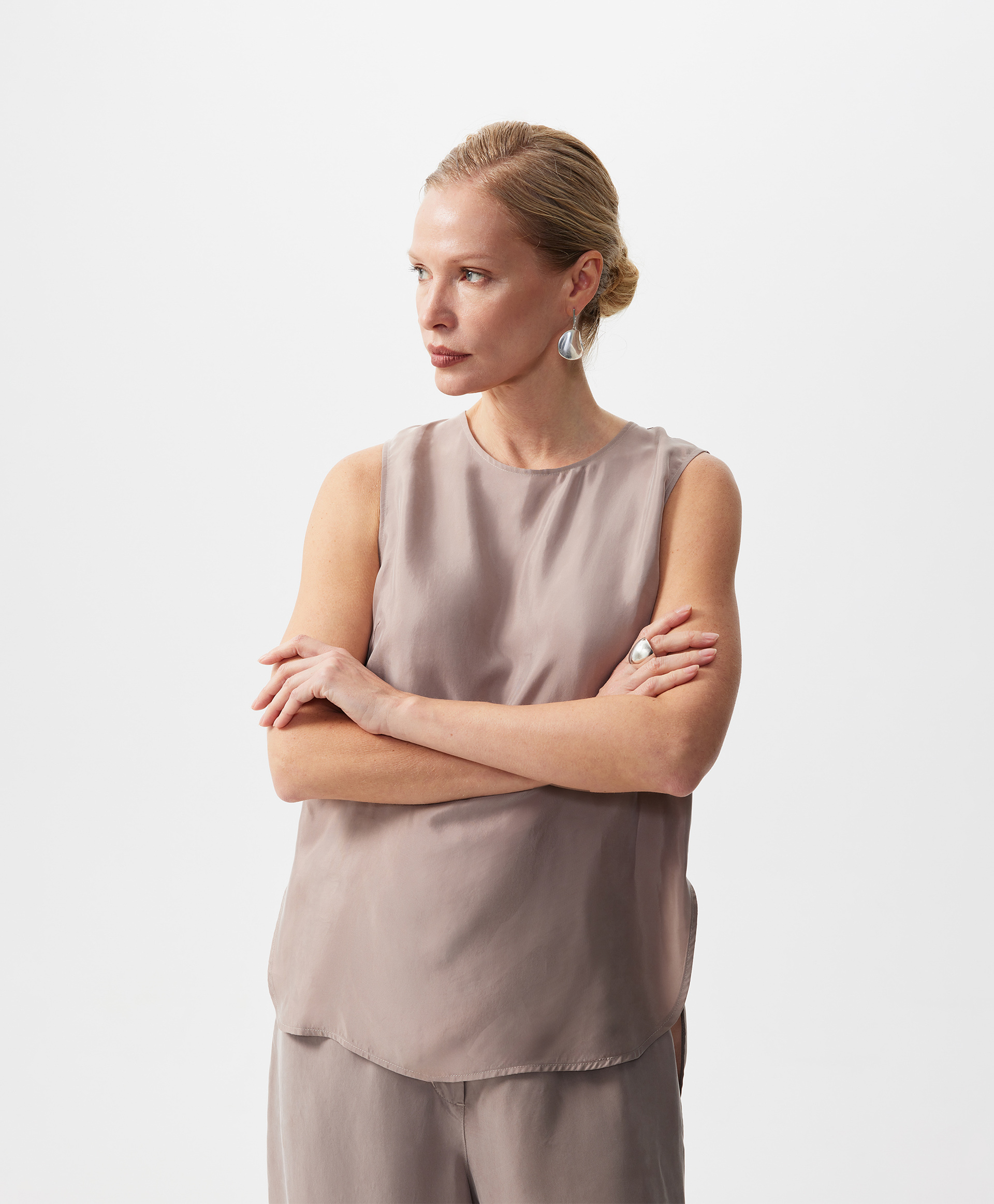 Топ из вискозного текстиля с эффектом мокрого шелка станет прекрасной базовой вещью в гардеробе женщины! И как нейтральный первый слой в сочетании с пиджаком, кардиганом, жакетом, и как элегантное самостоятельное изделие - с брюками палаццо, юбкой, джинсами, лаконичный топ благородного цвета - универсальное решение в концепции утро-день-вечер. Деликатная обработка горловины, проймы, а также закругленных по низу деталей спинки и полочки тончайшими обтачками придает изделию премиальный внешний вид, подчеркивает высокий уровень дизайна и технологии, превращающие базовую по форме вещь в изысканный предмет женского образа. Топ имеет застежку-капельку на спинке.
