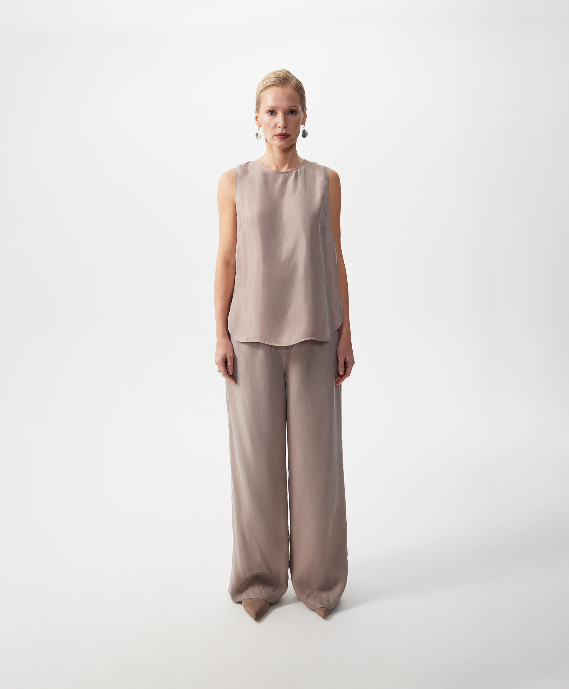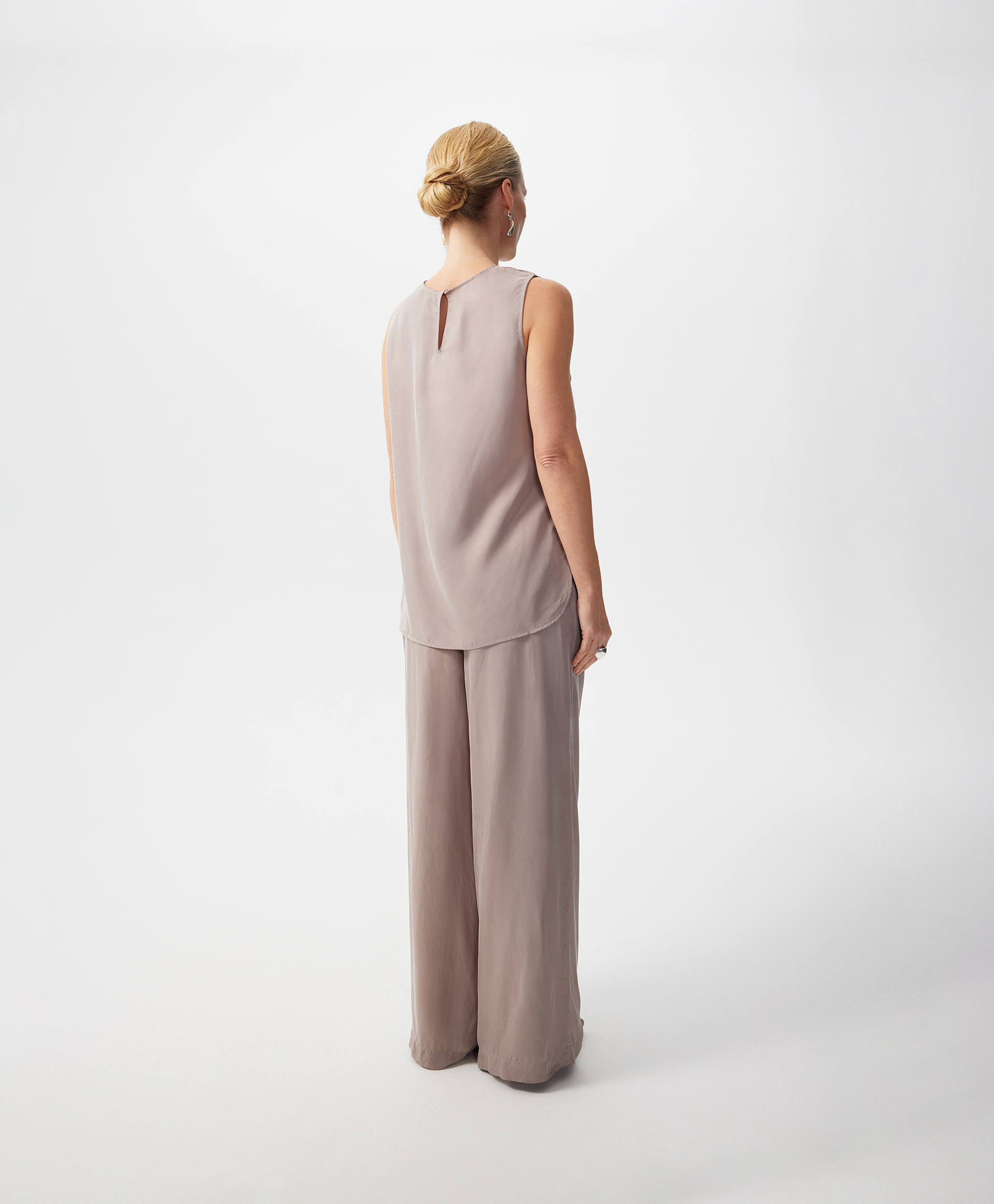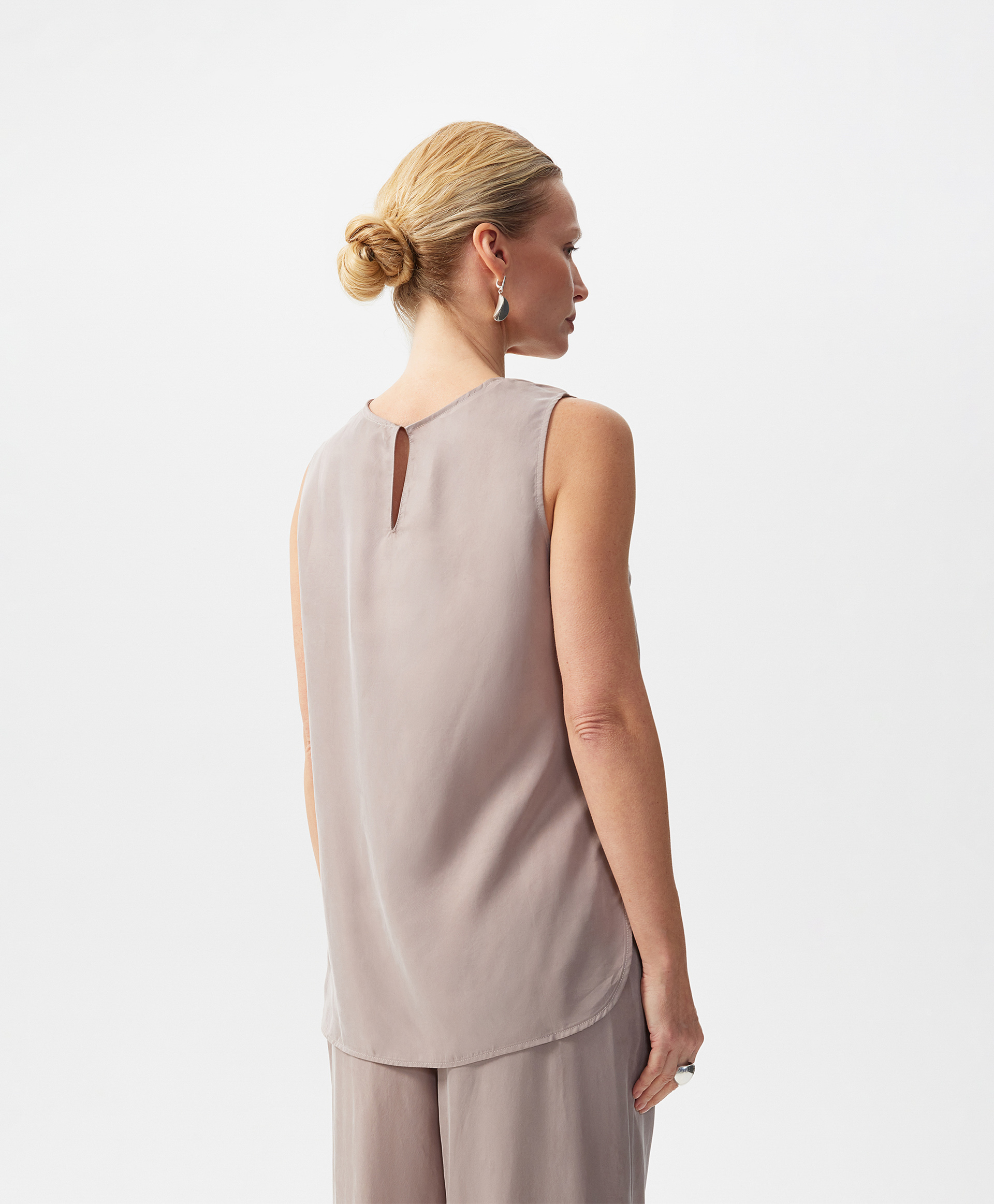 Топ из вискозного текстиля с эффектом мокрого шелка станет прекрасной базовой вещью в гардеробе женщины! И как нейтральный первый слой в сочетании с пиджаком, кардиганом, жакетом, и как элегантное самостоятельное изделие - с брюками палаццо, юбкой, джинсами, лаконичный топ благородного цвета - универсальное решение в концепции утро-день-вечер. Деликатная обработка горловины, проймы, а также закругленных по низу деталей спинки и полочки тончайшими обтачками придает изделию премиальный внешний вид, подчеркивает высокий уровень дизайна и технологии, превращающие базовую по форме вещь в изысканный предмет женского образа. Топ имеет застежку-капельку на спинке.