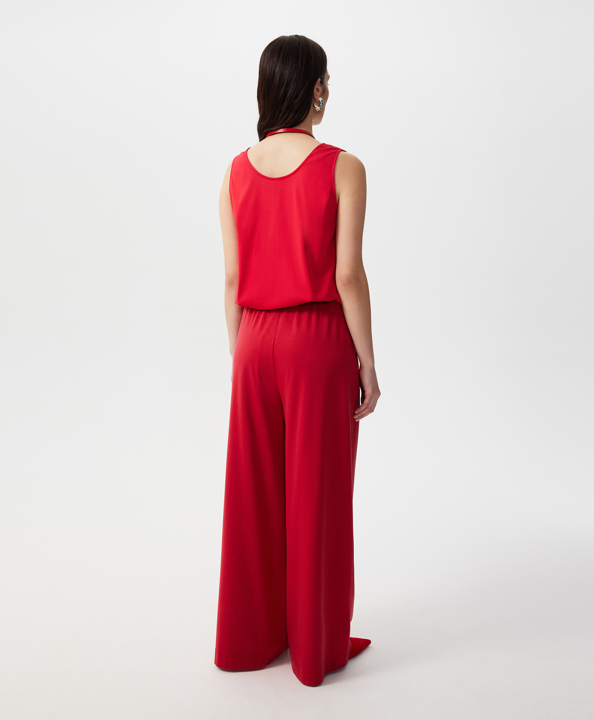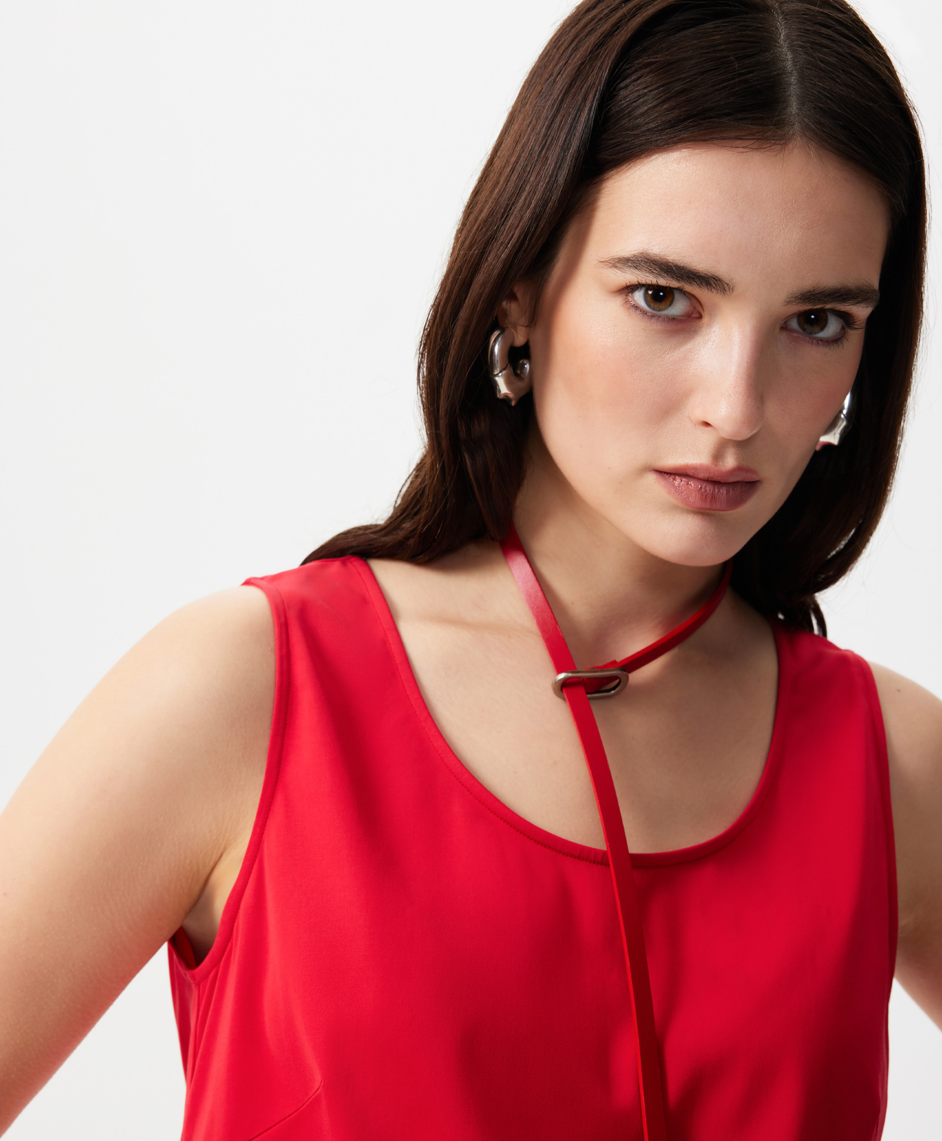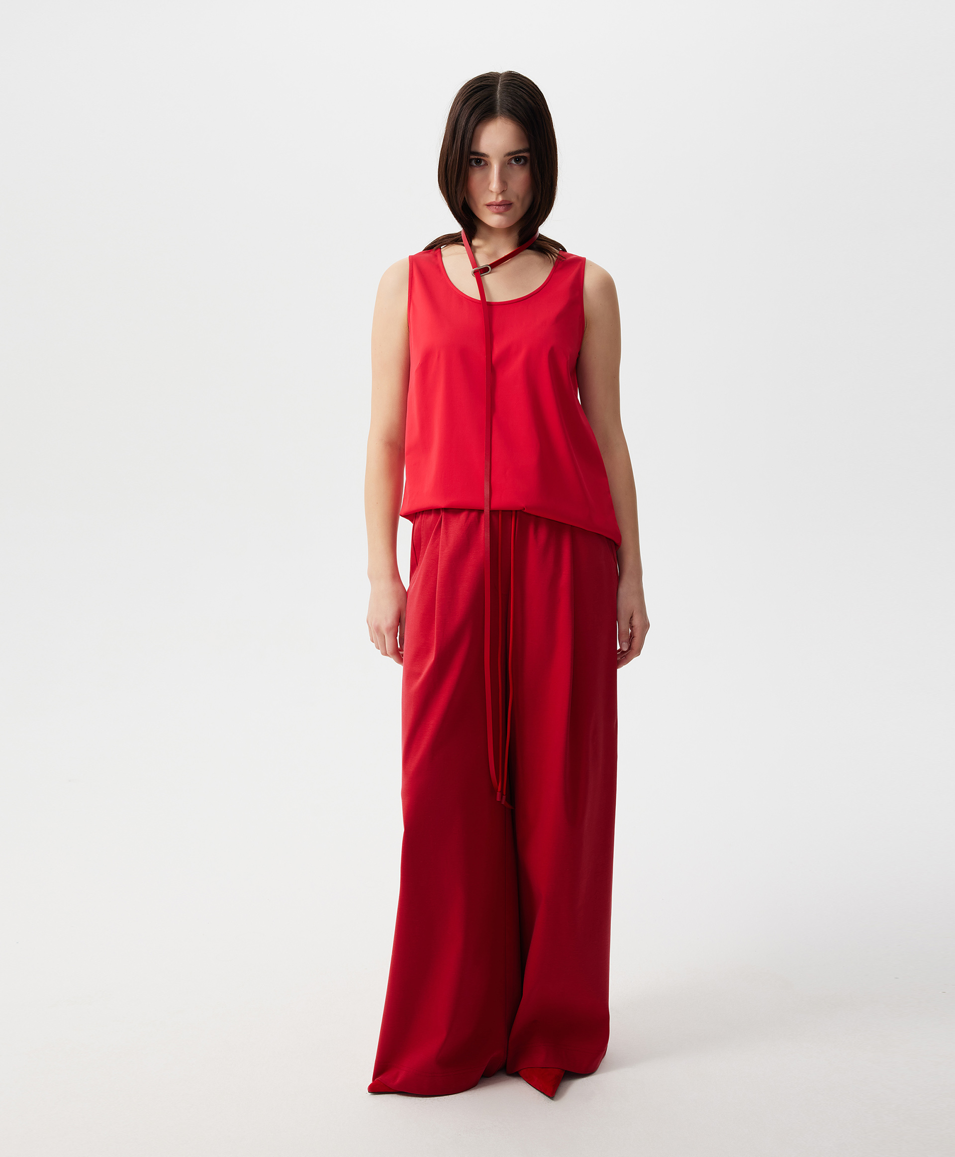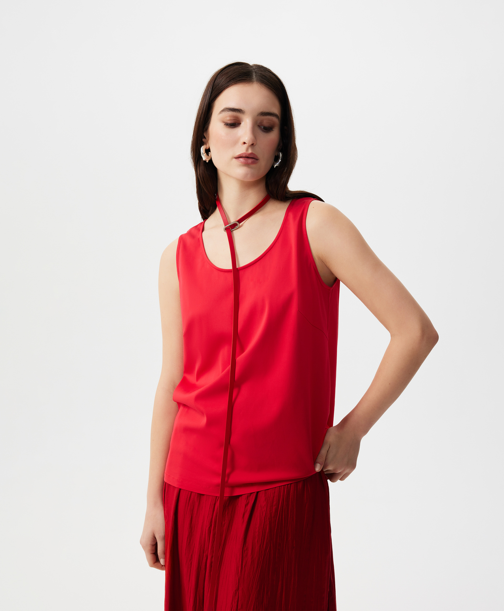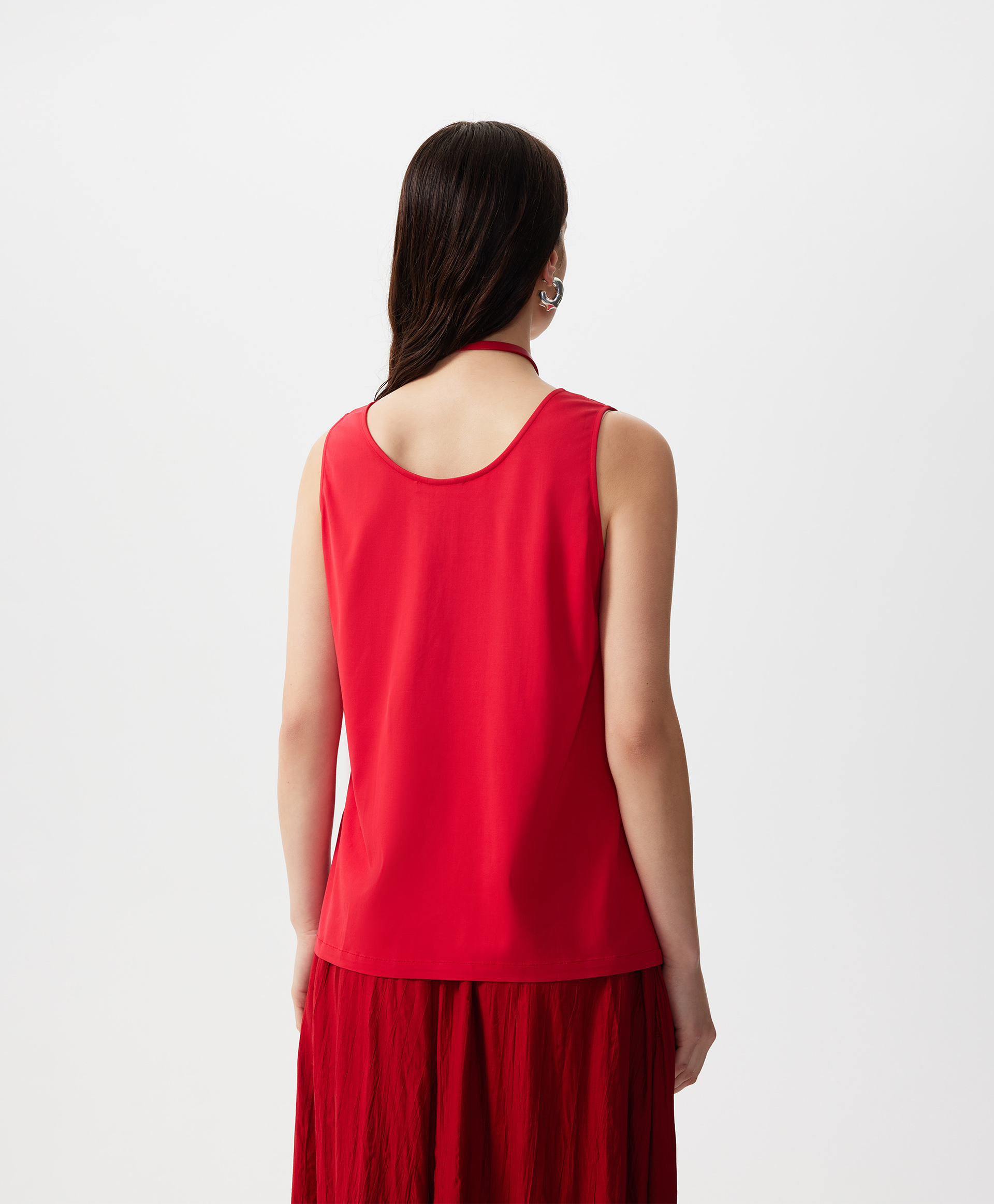 Красный топ из шелковистого текстиля с благородным матовым блеском - базовая вещь в гардеробе женщины! И как яркий первый слой в сочетании с пиджаком, кардиганом, жакетом, и как элегантное самостоятельное изделие - с брюками палаццо, юбкой, джинсами, лаконичный топ - прекрасное решение в концепции утро-день-вечер. Состав с преимущественным содержанием вискозы, добавлением района (разновидность вискозы) и спандекса делает топ формоустойчивым, пластичным, приятным тактильно. Деликатная обработка горловины и проймы тончайшими обтачками придает изделию премиальный внешний вид, подчеркивает высокий уровень дизайна и технологии, превращающие базовую по форме вещь в изысканный предмет женского образа.
