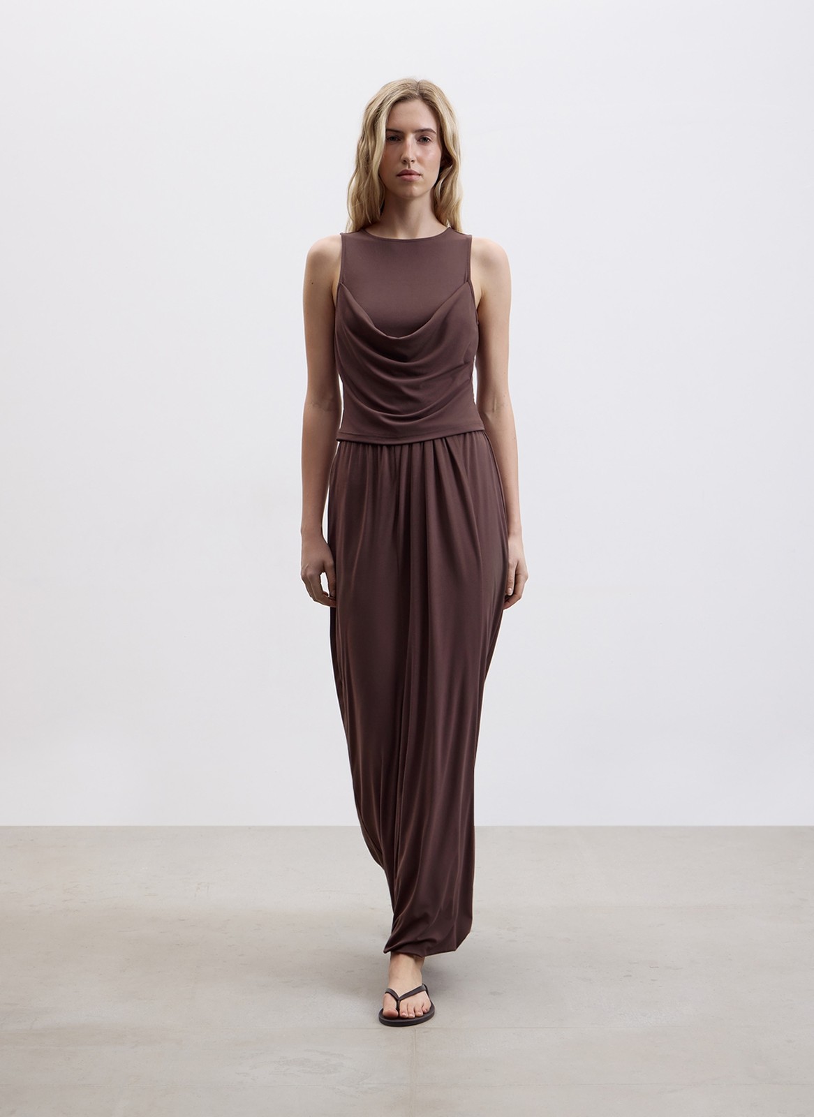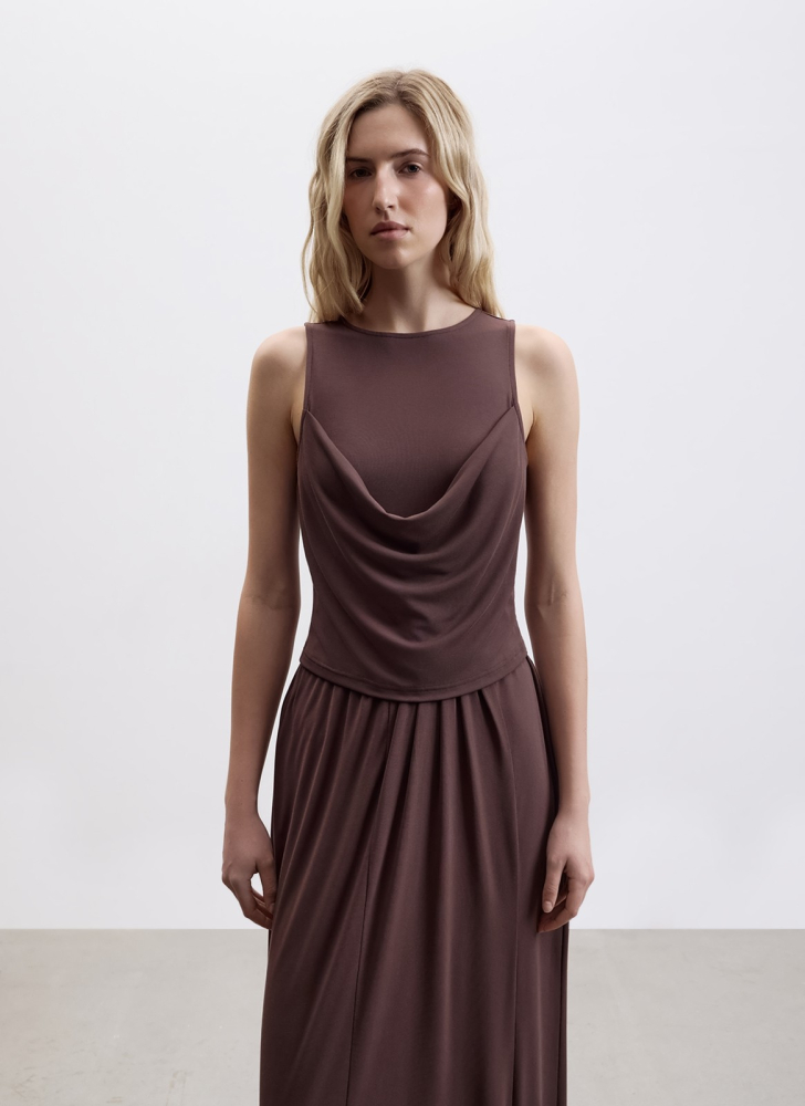 Модель имеет приталенный силуэт, подчёркивающий фигуру. Двойная драпировка создает объём и движение, работая как самостоятельный акцент.