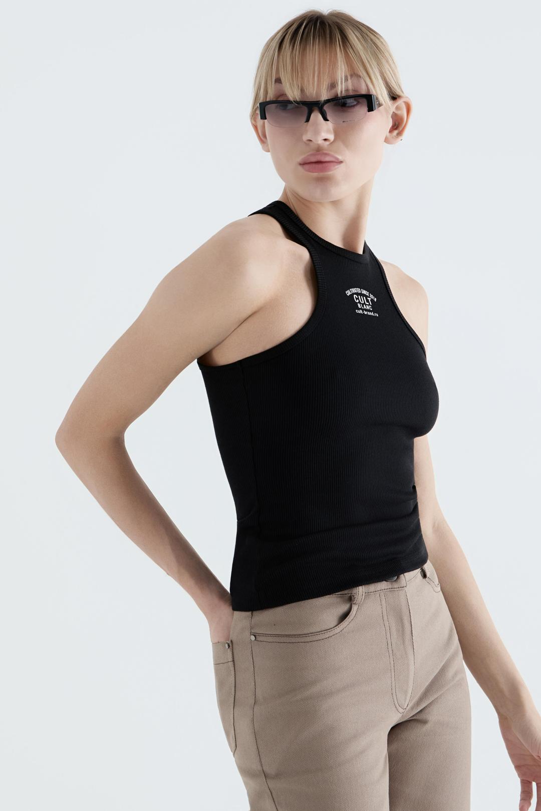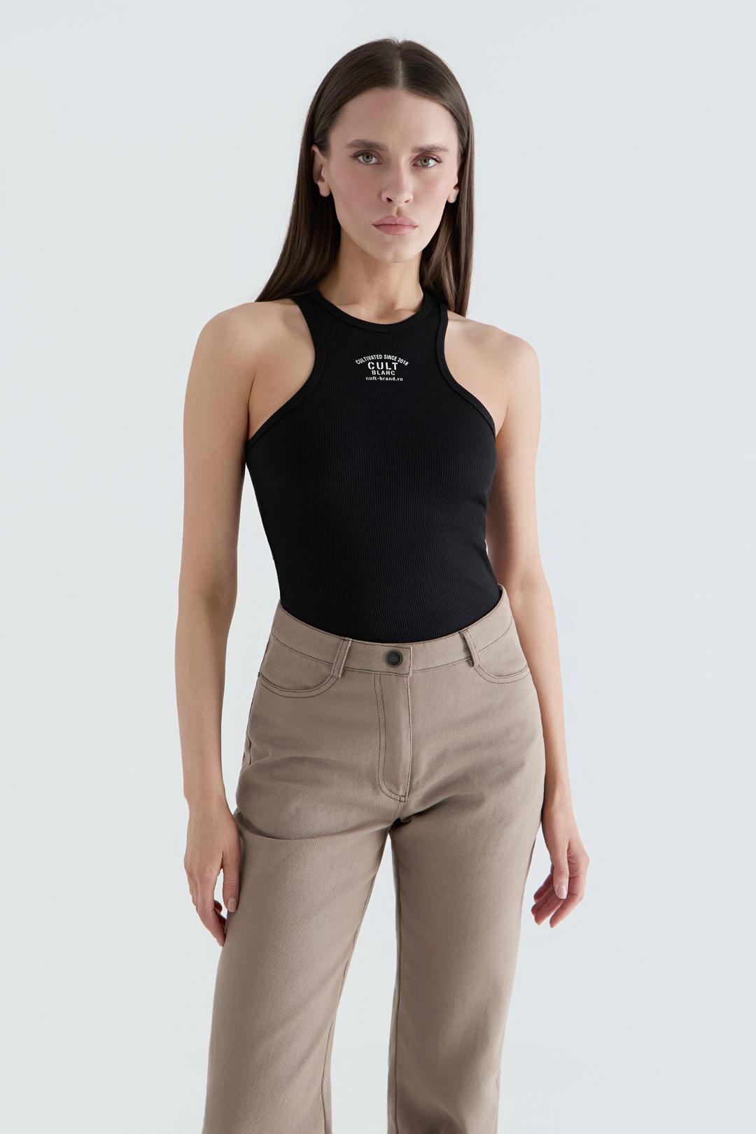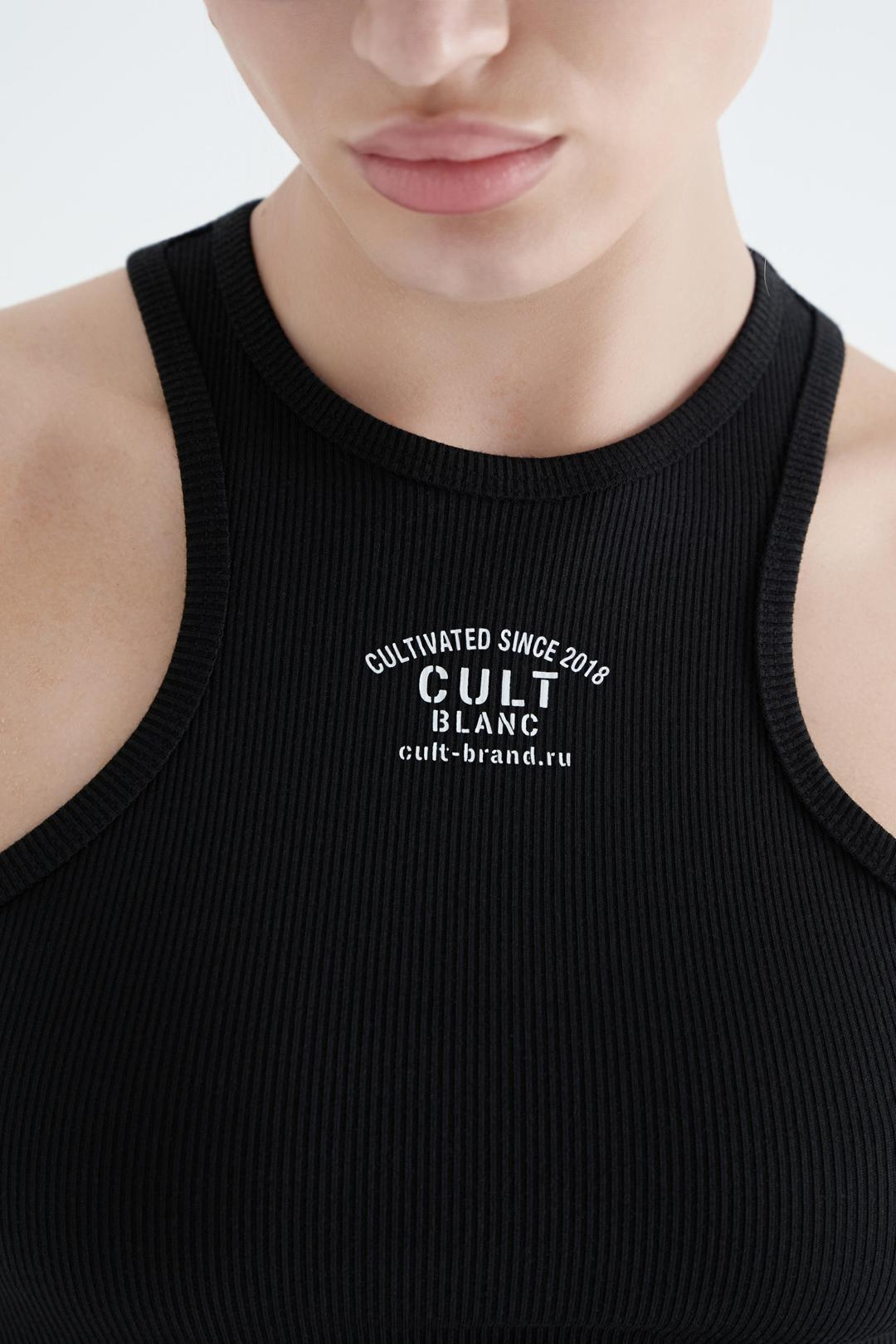 Майка женская из трикотажного полотна "лапша". Горловина и проймы обработаны окантовкой. На переде расположен принт с логотипом бренда.
