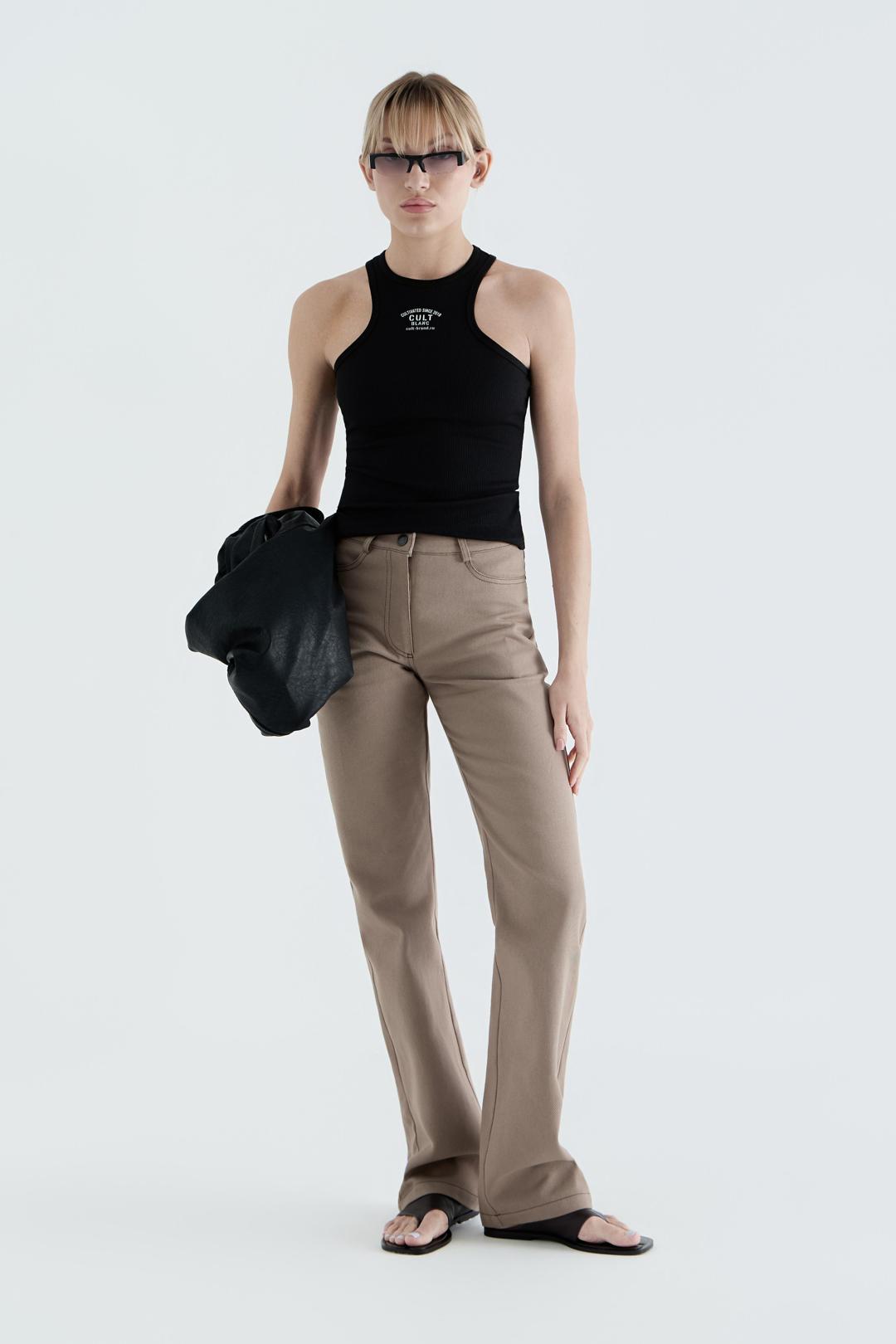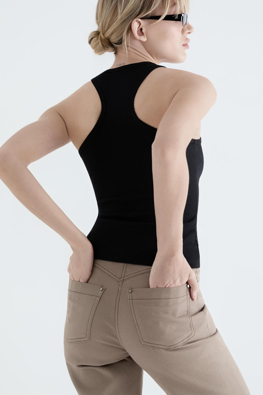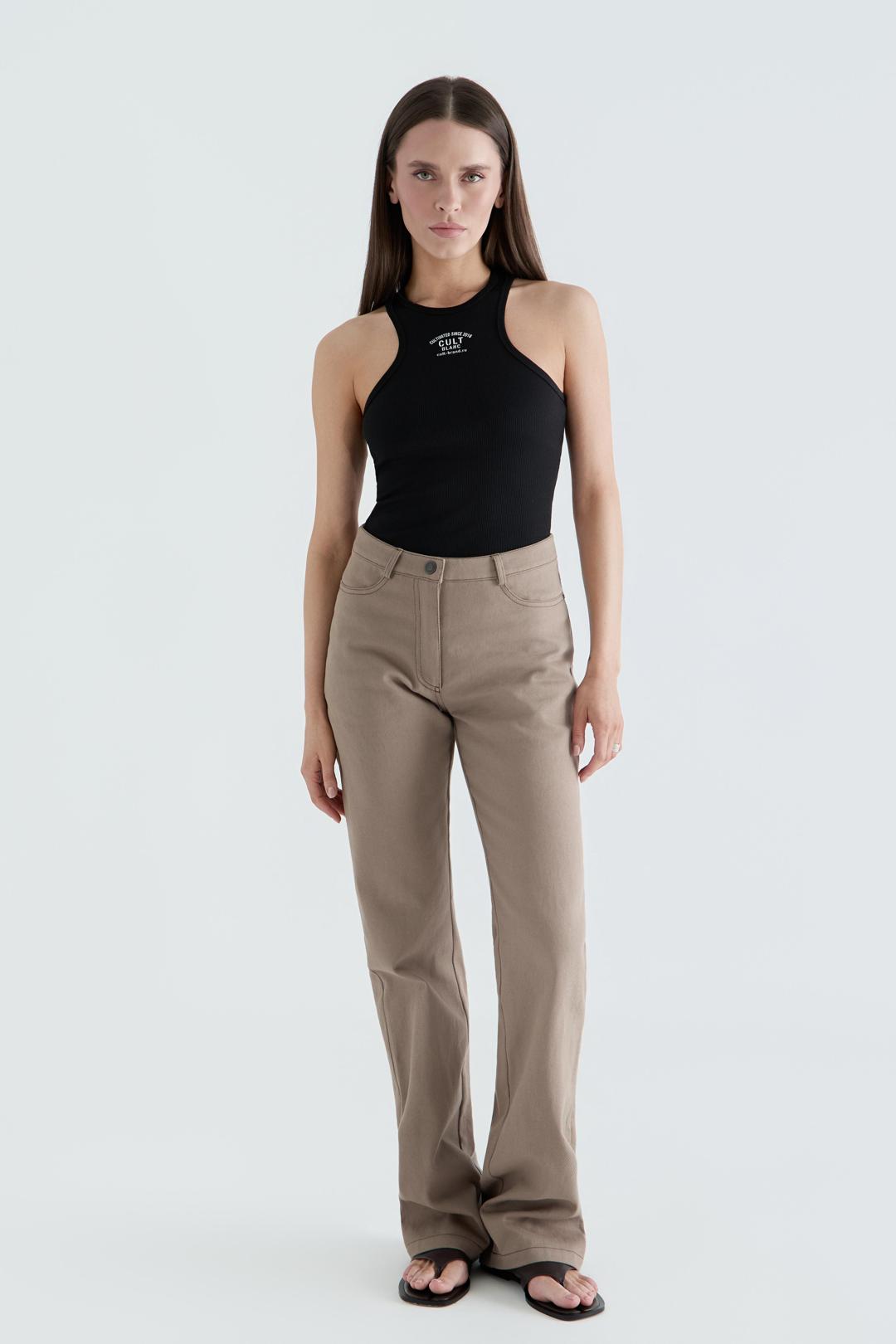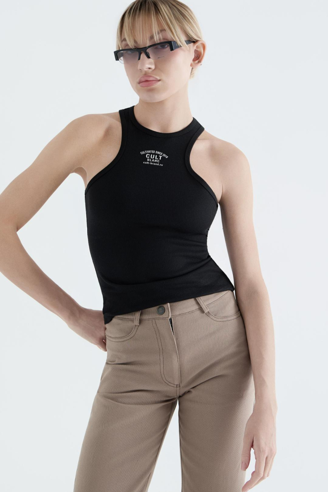 Майка женская из трикотажного полотна "лапша". Горловина и проймы обработаны окантовкой. На переде расположен принт с логотипом бренда.