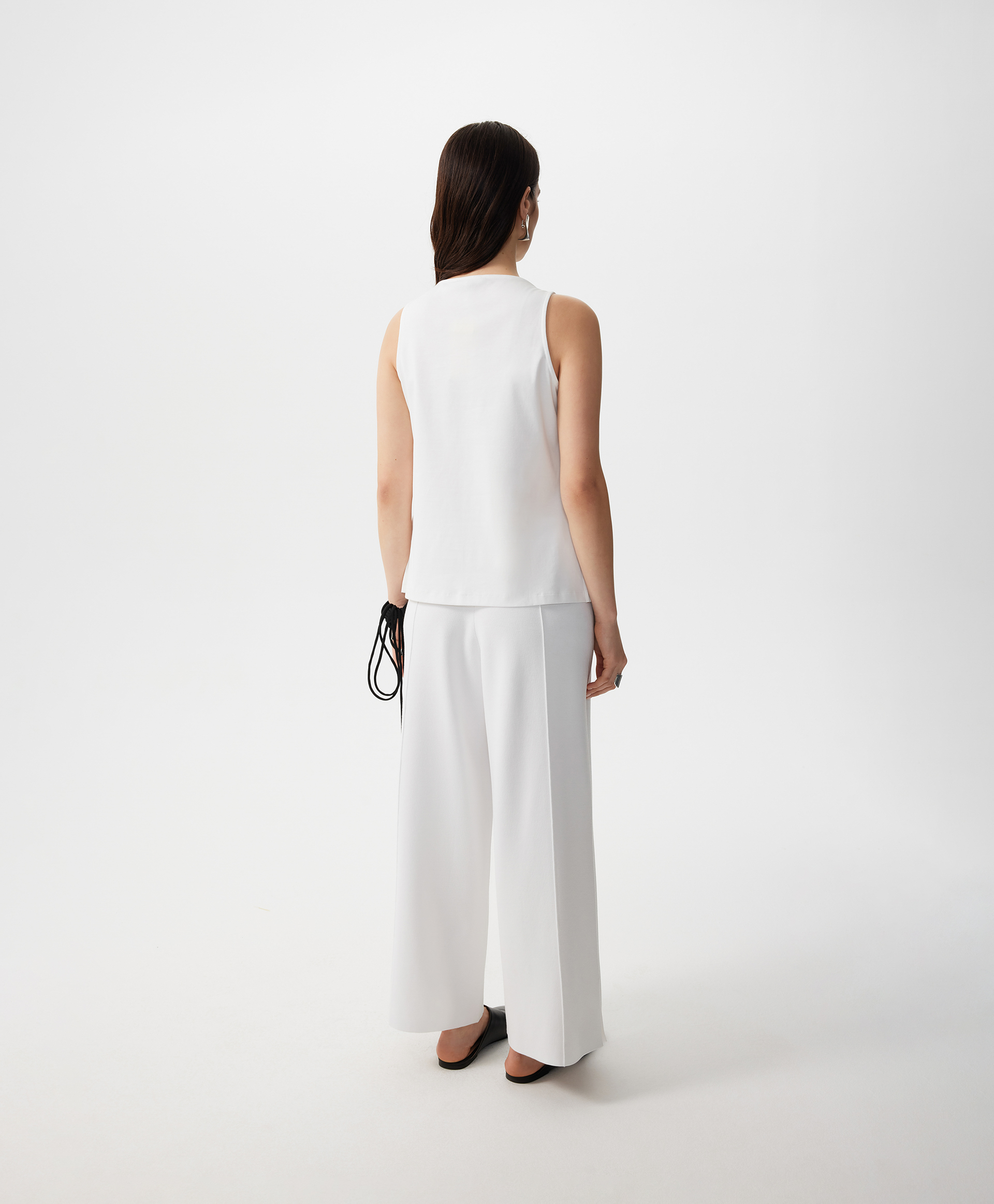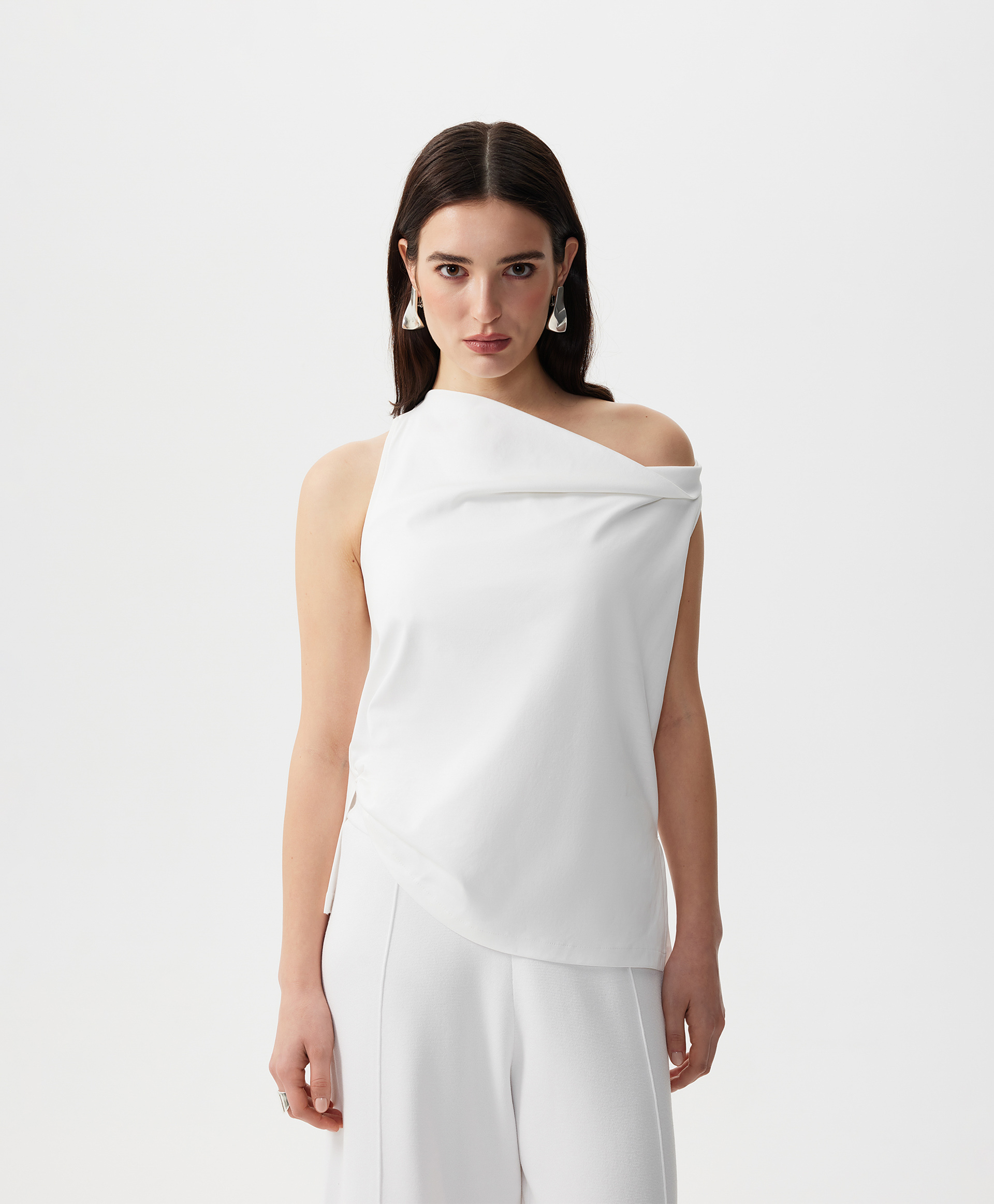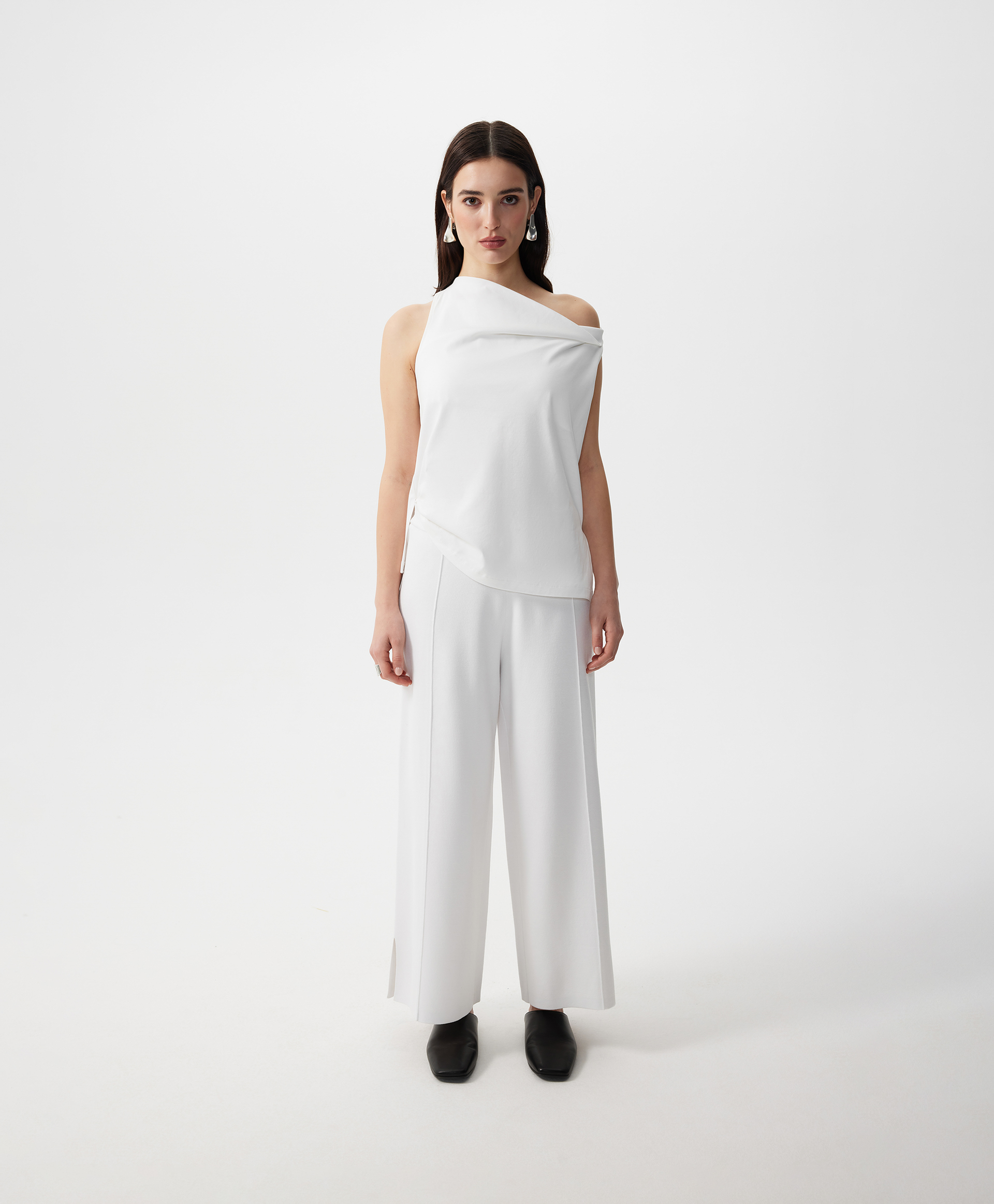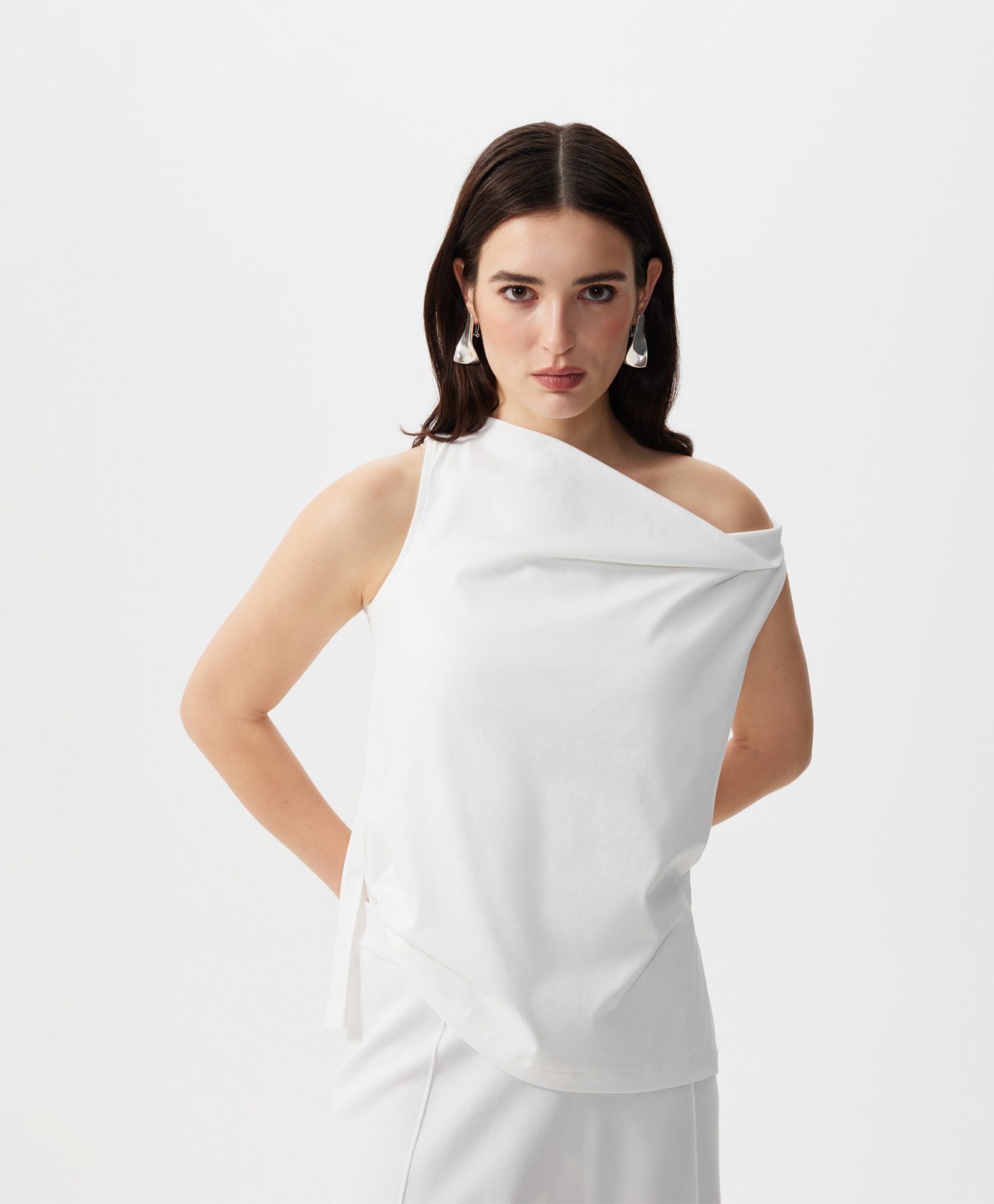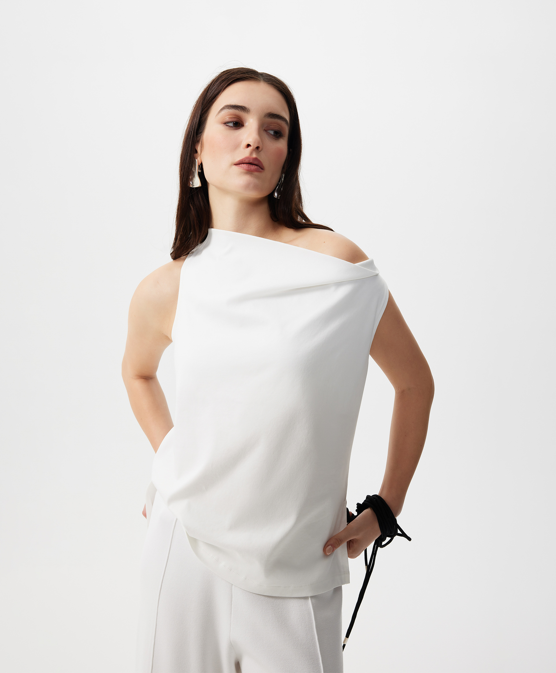 Стильный трикотажный топ полуприлегающего силуэта - прекрасный вариант для жаркой погоды. Хлопковый интерлок обладает гладкой шелковистой поверхностью, прекрасно держит форму, мягок, пластичен, воздухопроницаем. Форма горловины - качели, образующая свободную драпировку в области декольте, придает модели женственность и нежность. Такой крой красиво обнажает ключицы, зрительно вытягивает шею, делает женщину хрупкой и утонченной. Топ имеет разрезы в боковых швах.