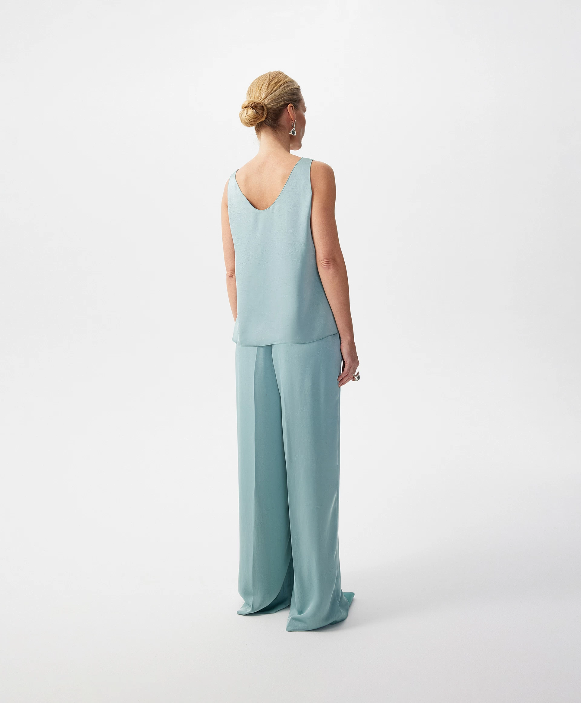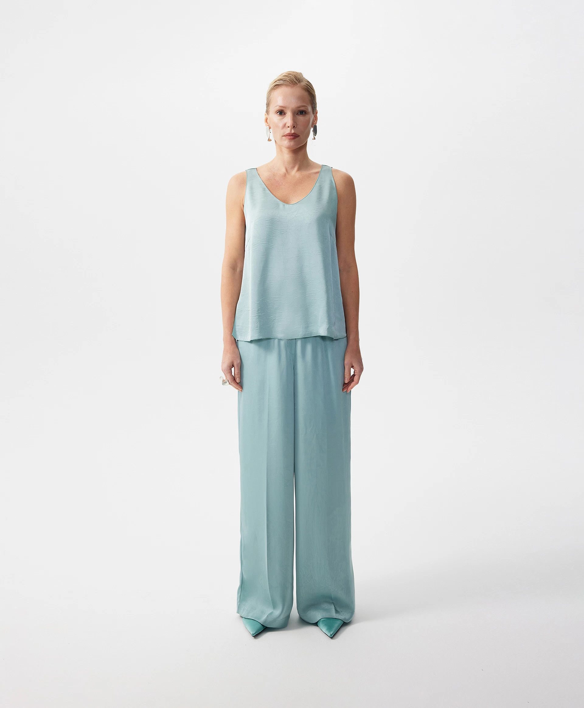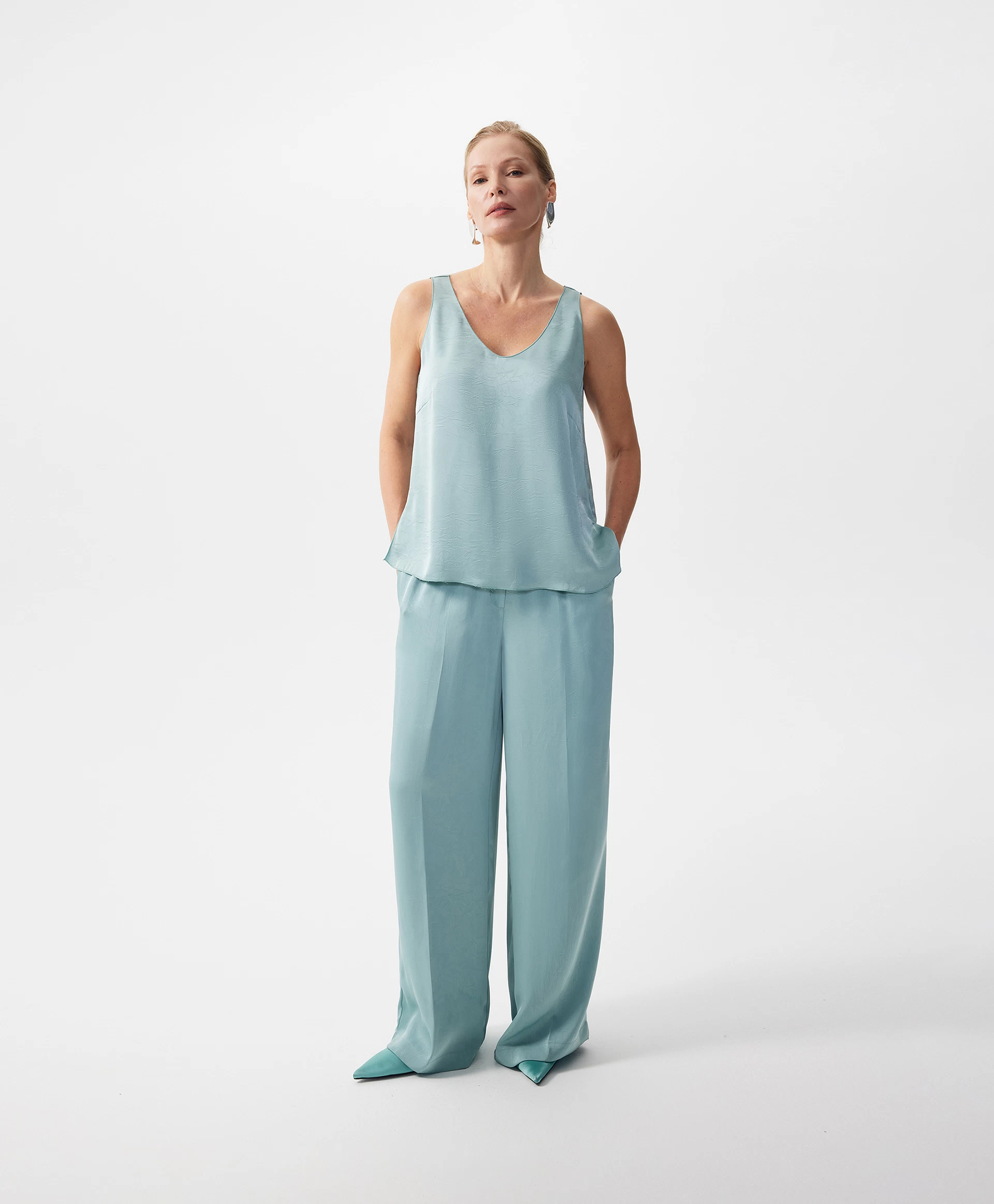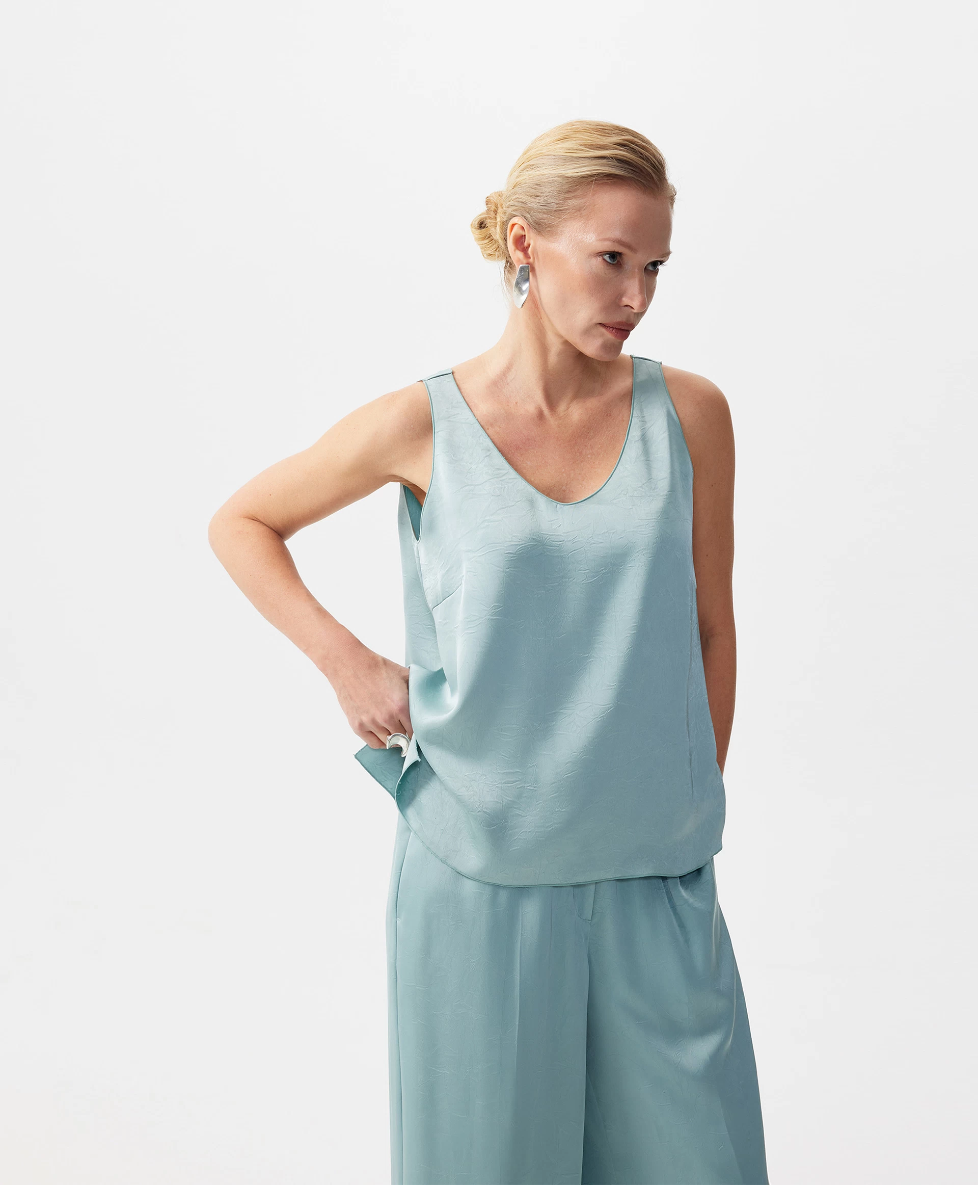Топ из шелковистого текстиля - основа летнего гардероба женщины! И как нейтральный первый слой в сочетании с пиджаком, кардиганом, жакетом, и как элегантное самостоятельное изделие - с брюками палаццо, юбкой, джинсами, лаконичный топ - прекрасное решение в концепции утро-день-вечер. Дымчатый эвкалиптовый оттенок из натуральной мятной палитры в сочетании с переливающимся текстилем, имеющим легкий крэш эффект, а также деликатная обработка всех срезов тончайшей микрообметкой придает изделию премиальный внешний вид, подчеркивает высокий уровень дизайна и исполнения.