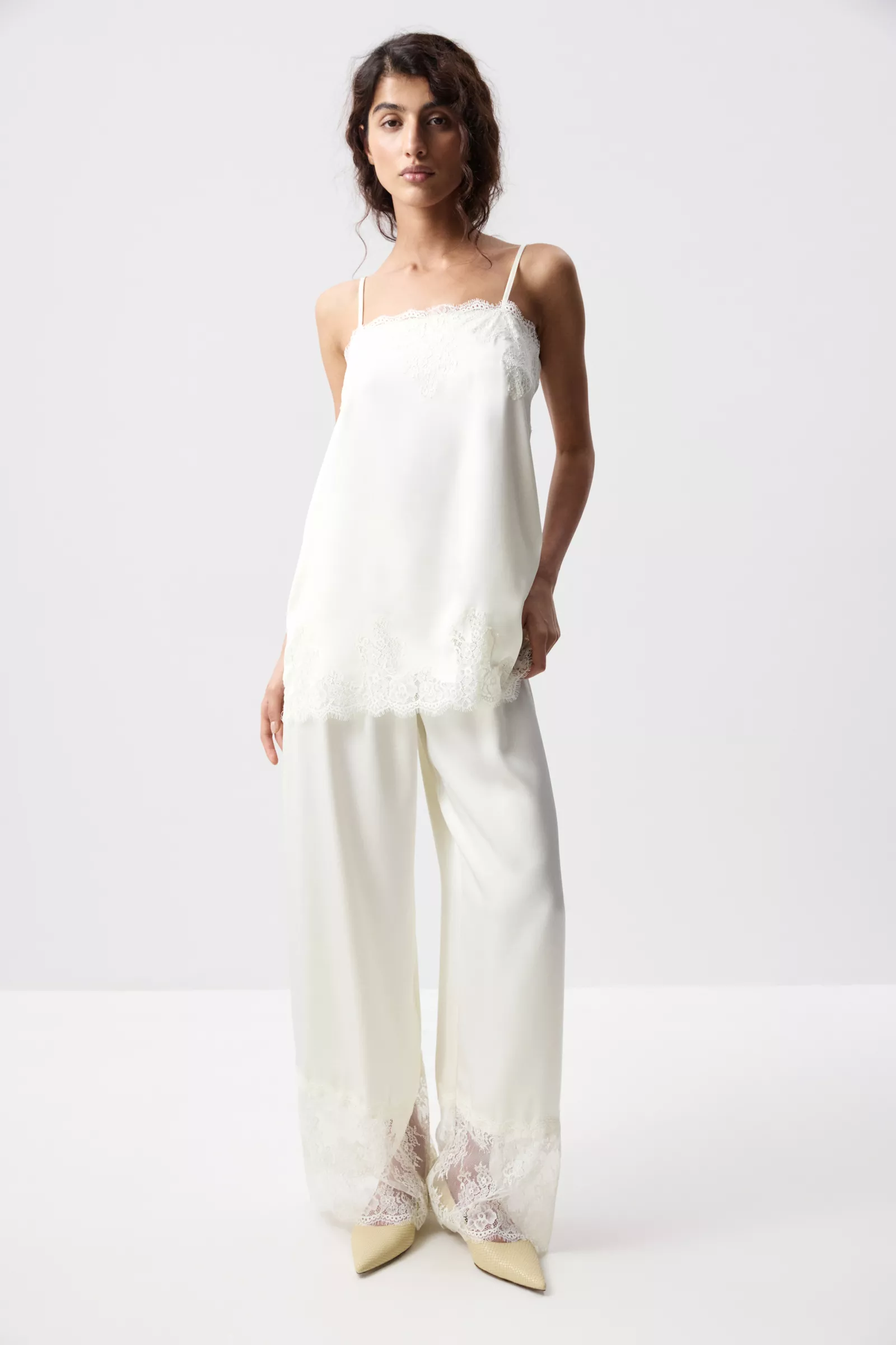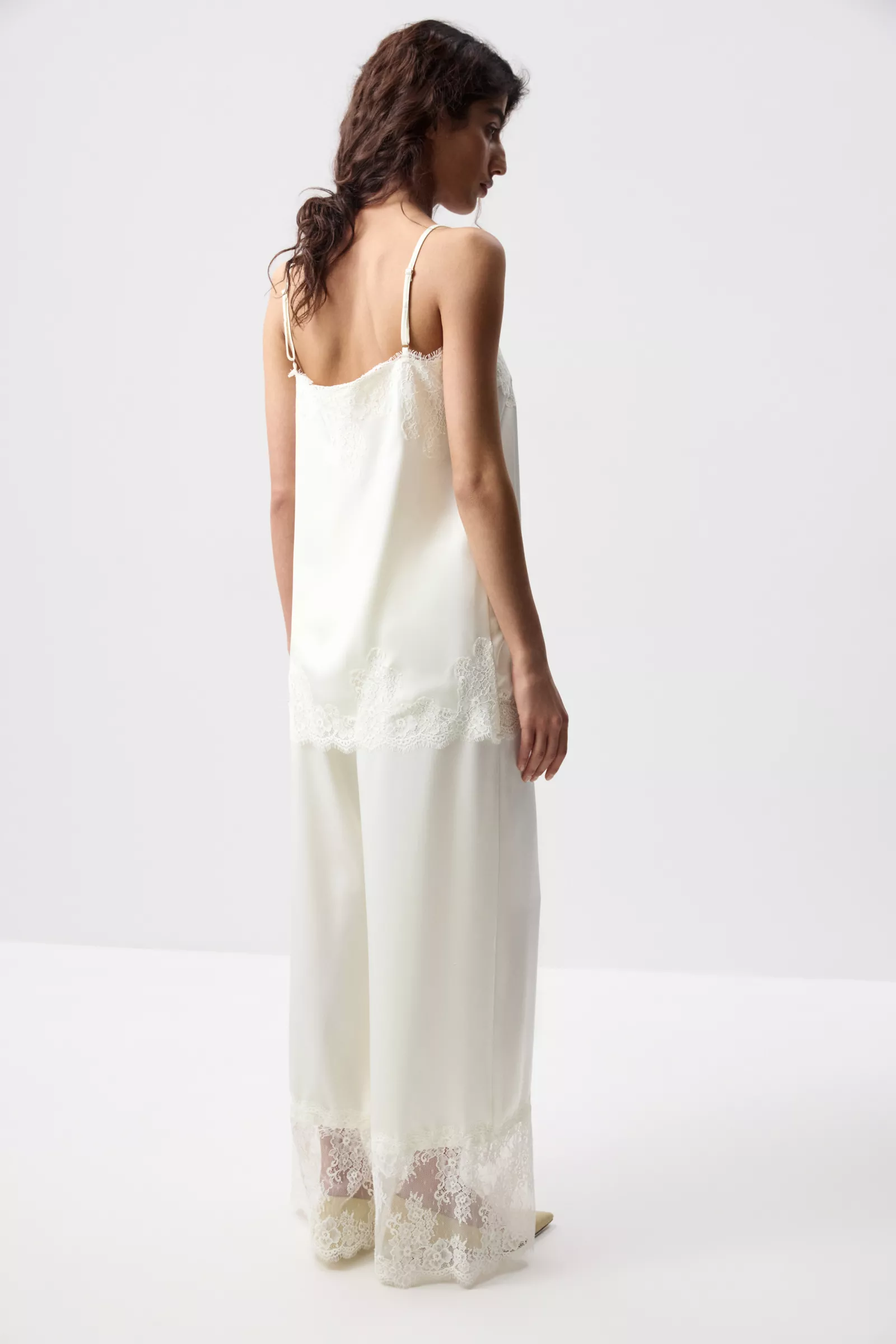 Сатиновый топ прямого силуэта на тонких бретелях. Кружевная фигурная отделка по верхнему краю и низу добавляет образу нежности и утончённости, делая модель более выразительной и женственной. Тонкие бретели подчёркивают линию плеч и придают лёгкость всему образу.