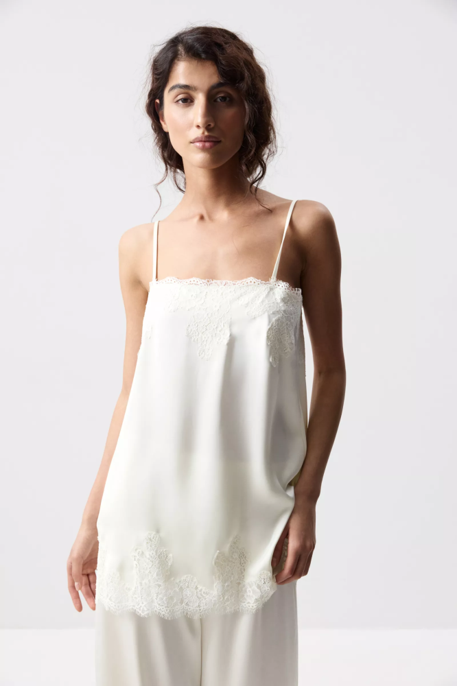 Благодаря прямому крою, длине и регуляторам на бретелях, топ можно носить не только как топ, но и как мини-платье — как самостоятельный элемент или в комплекте с брюками с кружевом из идентичной ткани. Идеальный вариант для перехода от расслабленного дня к вечернему выходу.