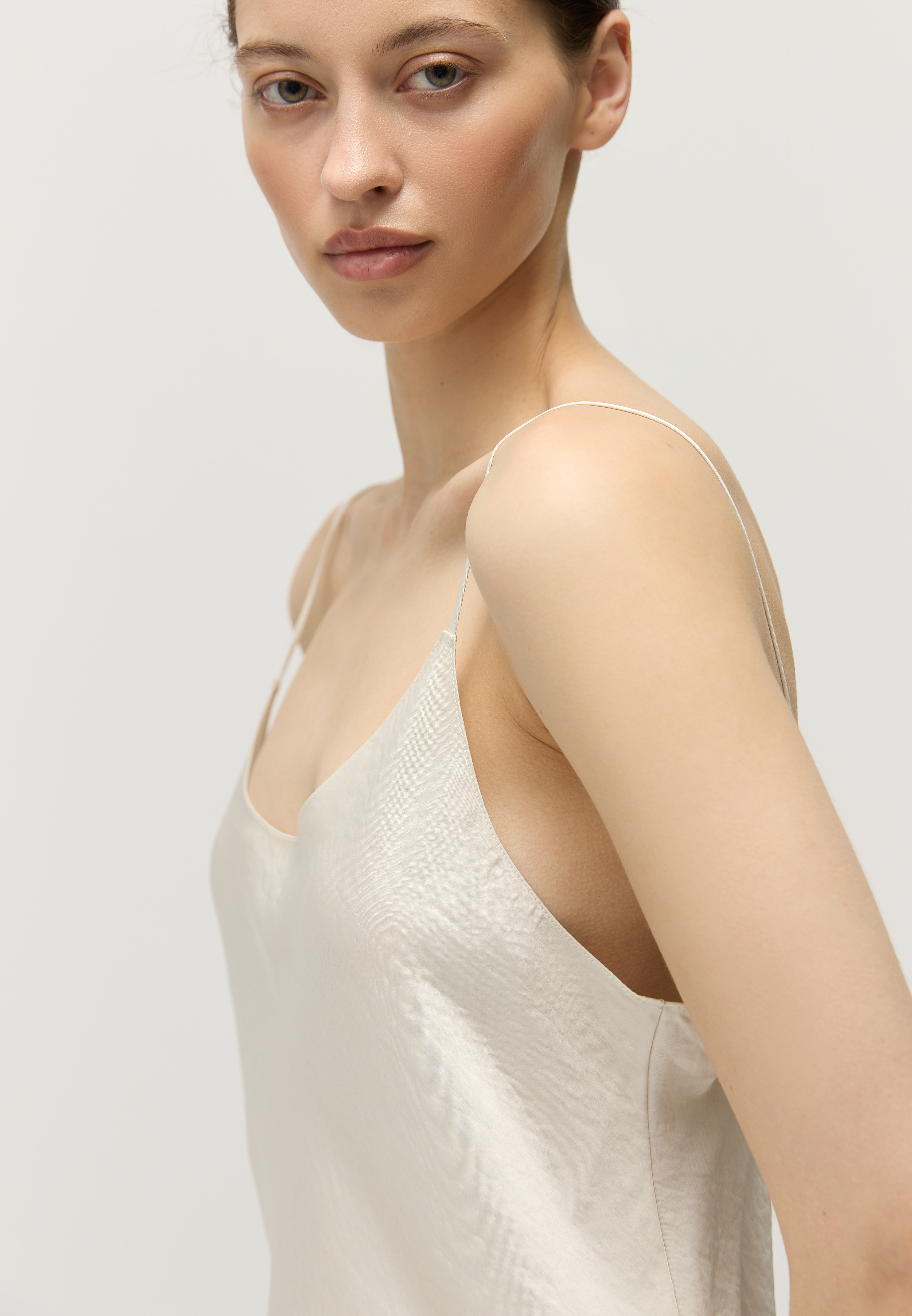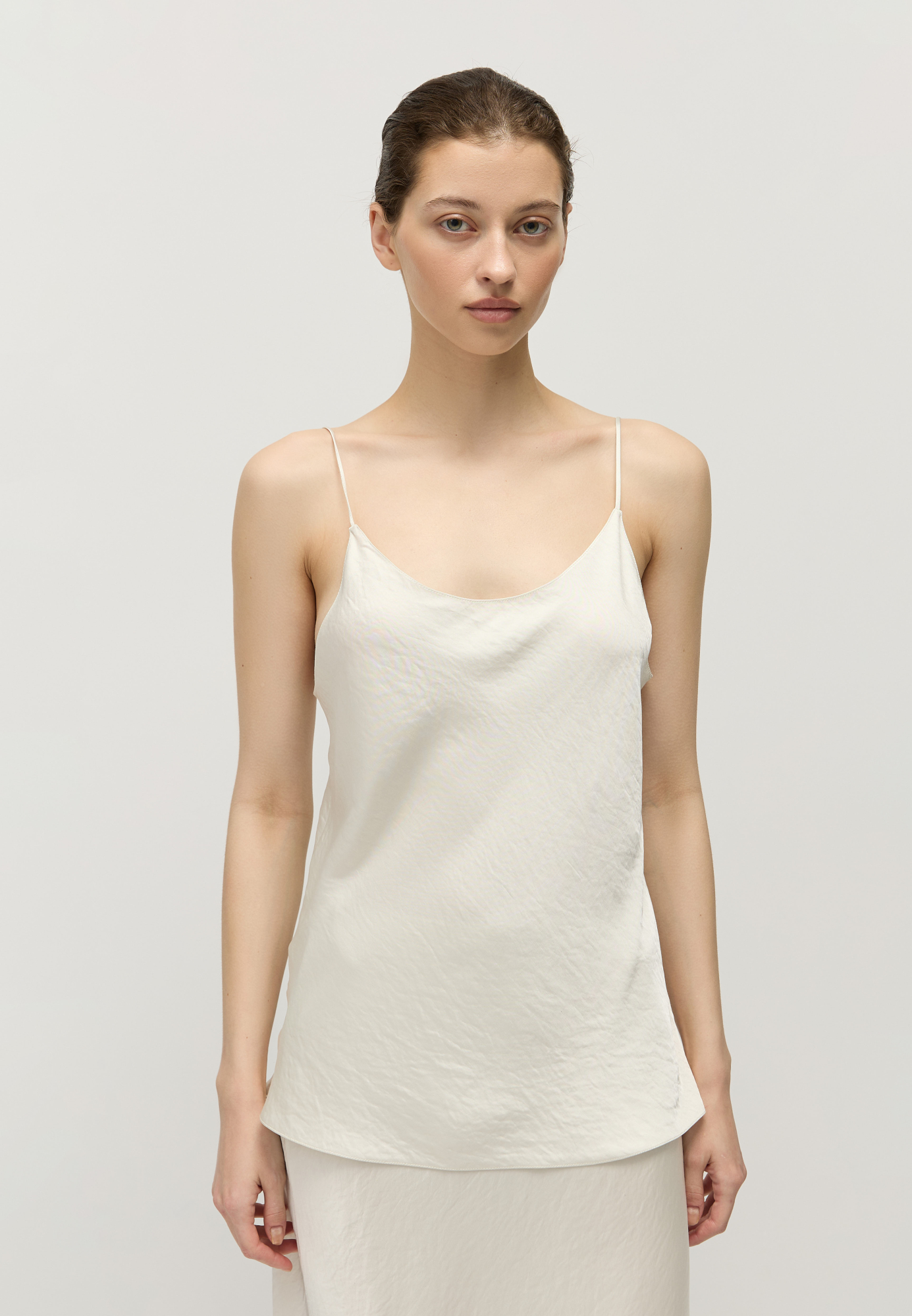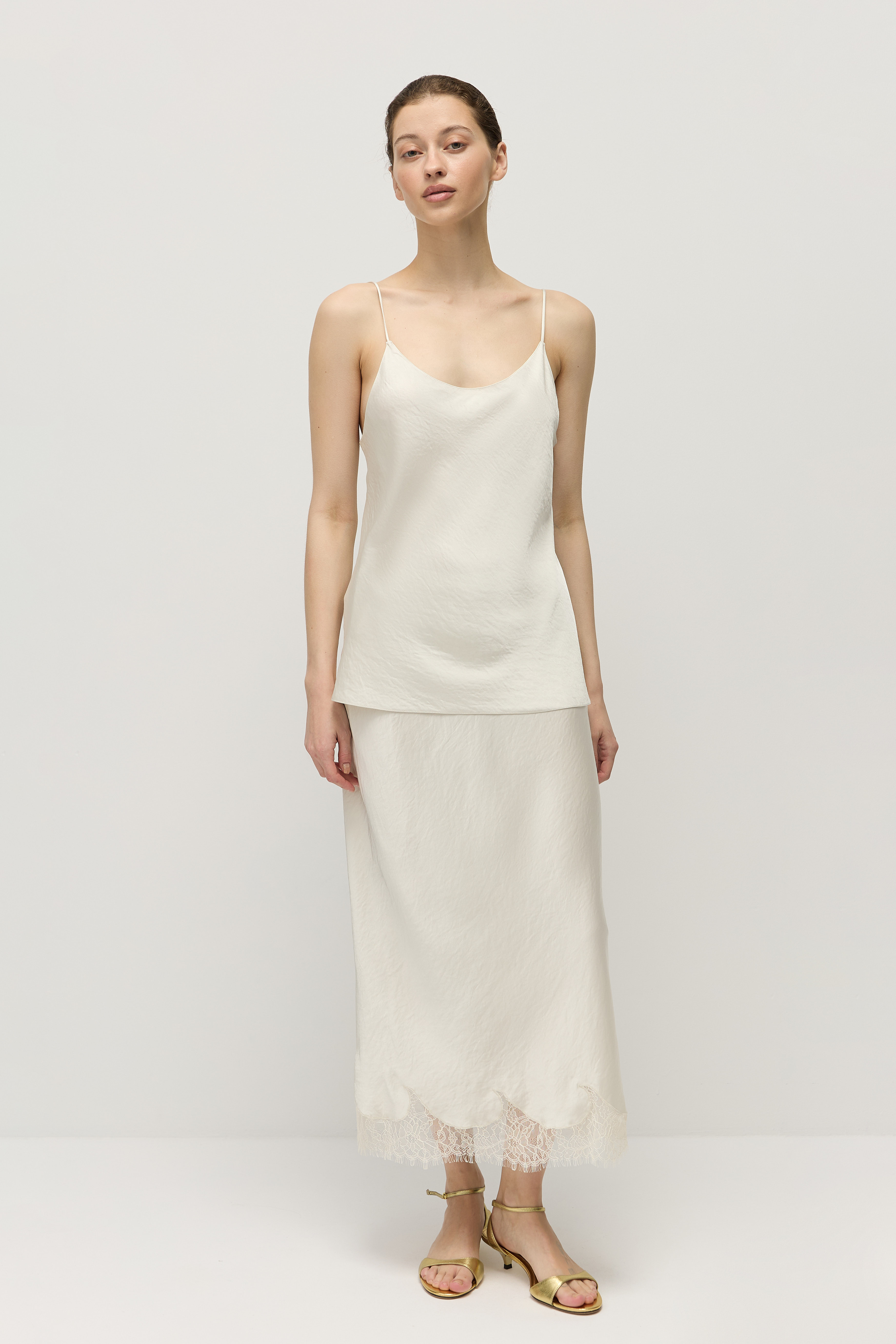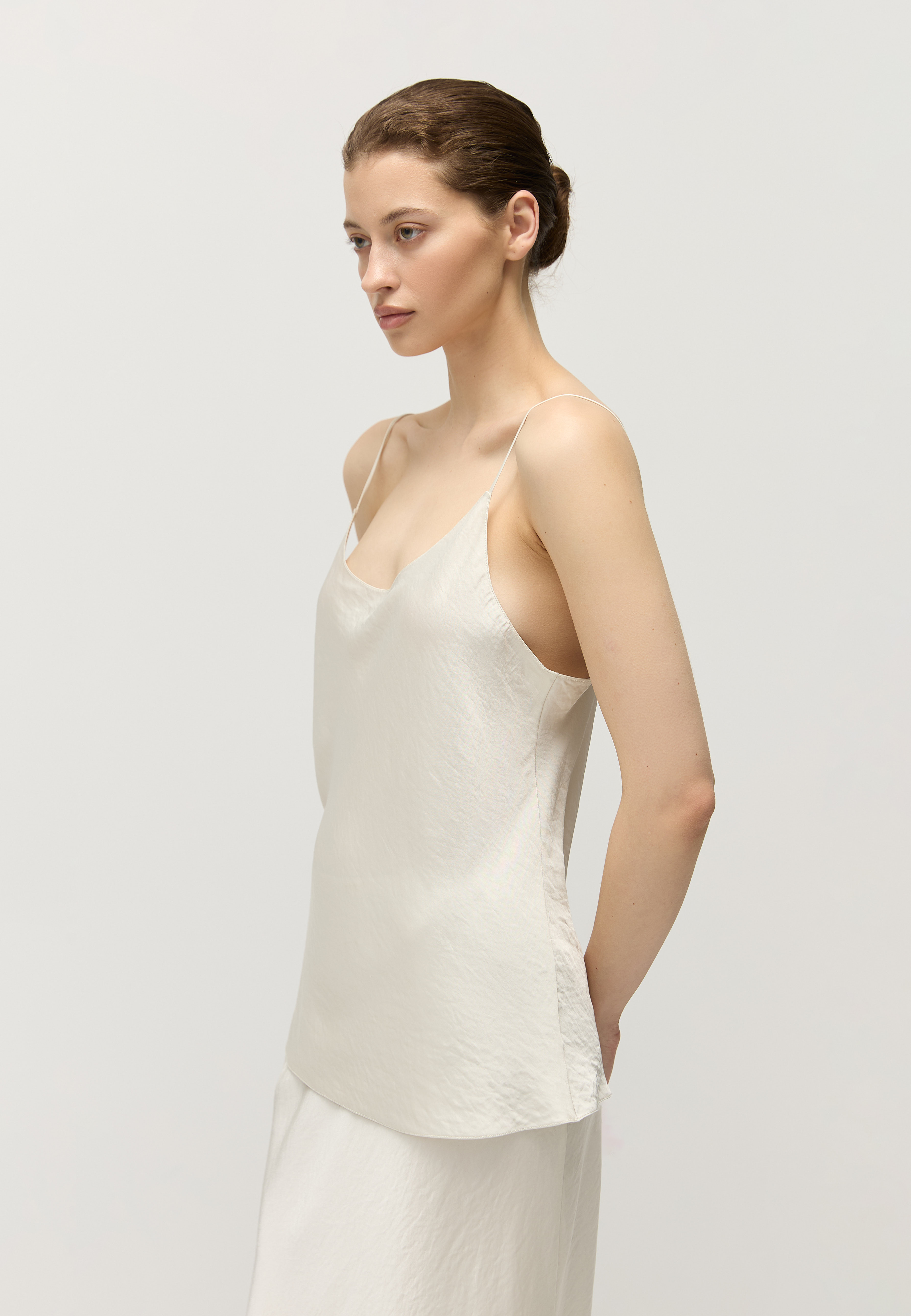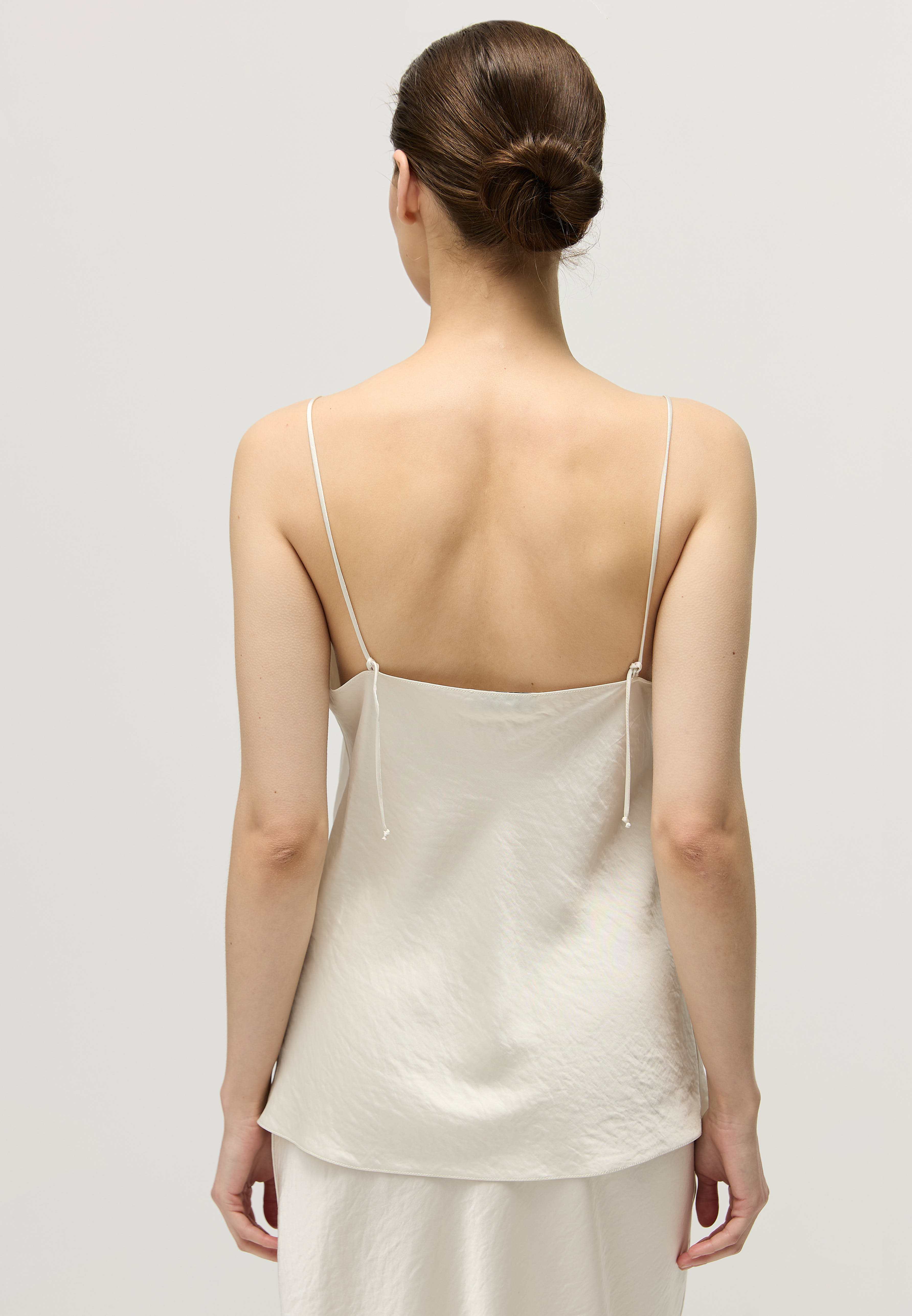 Топ в бельевом стиле сшит из тонкого атласа с матовым блеском — тонкого и нежного к коже материала.