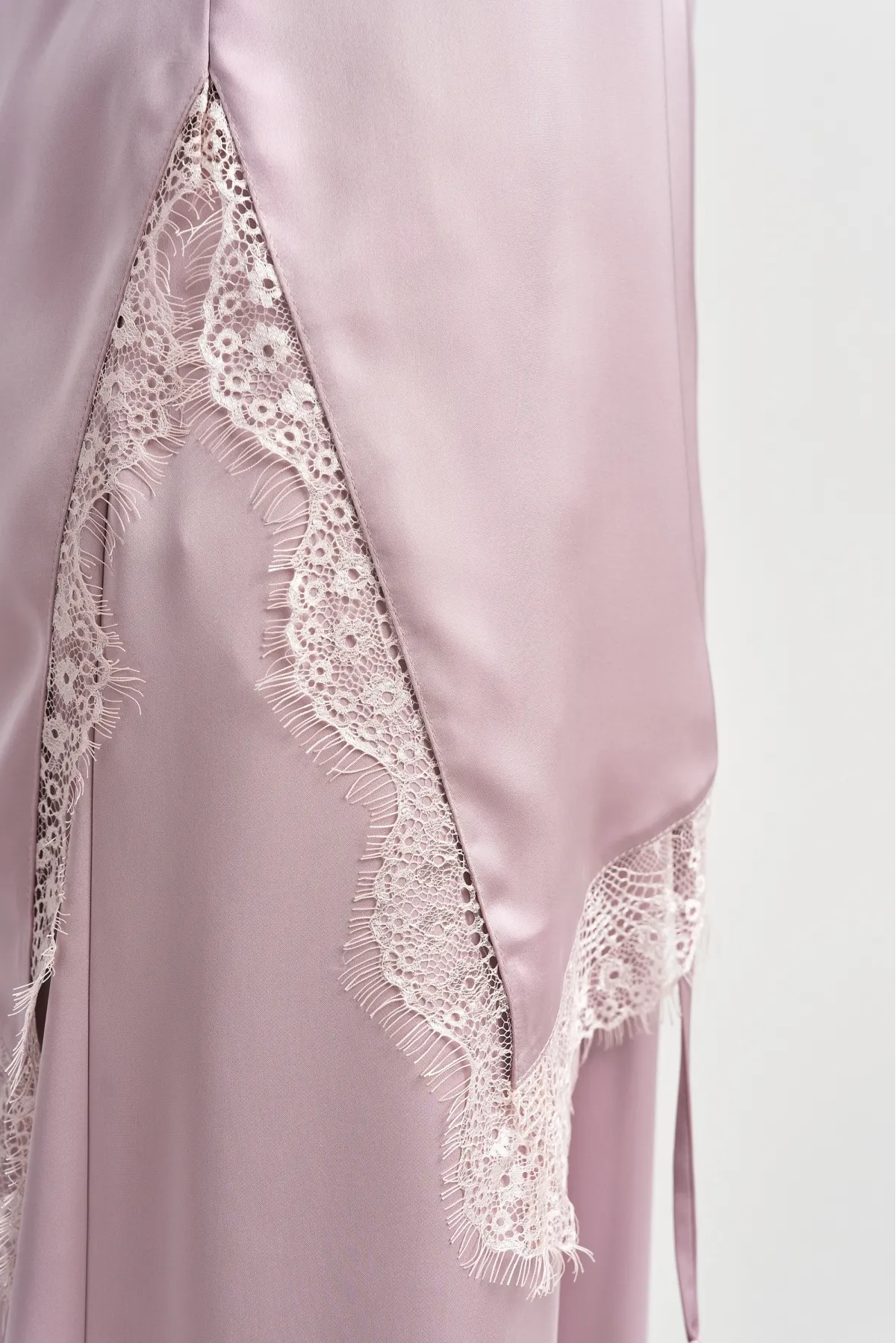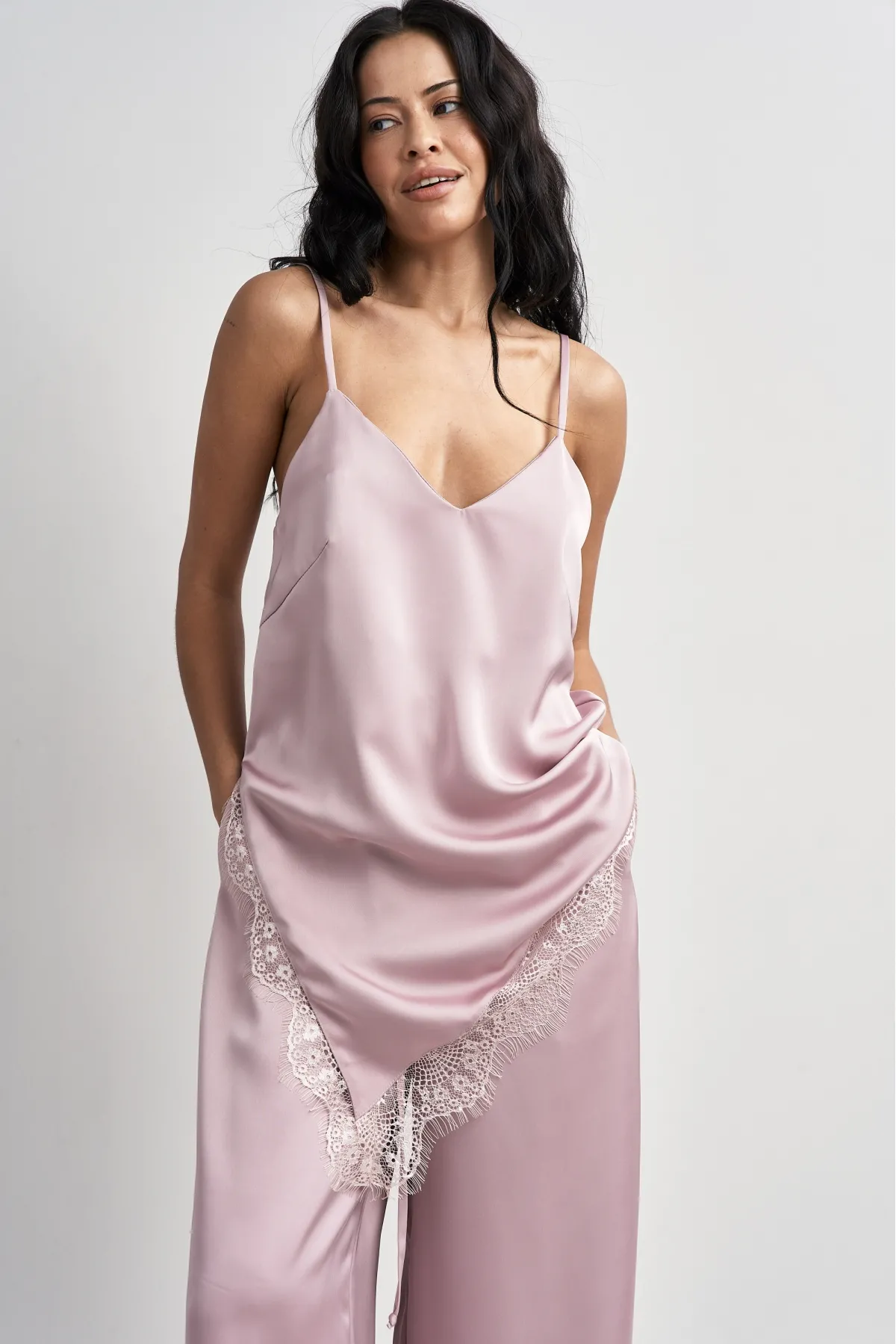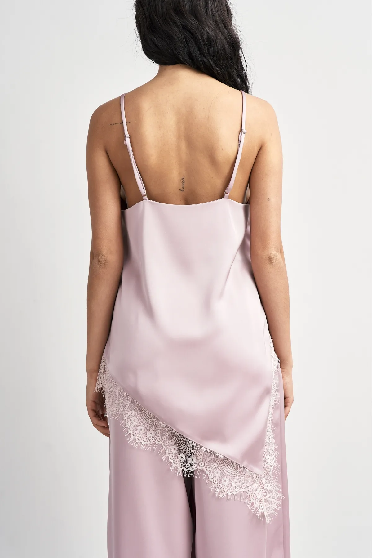 Лёгкий атласный топ с тонкими бретелями женственный и современный. Силуэт и асимметричный низ добавляют динамики, а контрастное кружево по низу делает образ более изысканным и нежным. Топ легко драпируется по телу, подчёркивает линию плеч и визуально удлиняет силуэт.