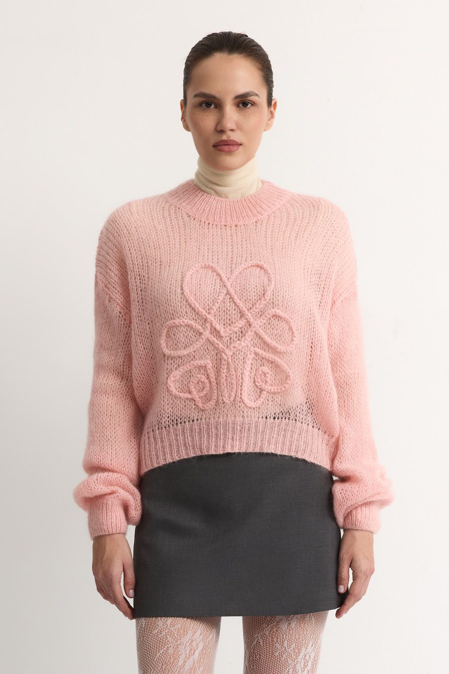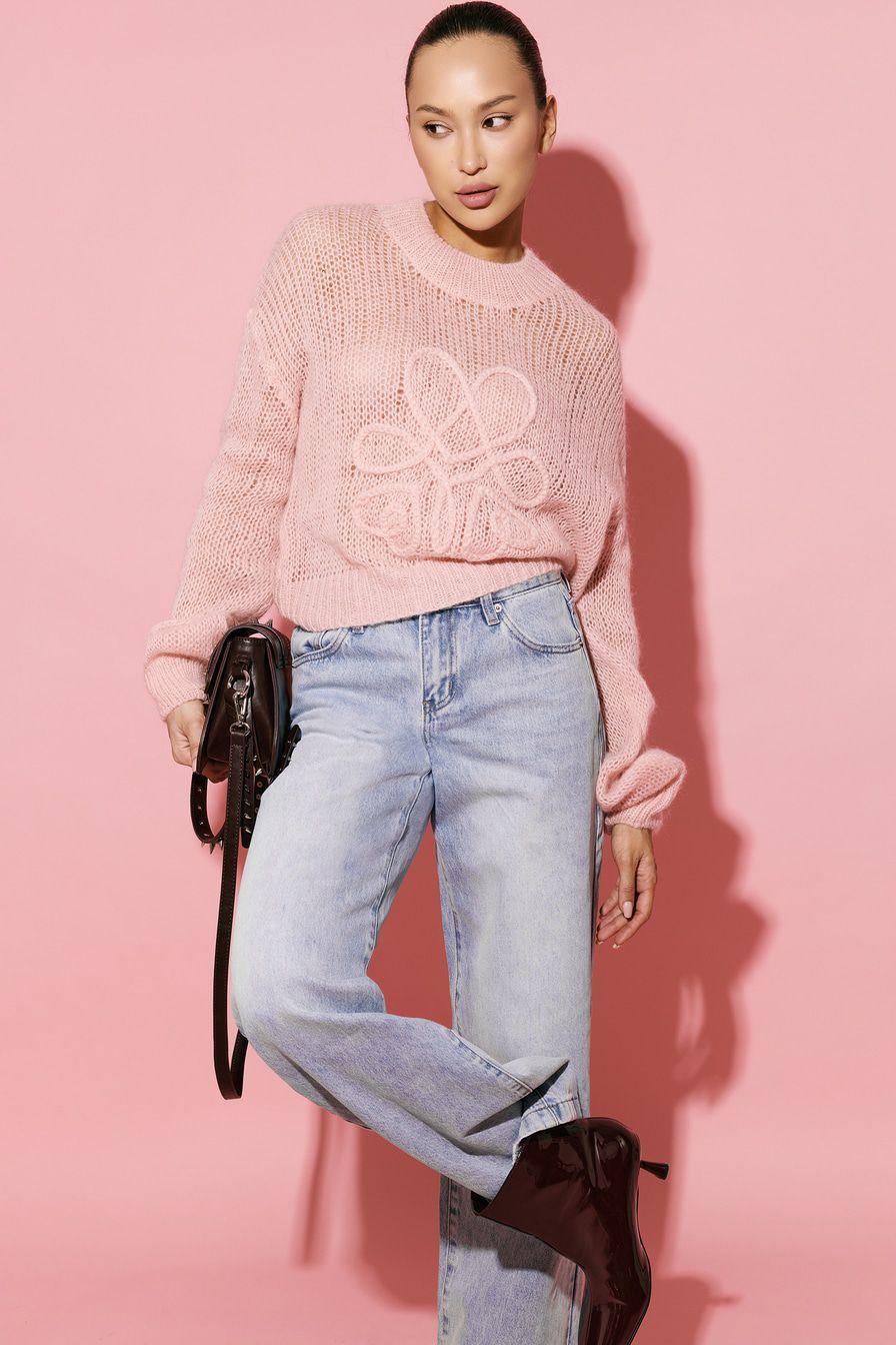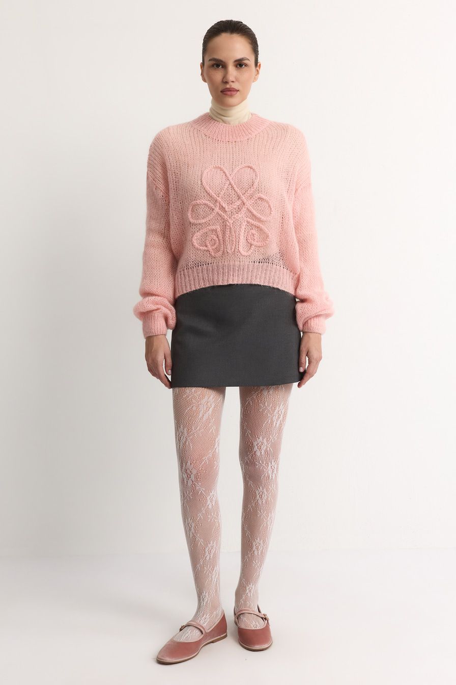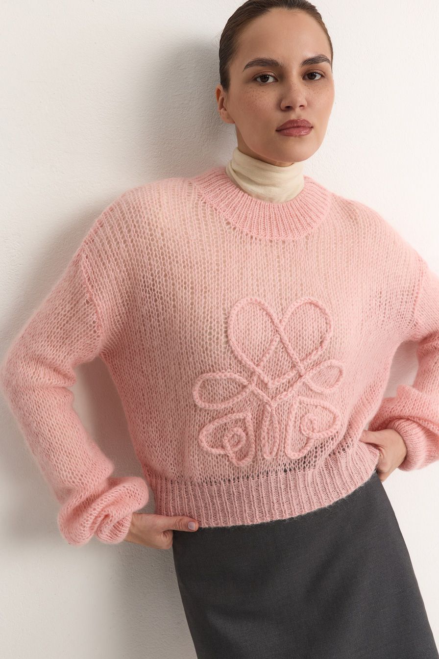 Слегка укороченный джемпер-паутинка свободного кроя выполнен из смесовой ткани с добавлением шерсти и мохера, декорирован фактурным узором.
